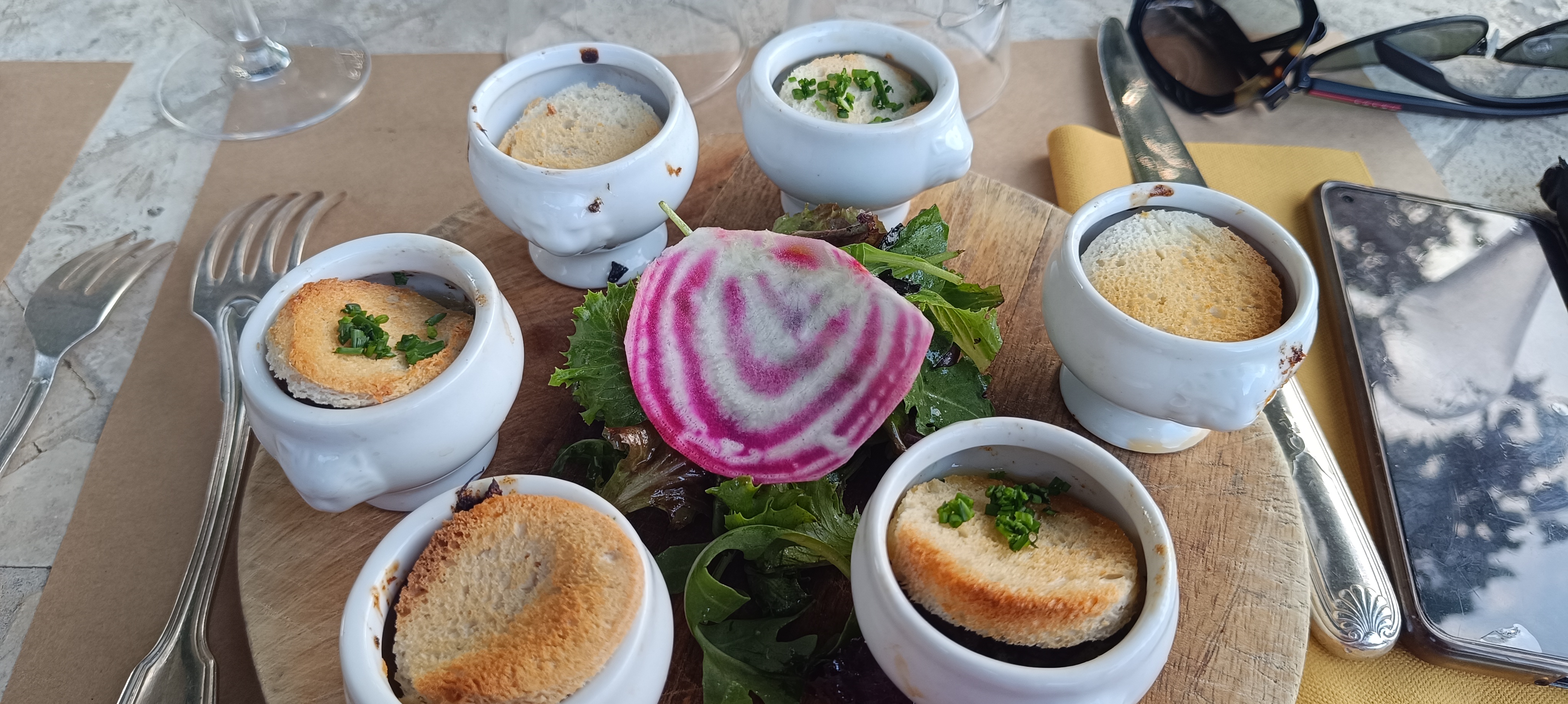 A une terrasse idyllique, un aperçu dans la cuisine me rappelle mon école de cuisine classique. L'intérieur est juste sur place, ils sont vraiment professionnels, et n'oubliez pas de câliner le vieux basset sur le trottoir à côté de l'entrée.