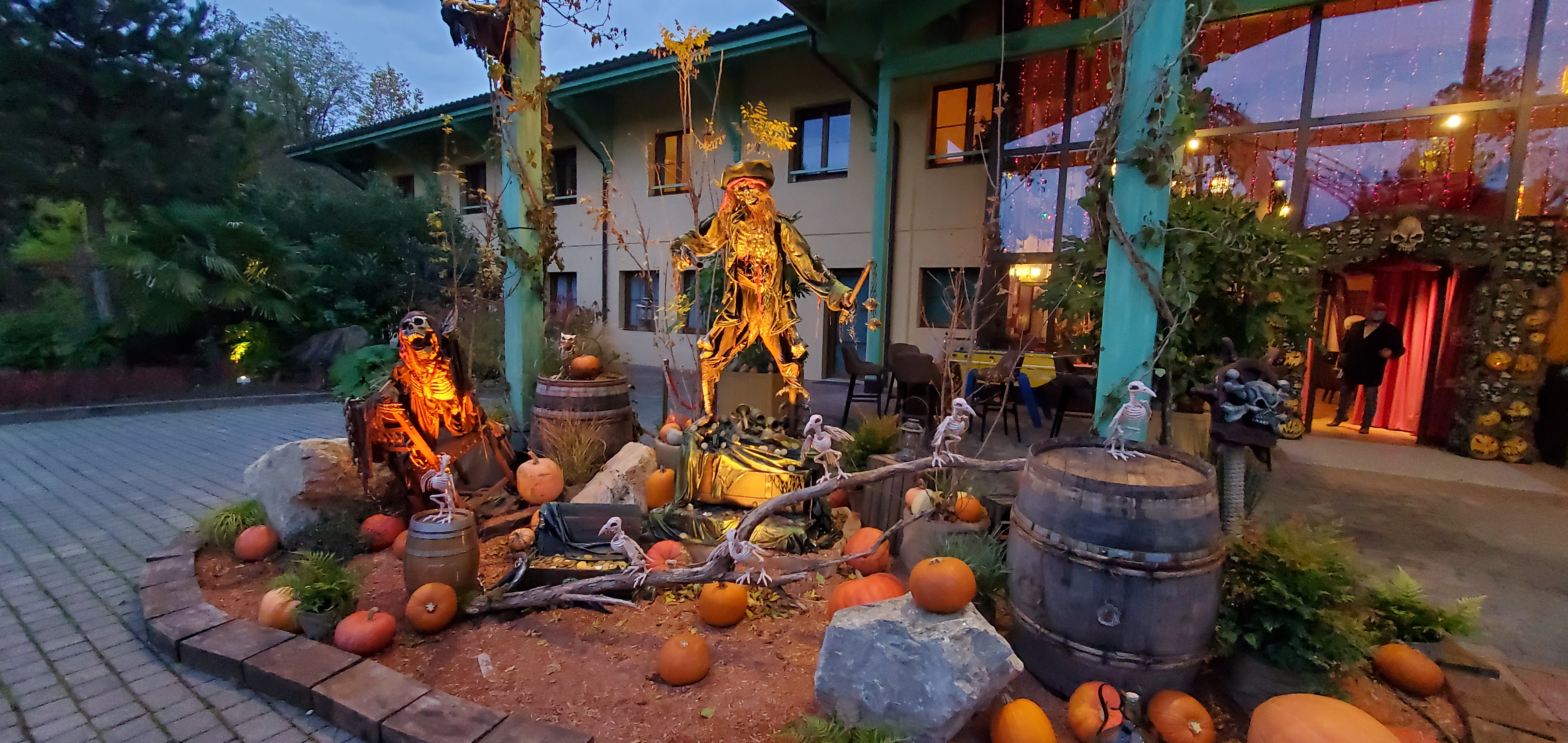 Située juste à côté de Nigloland, l'hôtel ne paie pas de mine au premier abord mais flatte déjà la rétine grâce à décoration Halloween vraiment marquée et superbe. Mon petit a été fasciné par le pirate qui se déplace à l'intérieur suspendu à une corde et un couteau à la bouche. Sans oublier l'énorme bateau de pirates qui fait office de bar. Génial. L'accueil a été serviable et respectueux. Les chambres sont assez grandes, la poussière aurait juste dû être fait un peu plus attentivement (les étagères hautes). Pour le petit déjeuner et le dîner, un restaurant est disponible et propose un buffet de bonne qualité que ce soit au petit déj' ou au dîner. Mention spéciale à l'attention portée pour les respects sanitaires liées au Covid-19. Bref, un lieu parfait si on envisage de faire le parc Nigloland.