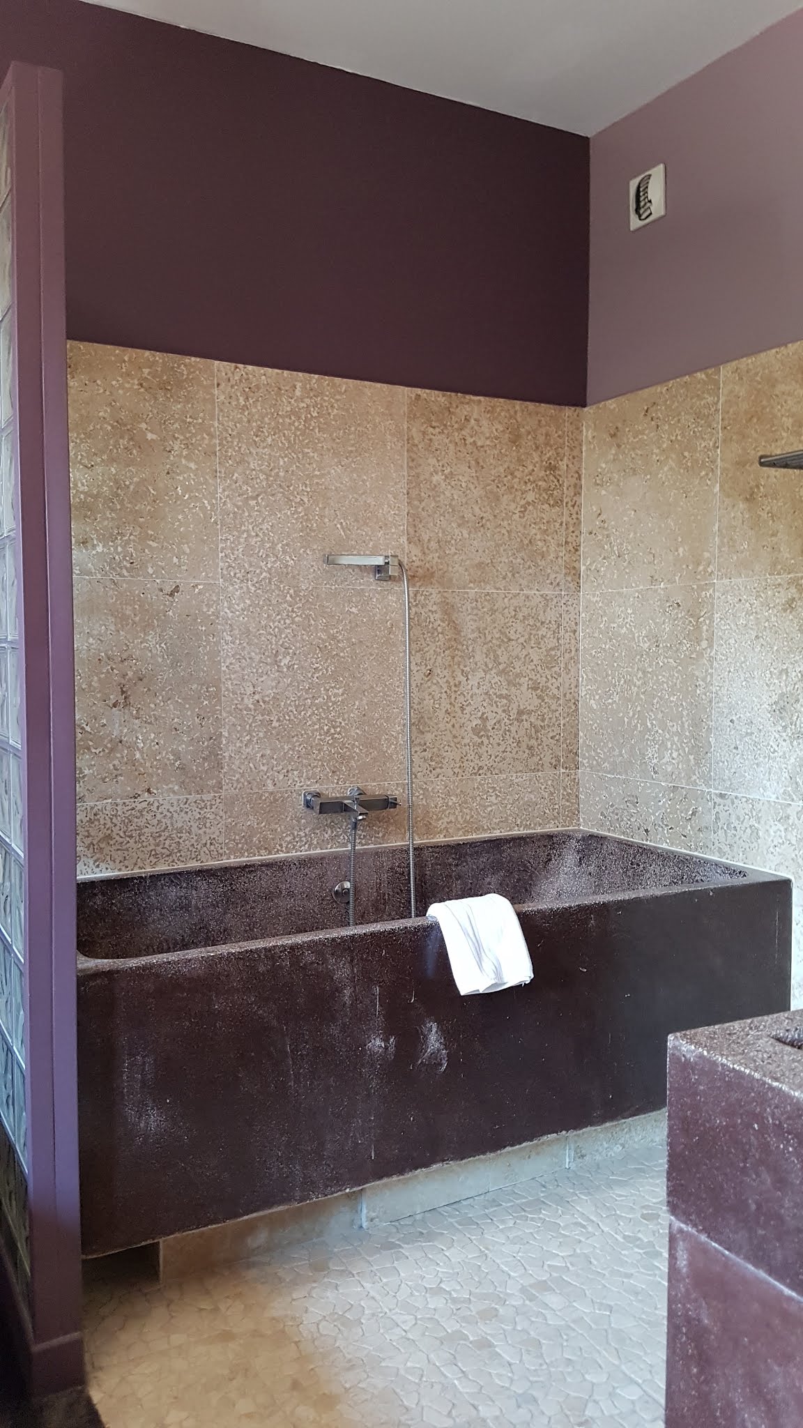 La disposition de la chambre est originale. Quand vous ouvrez la porte de votre chambre, vous tombez directement sur la salle de bain. Le style se veut rustique et fait penser aux bains des romains. La baignoire est énorme, c'est étonnant pour une région où l'eau n'est pas en surabondance. Le restaurant est gastronomique. C'est bon, mais c'est pas donné, comme on dit chez nous. Le matelas est excellent, et l'endroit est calme. Nous y avons bien dormi.