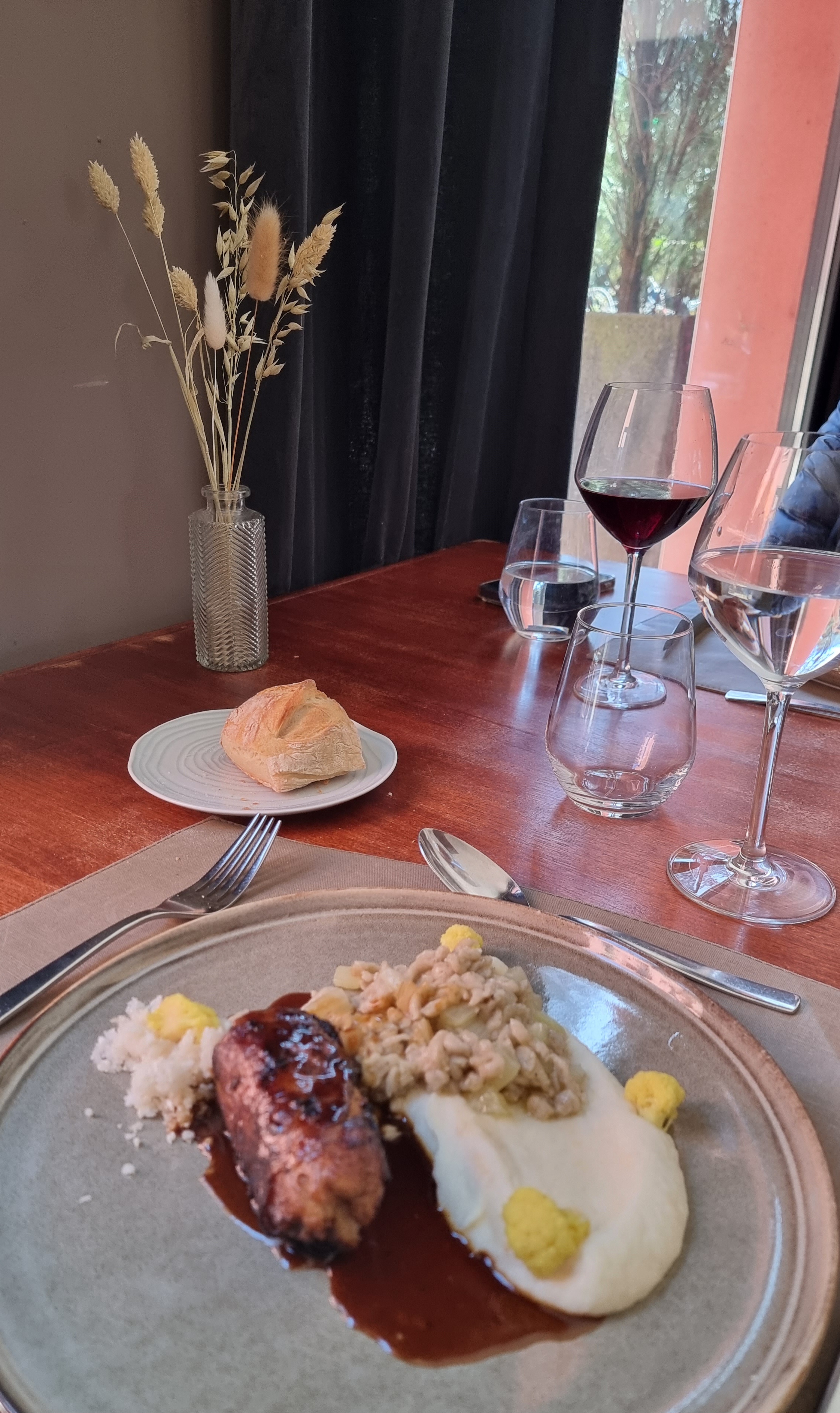 Tres perfectible pour un restaurant qui cite le Michelin Nous avons pris le repas gastro( un peu plus de 70€) avec les vins en accord des plats 7 plats annoncés dont l’amuse bouche en entrée . Plats globalement bons ( entrée, fromages et dessert) voir très bons ( poisson et viandes ) Vins très ordinaires . L’accompagnement est à 30€ par personne pour 4 verres ou 25€ pour 3 verres et il y a en fait 2 blancs et 2 rouges locaux assez quelconques . Service très moyen pour un gastro : les vins ne sont même pas présentés et le 4ème verre des rouges a été identique au 3ème verre précédent !!! Un chat se balade sur les tables et s’assoit a côté des assiettes C’est un bon restau mais pas plus
