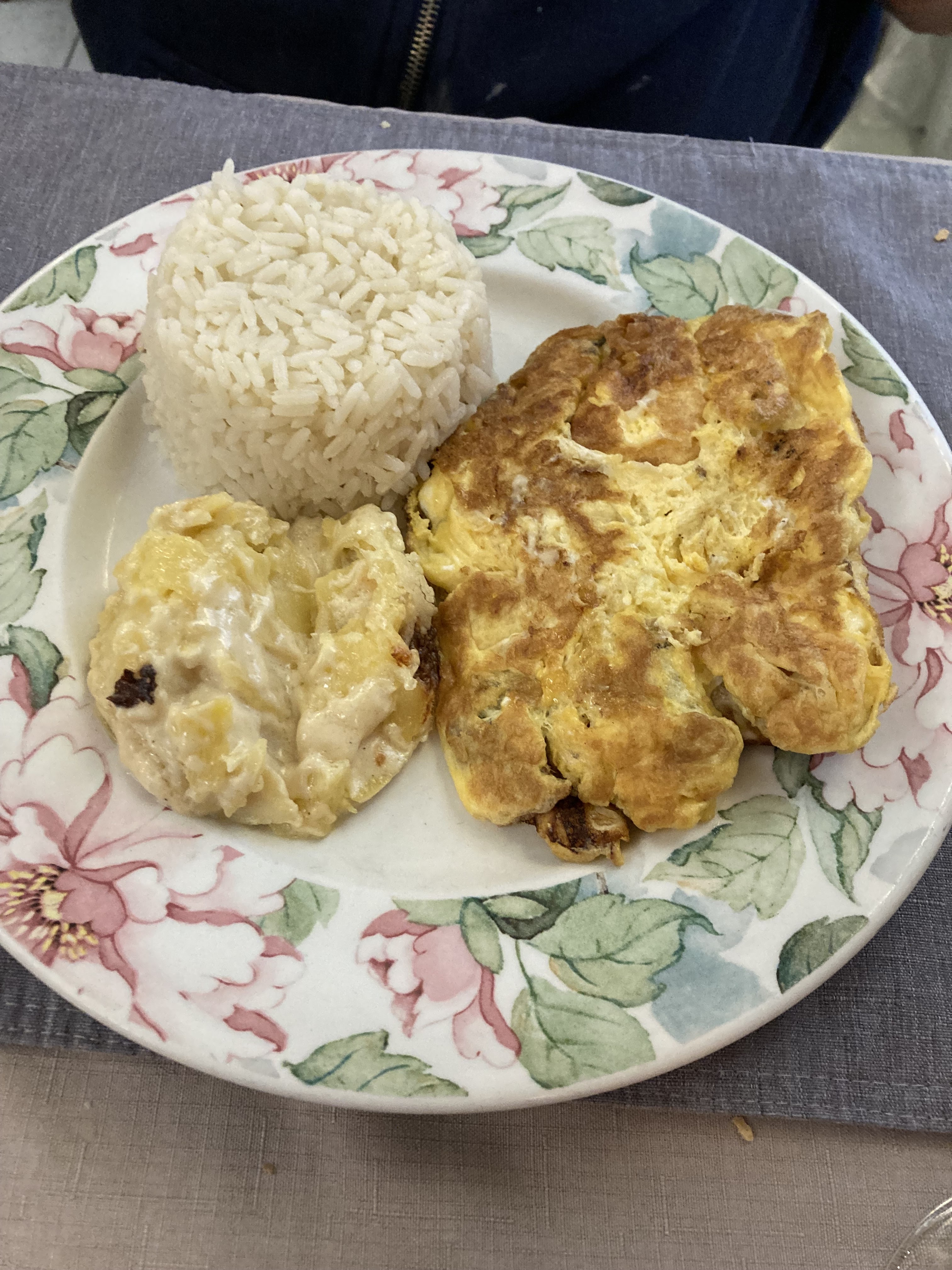 Déjeuner. Menu. Purée de pommes de terre et omelette et dessert. C'était bon. Le Perrier était ridiculement cher. Vous payez moins cher en terrasse à Lyon ou à Reims. Donc ça fait une différence.