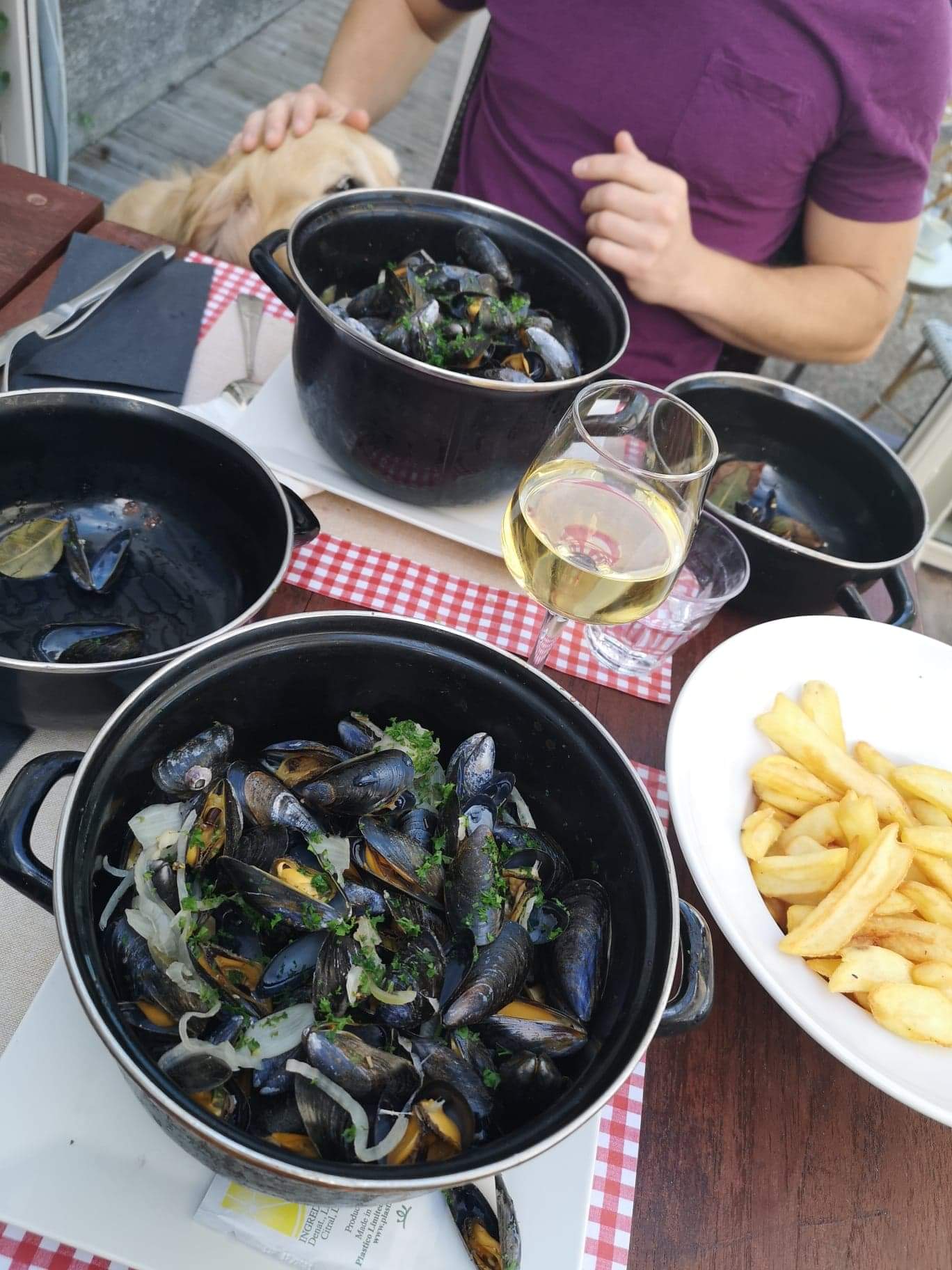 Moules frites à la crème de thym sans intérêt, service qui manque de sourire, un plat de moules renversé juste devant moi, la serveuse qui ne s’inquiète pas des éclaboussures reçues sur mon pantalon et mon chien qui a bien failli se prendre ce plat sur le coin du museau!!! Incroyable mais vrai. Plus jamais!