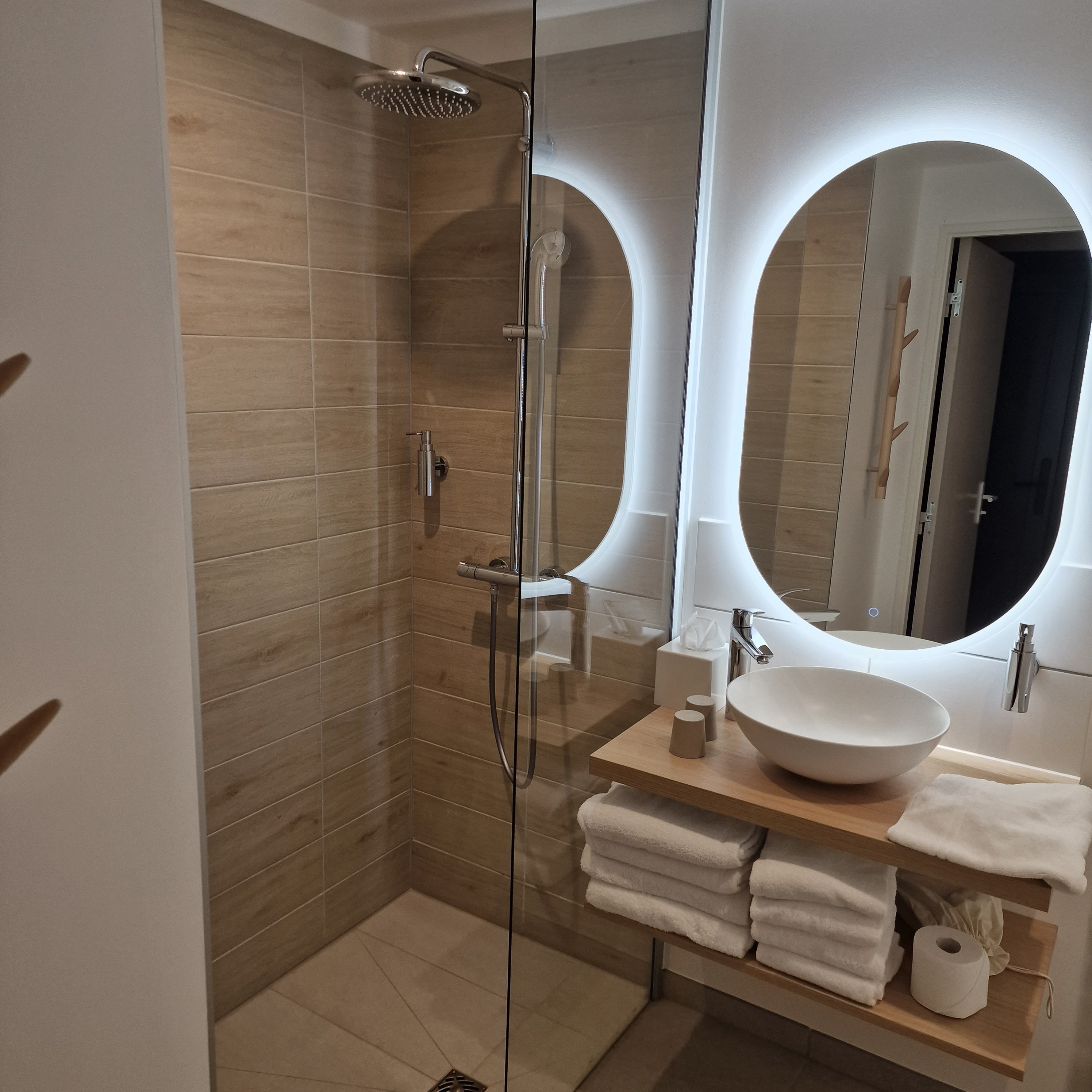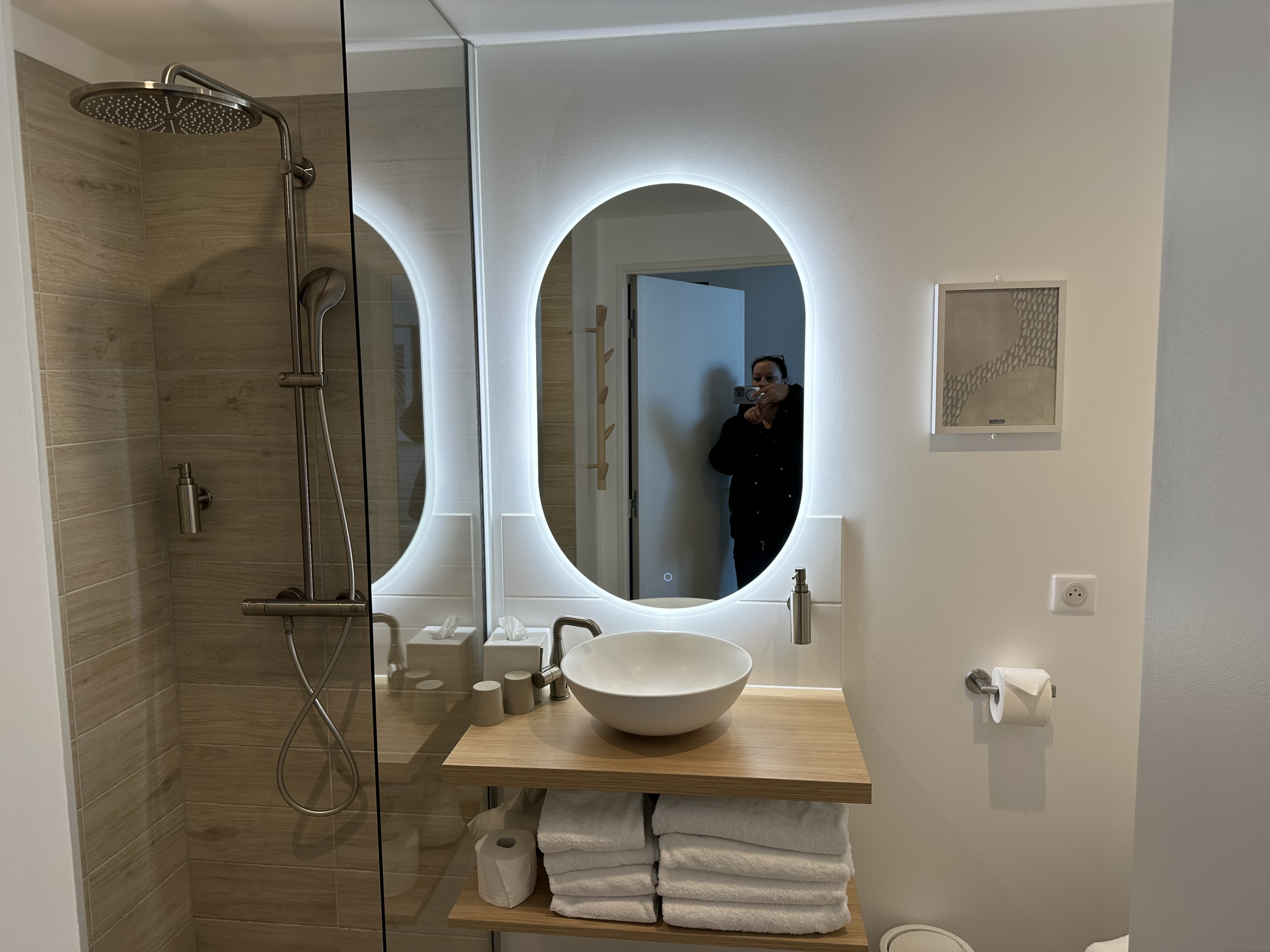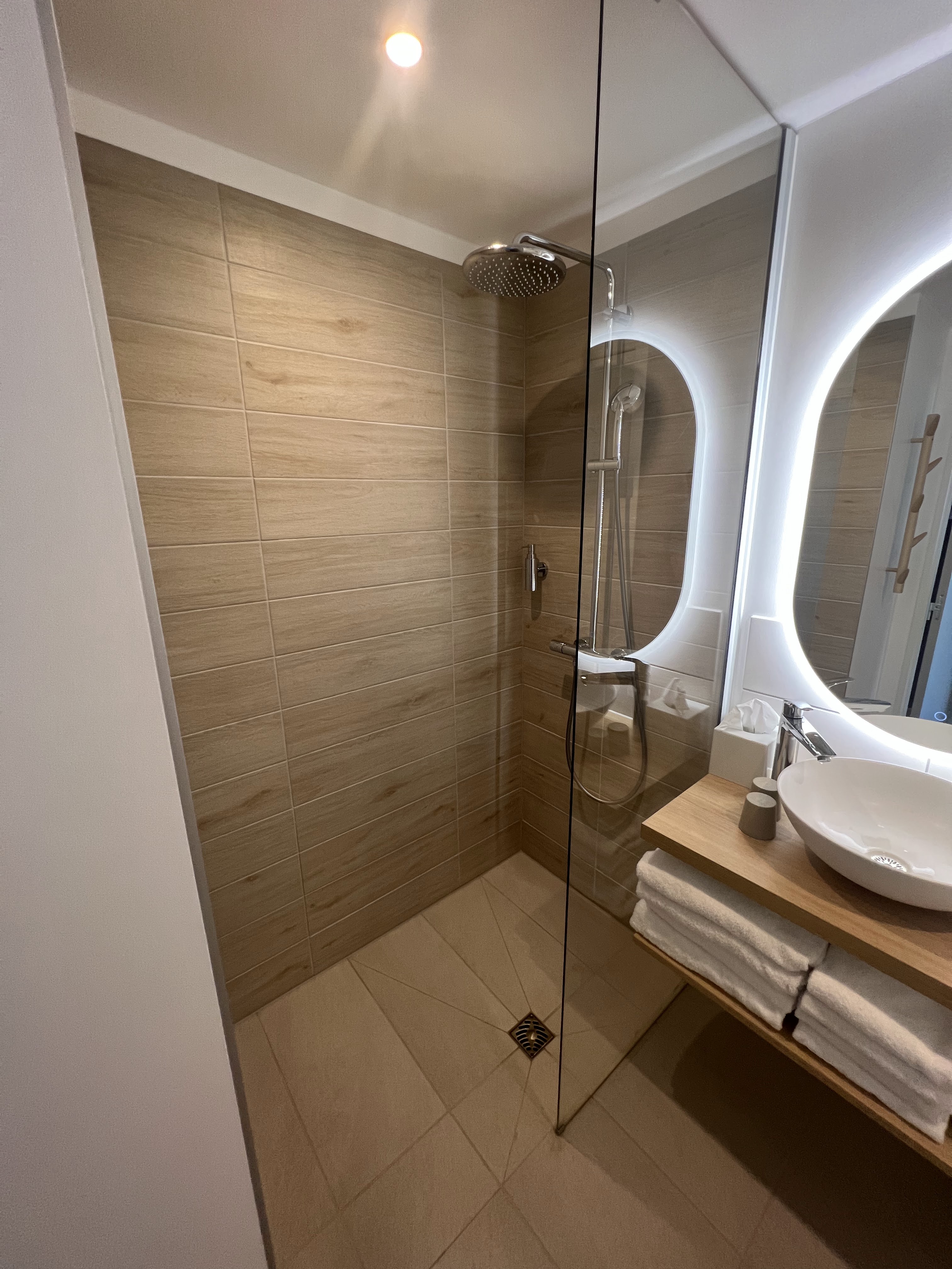 Lieu très propre et neuf. Le personnel est très agréable, soucieux de votre confort et peut répondre à toutes vos questions avec sourire. Grande douche italienne appréciable. Emplacement à 2 pas de l'entrée pour le parc. Lieu qui fait penser à un coin de nature en plein centre ville. C'est un endroit très relaxant et reposant. Pas un bruit durant la soirée et la nuit. L'isolation phonique paraît impeccable. Les enfants adoreront leur chambre en forme de cabane. Pour les possesseurs de voitures électriques il y a de nombreux chargeur double en type 2. Seul bémol la puissance de charge n'est que de 4kwh. Ceci dit lorsque vous passez la nuit et allez sur le futuroscope le jour suivant le véhicule sera bien rechargé pour repartir. Très bon séjour. Nous reviendrons certainement.