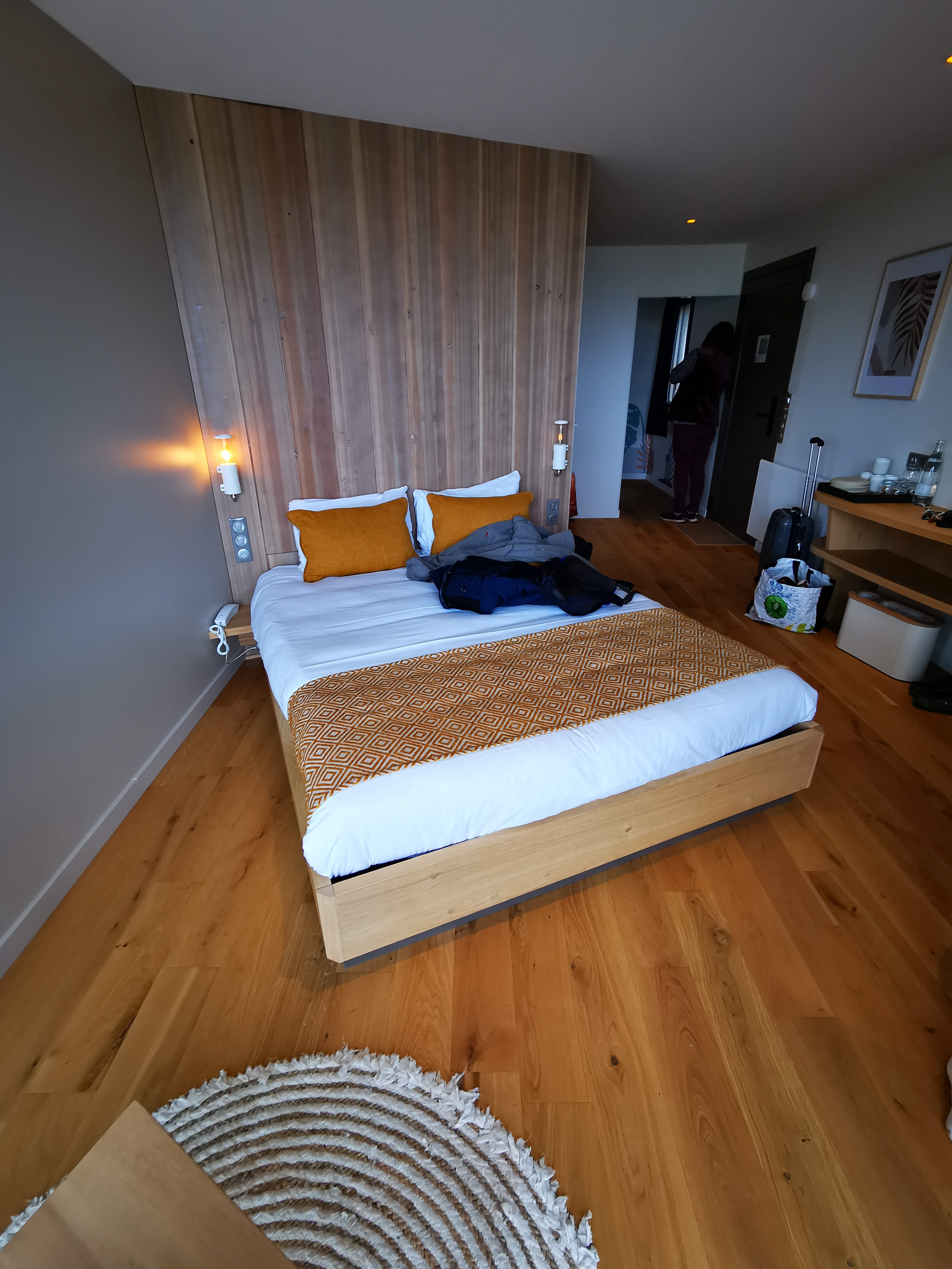 Commençons par les points positifs : - Établissement flambant neuf - Excellent emplacement - Parking gratuit - Bouteille d'eau dans la chambre - Confort exceptionnel de la literie (les nombreux oreillers sont extraordinaires !) - Chambre propre et spacieuse Poursuivons avec les bémols : - Pas de frigo... Dur sur l'été ! - Petit-déjeuner identique tous les matins. Certes copieux, il n'est cependant pas savoureux. Le système de livraison devant la porte, qui, de prime abord, peut sembler pratique, est en fait bien peu écolo... : Ce qui n'est pas mangé est certainement jeté donc quel gaspillage ! Insensé et bien mal pensé à notre époque... - Qui dit établissement neuf dit extérieurs pauvres en végétation. Les arbres plantés sont si petits qu'il va falloir attendre des décennies pour que ce soit agréable ! Terminons enfin avec les points négatifs : - Chaleur difficilement supportable dans les chambres (une chose est sûre, nous n'y retournerons pas l'été) - Si le check-out a été fait par une charmante jeune femme, il en est bien autrement pour le check-in ! Accueil limitepar une jeune femme qui semblait ne pas avoir encore compris l'essence même de son métier ni le standing voulu par l'établissement (quand on considère les tarifs pratiqués !!). Déjà même avant d'avoir vu notre logement, nous savions que cela serait sanctionné par une étoile en moins sur cet avis...