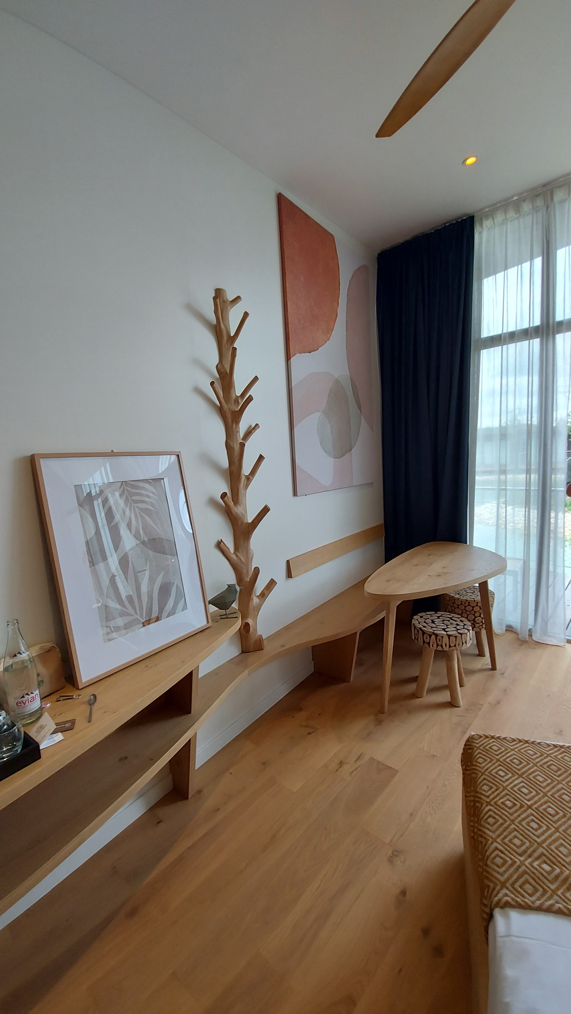 L'hôtel est très propre et agréable. L'environnement reposant. Literie d'excellent confort, matériaux naturels soignés. La chambre (5 places pour nous) magnifique et bien agencée avec des lits dans le style de cabanne pour les enfants. Pour les parents grand lit double donnant sur une large baie vitrée donnant sur la terrasse. Non climatisé, mais les fenêtres permettent de faire un courant d'air suffisant pour rafraîchir. Petit déjeuné déposé sur le seuil de la chambre agréable. Bref je recommande.