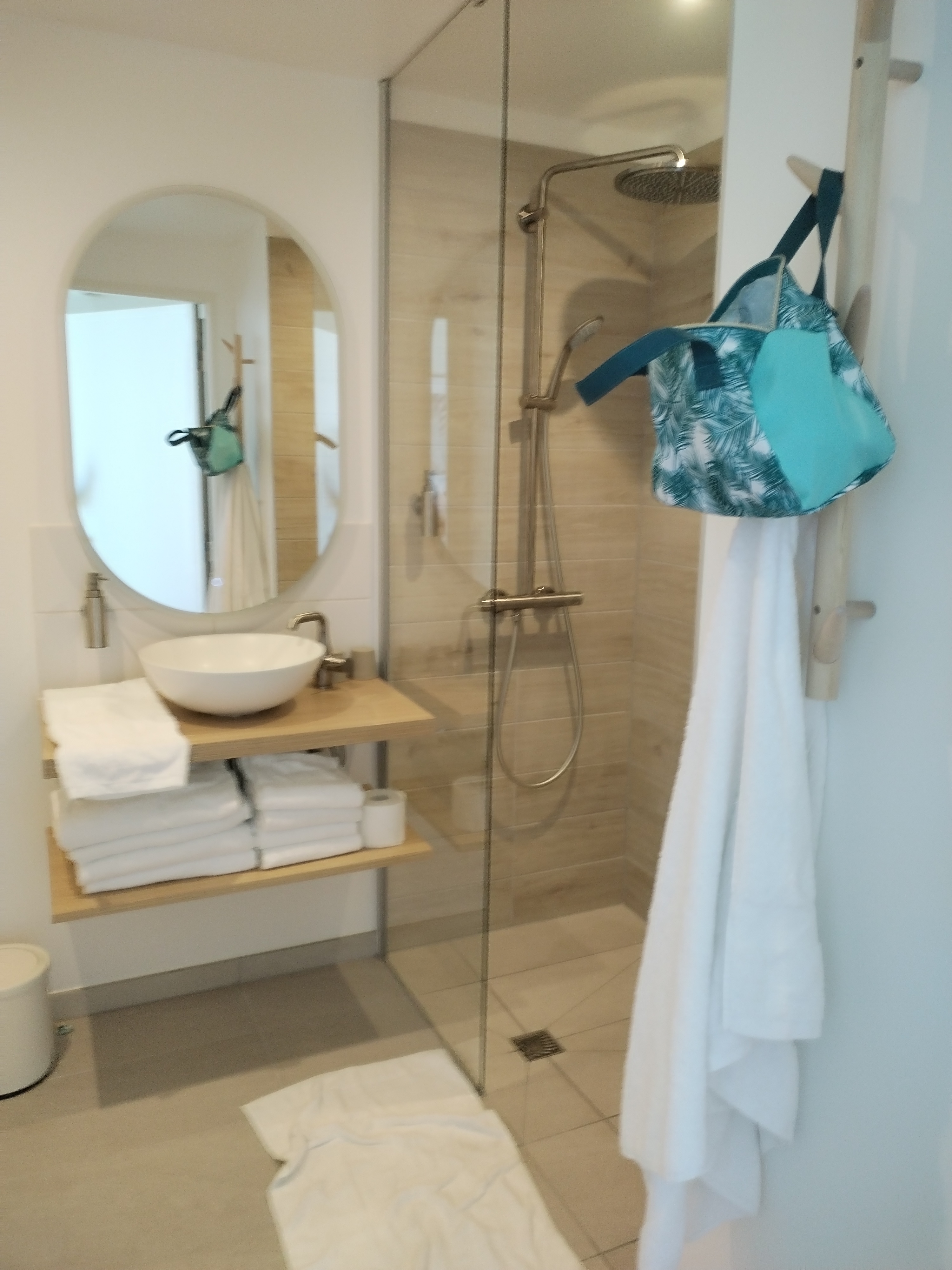 Magnifique Calme Nature Les Petits bémols : manque de patère et porte manteaux pour les serviettes humides notamment et salle de bain qui va très mal vieillir : problème de pente du sol : toute l’eau part vers la porte j’ai dû condamner 2 serviettes pour éponger même en faisant attention Petit déjeuner pas ecolo du tout au vue du gaspillage : que font ils des yaourts qu’on ne mange pas mais qui ne sont plus au frigo? Du beurre idem ? Pas de fruits 3 malheureuses viennoiseries (pas les mêmes) et un morceau de pain , bof pourquoi ne pas nous faire remplir une fiche à l’arrivée avec nos choix pour le matin suivant? Ce serait si simple.