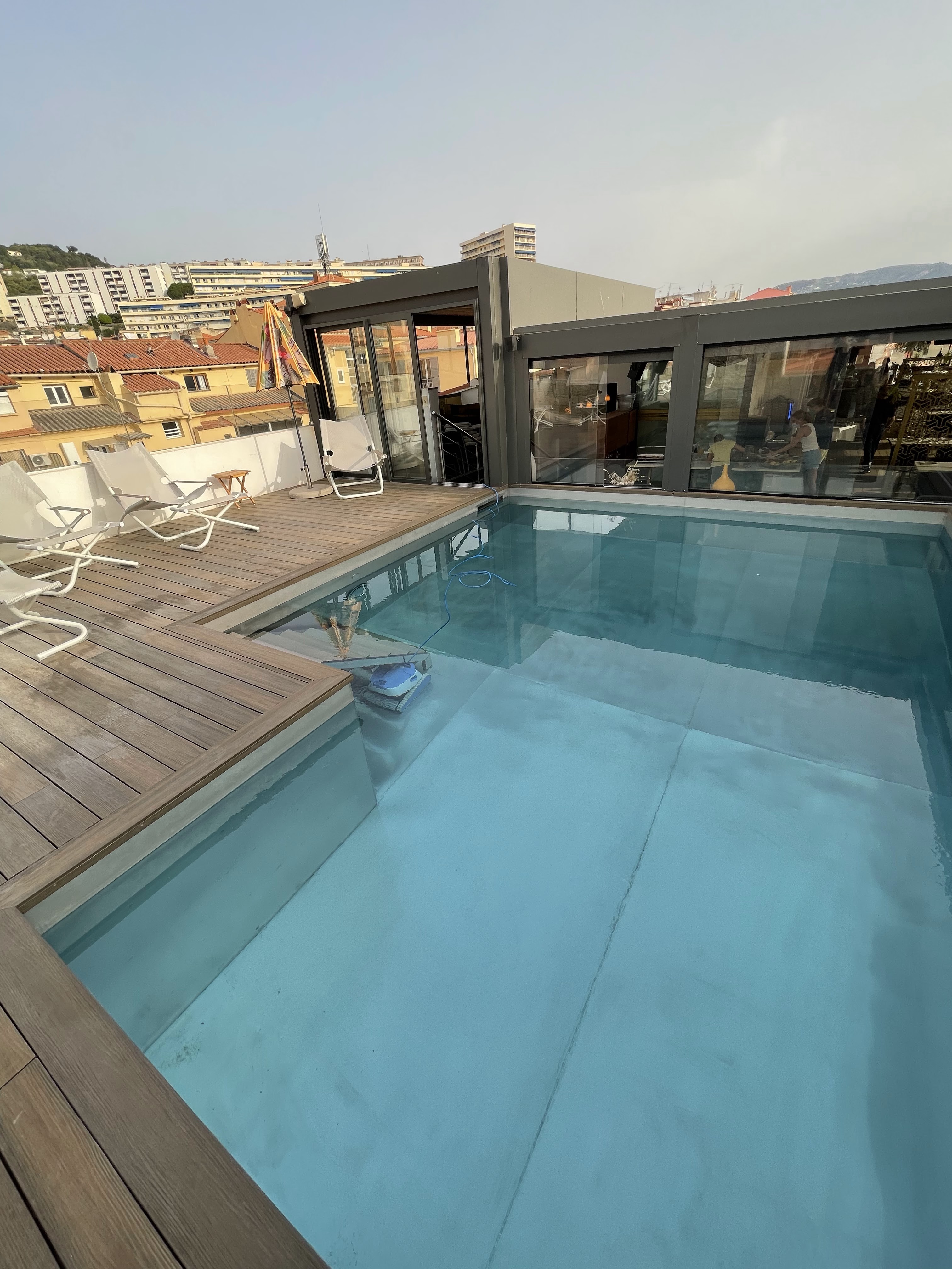 Les seuls points positifs : l'emplacement, la literie est très confortable. Tout le reste est médiocre : pas de parking, un hôtel qui a tout misé sur le marketing/la communication concernant son rooftop or les chambres ne suivent pas du tout ce standing, aucune décoration, il s'agit d'un ancien hôtel mal rénové, nous avions une chambre double standard, impossible de circuler, plafond très bas, pièce très sombre, sdb aussi très étroite, la piscine est agréable mais la terrasse autour est tellement petite (ne contient que 6 chaises pour un si grand hôtel), nous étions obligés de poser nos affaires sur les reposes pieds d'autres personnes, certains posaient même leurs affaires sur les murs - bref à fuir, je vous conseille de vous tourner vers d'autres hôtels plus intéressants dans Ajaccio !