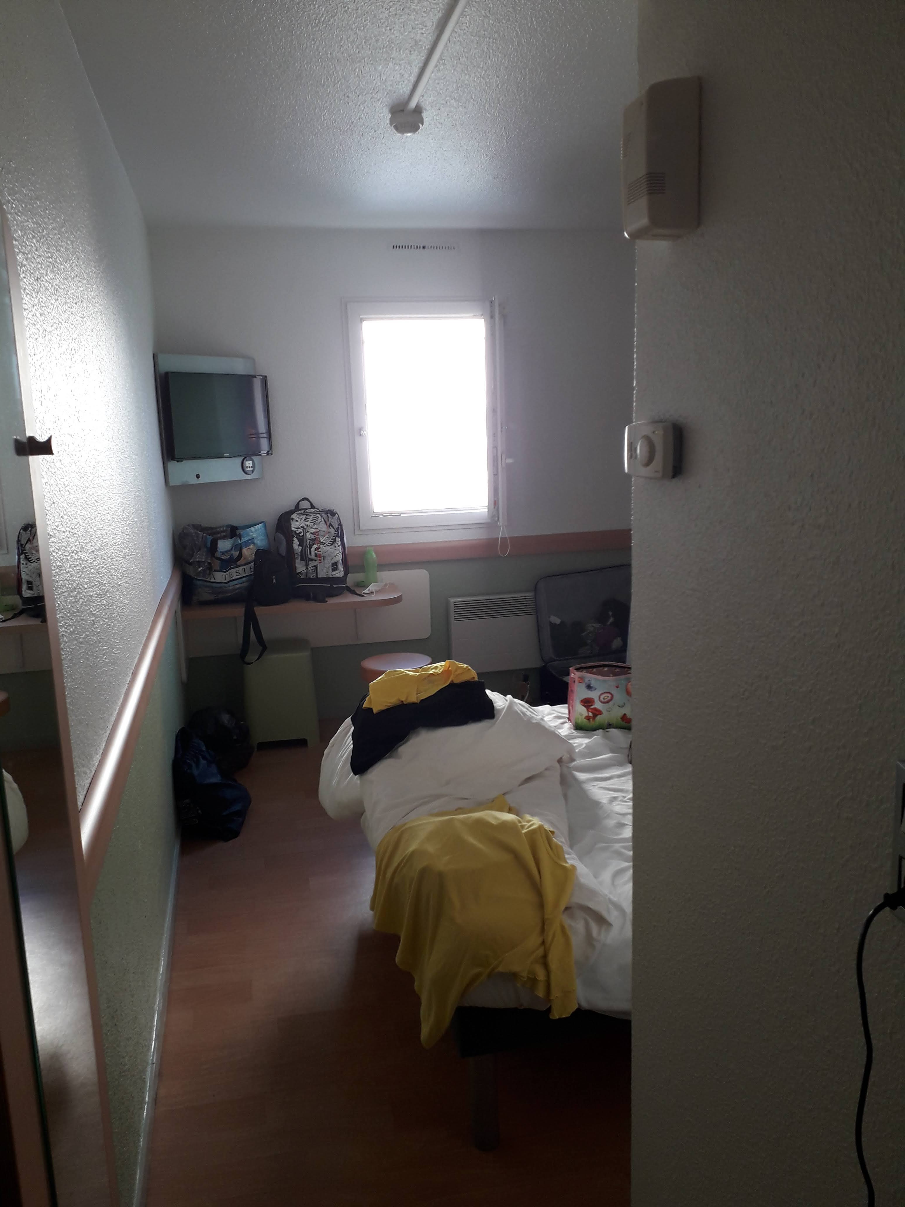 Je pense vraiment à exclure Ibis Budget dans le choix de mes hébergement tellement le service décrois en qualité. Les chambres sont de plus en plus petites, aucun rangement à part 2 crochets (absolument pas pratiques) et une panderie (au dessus du lit, donc pour celui qui dort...). Résultat : on se retrouve avec les valises et les vêtements qui trainent un peu partout !! Pour la douche et les wc on a l'impression d'être dans une cabine de camping ! Rien pour poser le gel douche, le moindre coup contre le mur est bruyant, et une odeur immonde d'égouts émane de l'évacuation... Vous êtes sérieux ?! L'accueil était agréable en revanche, une charmante jeune dame, mais pour ce qui est de la localisation... Nous étions à 1000 lieux de nous imaginer que par la fenêtre de notre chambre nous aurions vue sur... Un ancien formule 1 occupé par des migrants ! Quel plaisir de voir les chaussures reposer sur leur fenêtre, de les voir entrer et sortir de l'hôtel en serviette, en callecon, pour jouer au balcon, étendre leur linge, ou juste se prélasser sur un canapé banalisé en extérieur... Il manquait plus que les tentes et on se serait crus à Calais ! Nous avons malgré tout pu dormir tranquillement mais quel choc.