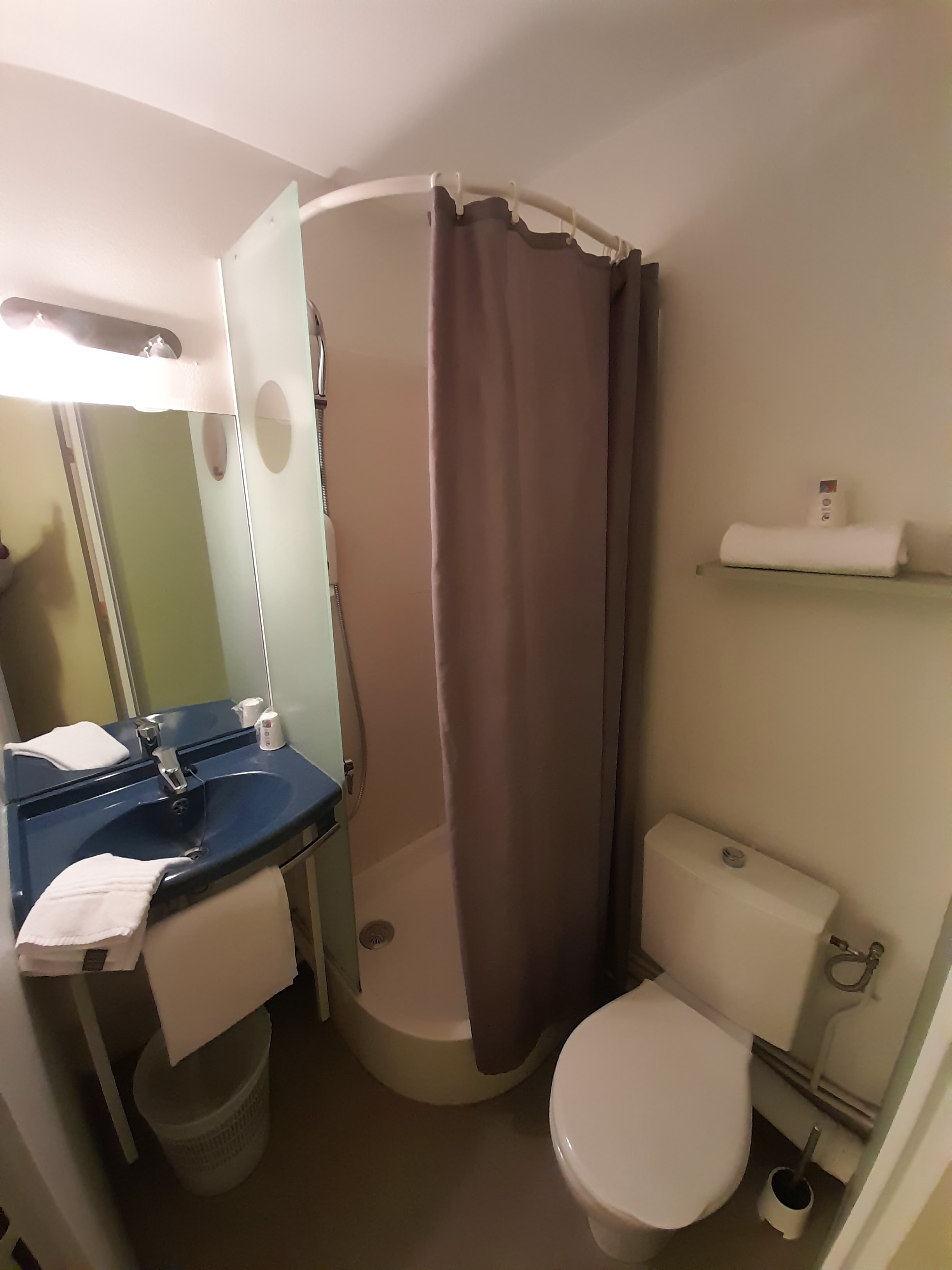 Ibis budget de vieille génération ( etap) :petite douche avec rideau qui se colle au corps. Accueil sympa. Pas de climatisation dans les chambres . Situation en bord de route dans une zone commerciale. Un peu cher pour le niveau de qualité et un concept un peu vieillot