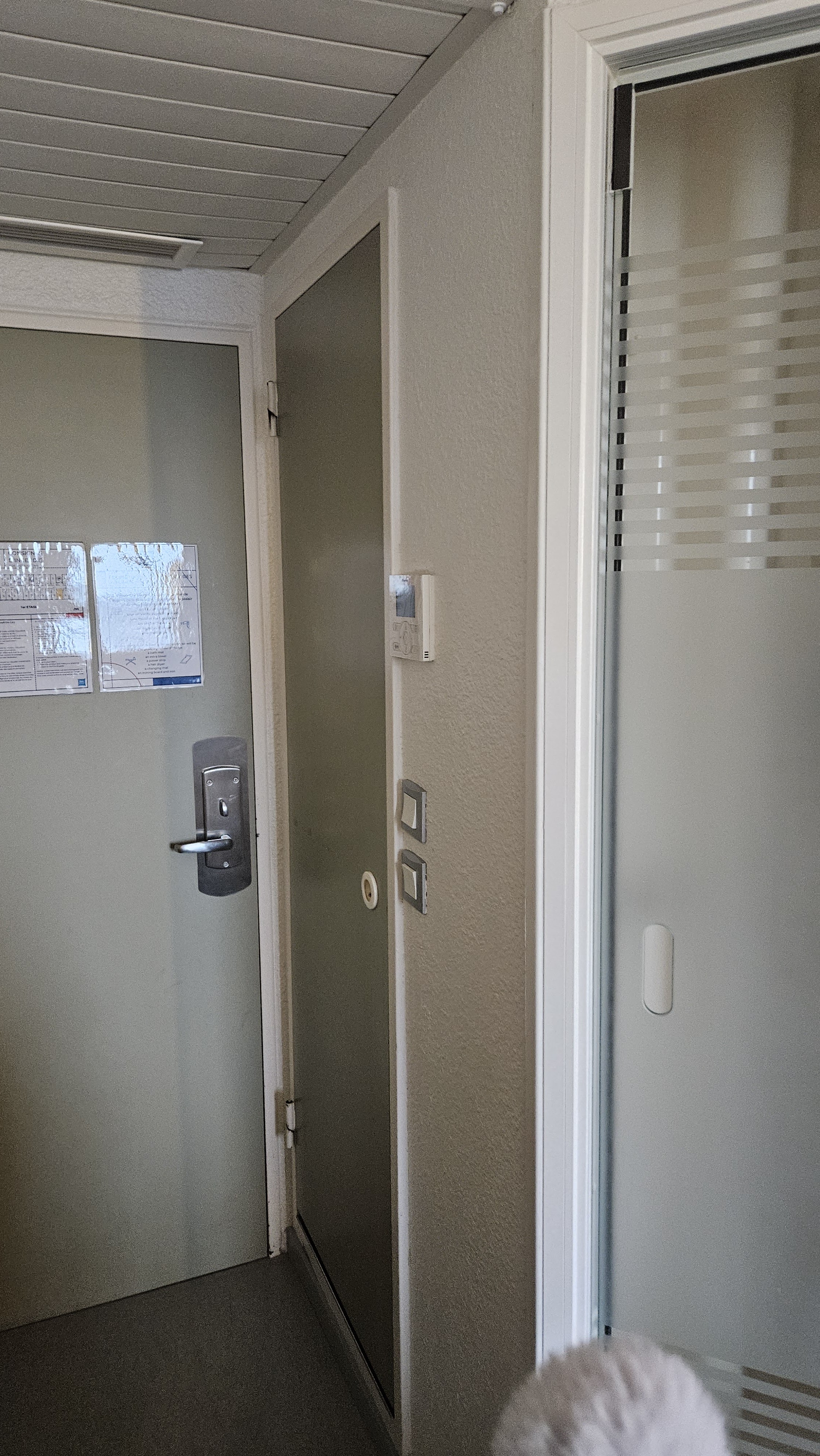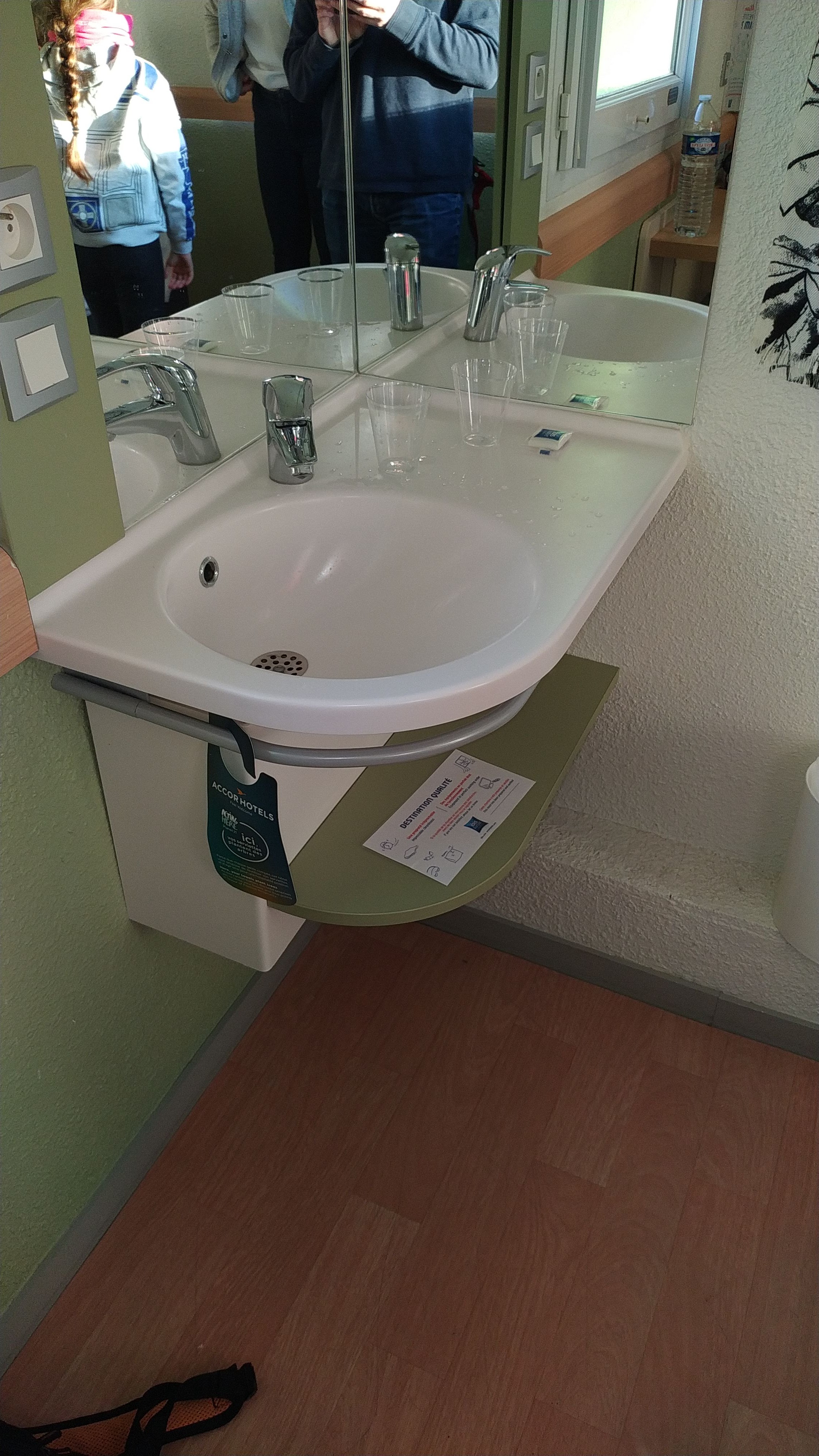 Plutôt déçue de la chambre. Très bien pensé pour les gens à mobilité réduite, mais lorsqu'on ne l'est pas, on se retrouve avec le coin évier dans la chambre, qui de base se trouve dans la salle de bain, dans celle-ci il y a une douche et des wc, mais rien pour poser ses vêtements ou ses produits de toilettes, j'ai dû prendre la chaise du bureau et la mettre dans la salle de bain pour poser mes affaires, un petit buffet aurait pu être prévu à cet effet, et le pire c'est que la porte coulissante de la salle de bain, ne se verrouille pas, donc un oubli de présence est vite arrivé si vous voyez ce que je veux dire looool Point positif pour ne pas être trop méchante lol: Le personnel est plutôt sympathique. Le petit déjeuner est correct, il y a ce qu'il faut. Chauffage qui est réglable donc bien pour les personnes frileuses comme moi.