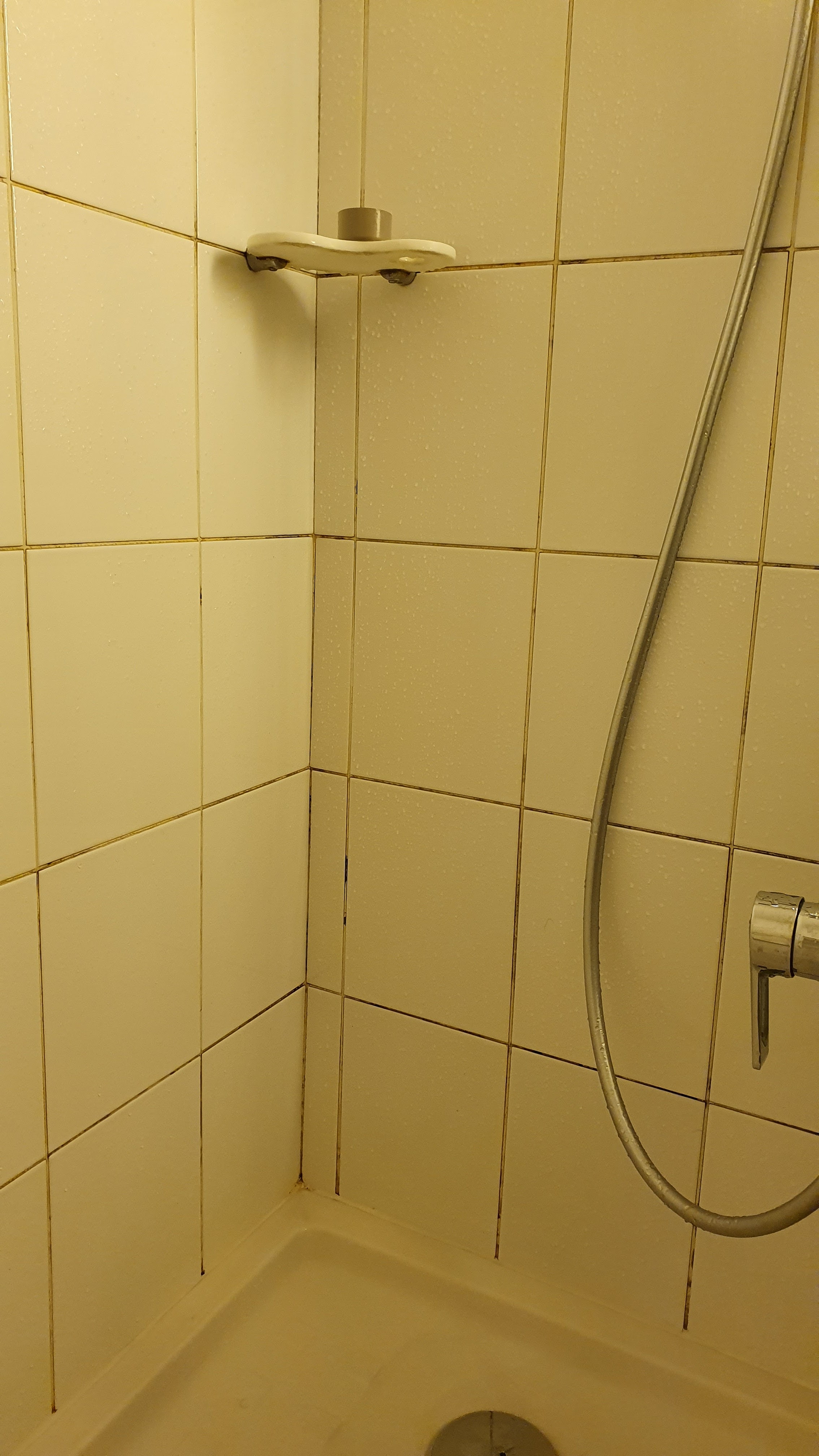 Tarif avec petit déjeuner excessif pour une nuit, salle d'eau avec joints de douche et carrelage sales.