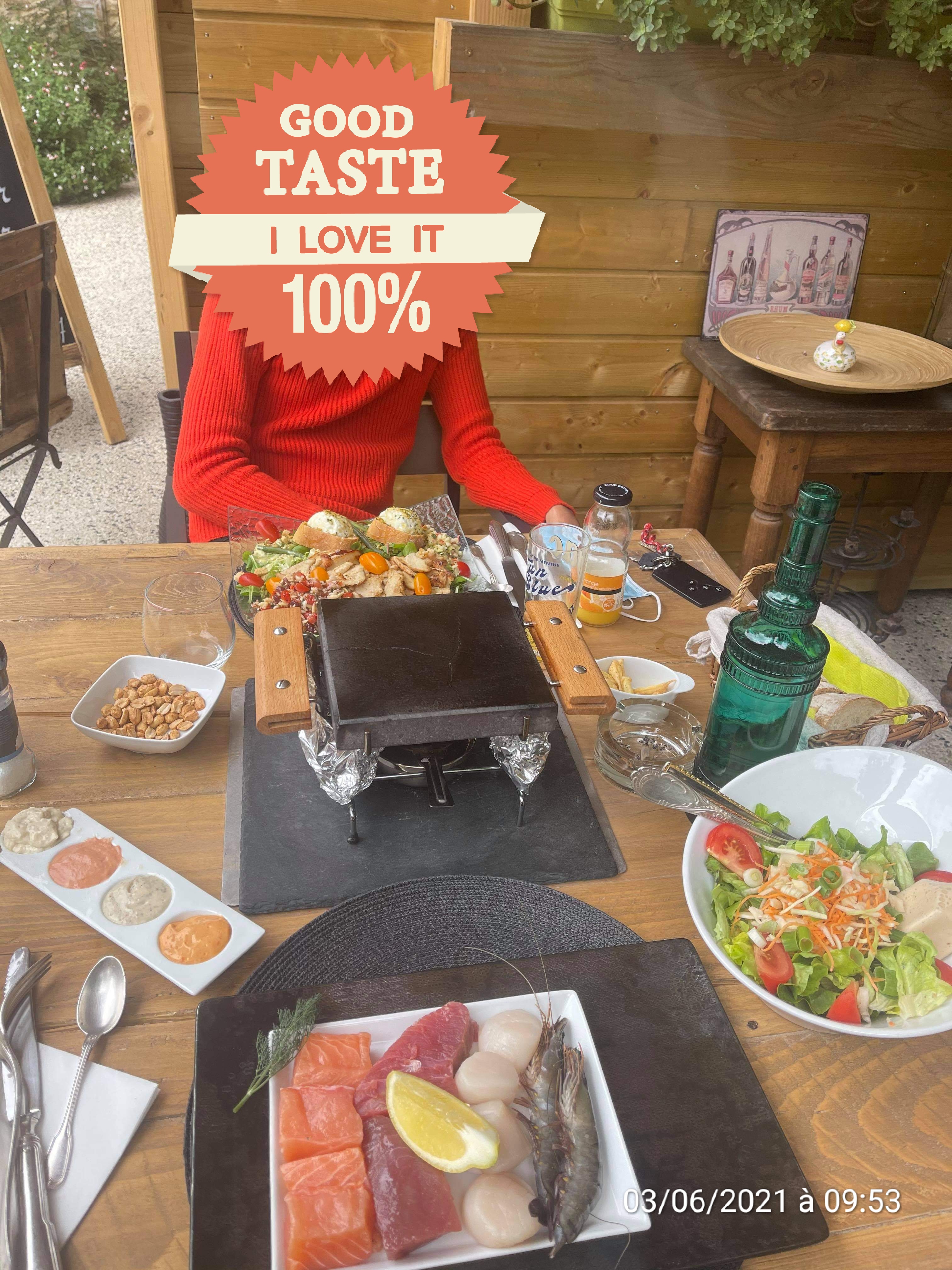 Tout simplement génial. Une première pour moi de manger un reblochon de cette façon, avec viande sur les charbons juste au dessus. Le reste de la table a prit une raclette (que j'ai quand même goûté malgré mes deux moitiés de reblochon) qui était super bonne ! Je recommande sans hésiter. On y mange bien, on est bien servie, on est dans une bonne ambiance (nous avons mangé dans le chalet). Et encore merci pour la bougie sur le dessert pour fêter un anniversaire ! À très vite !