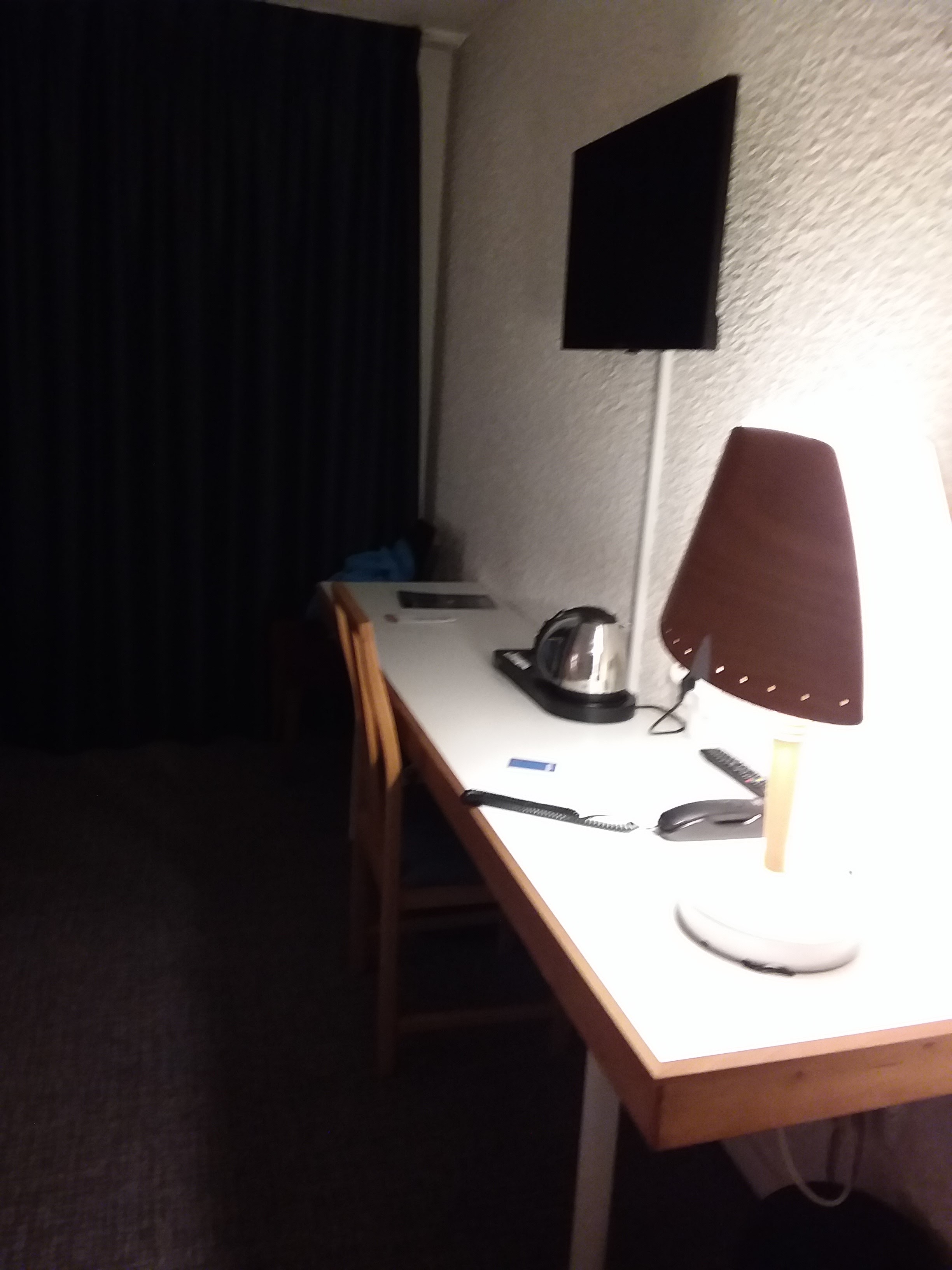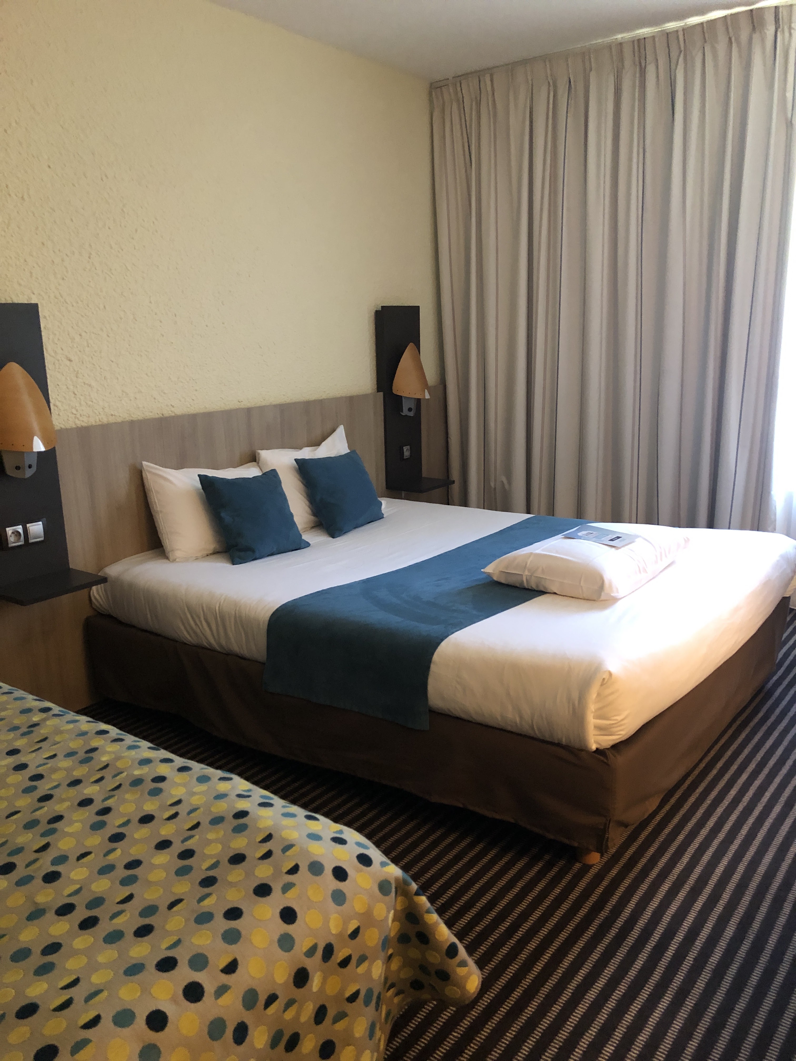 Une (courte) nuit passée à l'étage côté route. Ambiance festive et hyper bruyante de l'autre côté de la route jusqu'à plus d'une heure du matin. Nuit calme entre 1h30 et 6h50. Bruits de couloir ensuite. La route et les bruits extérieurs s'entendent même fenêtre fermée. J'ai retrouvé un mouchoir qui ne m'appartenait pas sous un lit... l'aspirateur n'a pas du pouvoir passer à cet endroit ;-) en période de crise sanitaire...ça me semble limite pour un 3 étoiles ! Côté restaurant, plat du jour correct et le verre de rouge à 7€, ça fait cher la bouteille!