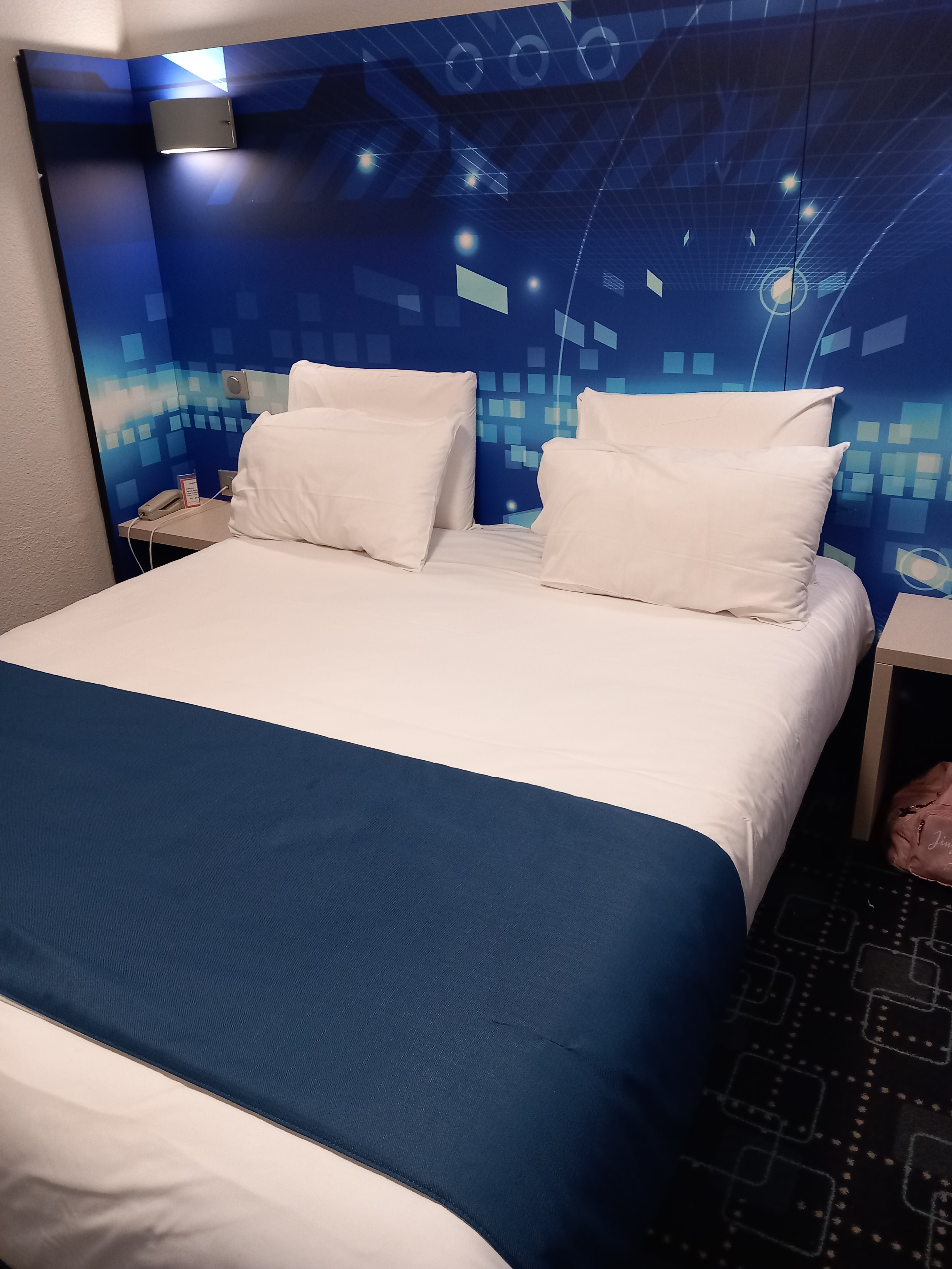 L’hôtel est propre et l’emplacement est top pour les personnes allant au futuroscope. Concernant la chambre elle est cosy, manque peut être un deuxième coussin, et des rideaux qui coupent la lumière pour pouvoir profiter d’une grasse mat’? Les murs sont semblables à du carton, on entend tous ce qui se passe dans les chambres adjointes… Concernant le petit dej, nous avons dû aller dans un restaurant à l’extérieur de l’hôtel. Petit dej bas de gamme, peux de choix et produits à moitié décongelés… pourtant, un petit dej était prévu dans l’hôtel mais nous n’avons pas pu en profiter …