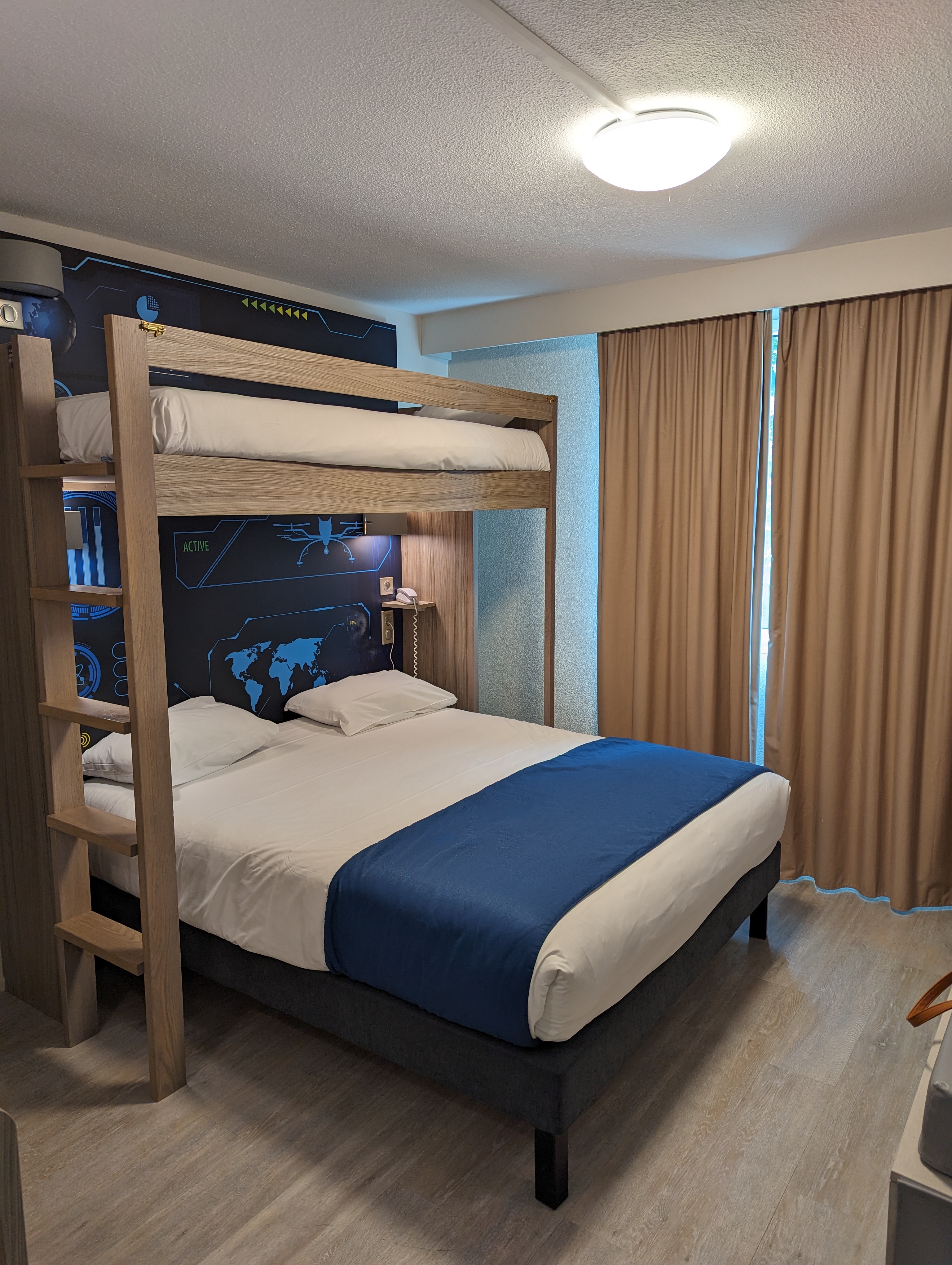 Je commence par le positif, l hotel est à proximité parc futuroscope accessible à pieds, bien fléché. Service bagagerie gratuit. (Sinon 7euros par sac au futuroscope. ) Le personnel est sympathique, les couloirs et chambres très bien entretenues. Clim serviettes, théière, café, rien à dire, très apprécié. Le négatif...on.a pris une chambre 5 personnes. Grosse erreur. On aurait dû mieux regarder les explications. Clairement c'est une chambre pour 2, donc pour la même superficie il y a 1 lit simple au dessus du lit double. Et au pieds du lit double, sous la TV, ils rajoutent 2 lits d'appoints. Bref avec des enfants jeunes, ça permet de les avoir sous les yeux...mais Clairement pas adapté pour parents et 3 ados. Pas de possibilité fermer les WC ou douche ...compliqué de poser les bagages de 5 personnes. Bref, après une journée au parc, ça va, mais faut pas s'y attarder. Pour le petit déjeuner, allez y tôt. A 9h il y avait une trentaine de personnes qui attendaient leur tour dans le hall. On était en voyage de groupe organisé et le petit dej était prévu au resto des pirates situé à 100m. Pas d attente.