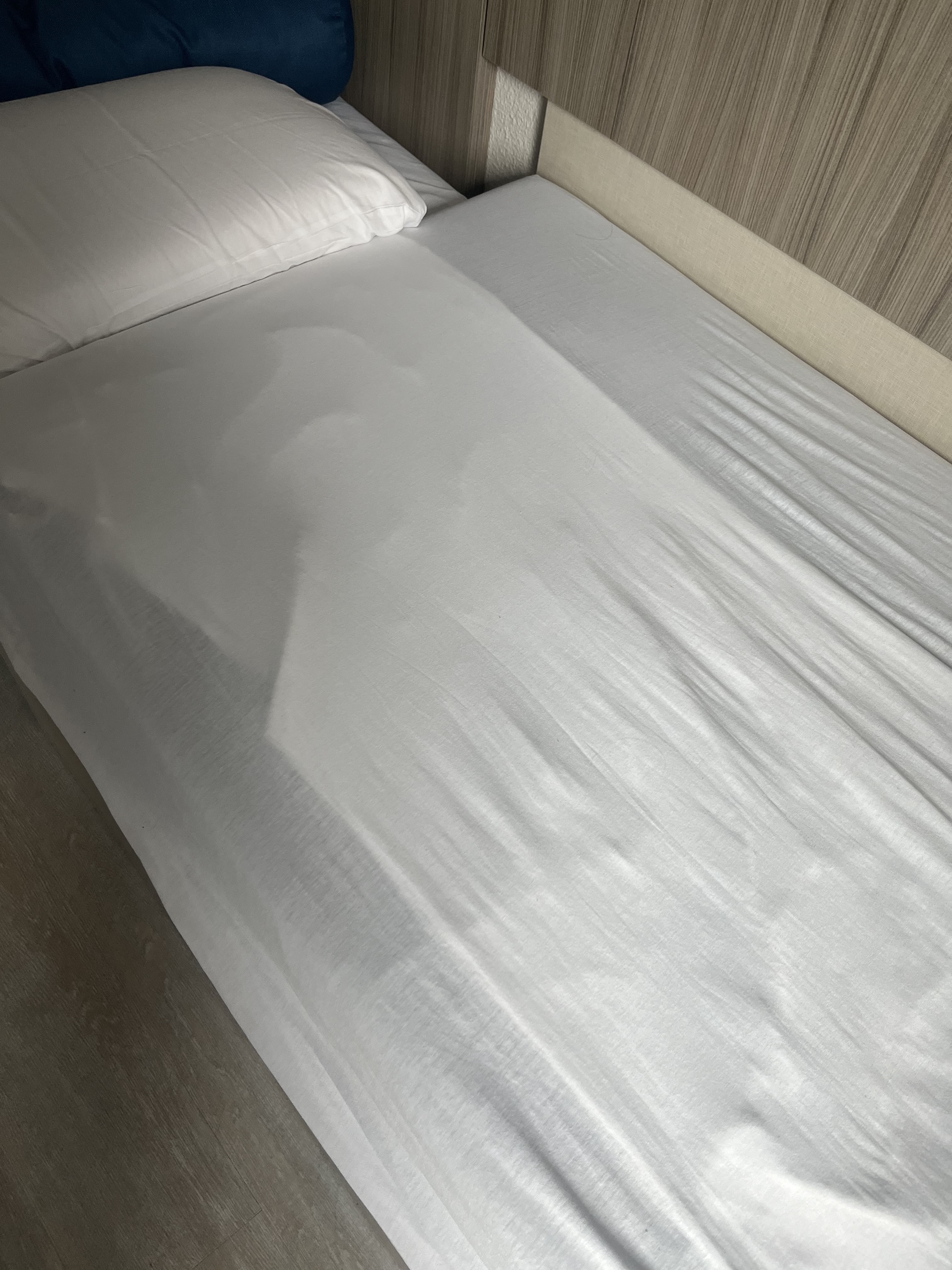 Nous sommes venu dans la nuit du mardi 19/04 au mercredi 20/04. Nous sommes un couple qui nous sommes retrouvés dans deux lits simples collés, sur un sommier en planche donc pas très agréable… Une salle de bain avec douche, toilette, lavabo dans la même pièce avec une douche pas très accessible. Je vous conseille donc de ne pas avoir envie d’aller aux toilettes la nuit juste après votre douche du soir à défaut de se retrouver les pieds mouillés..!