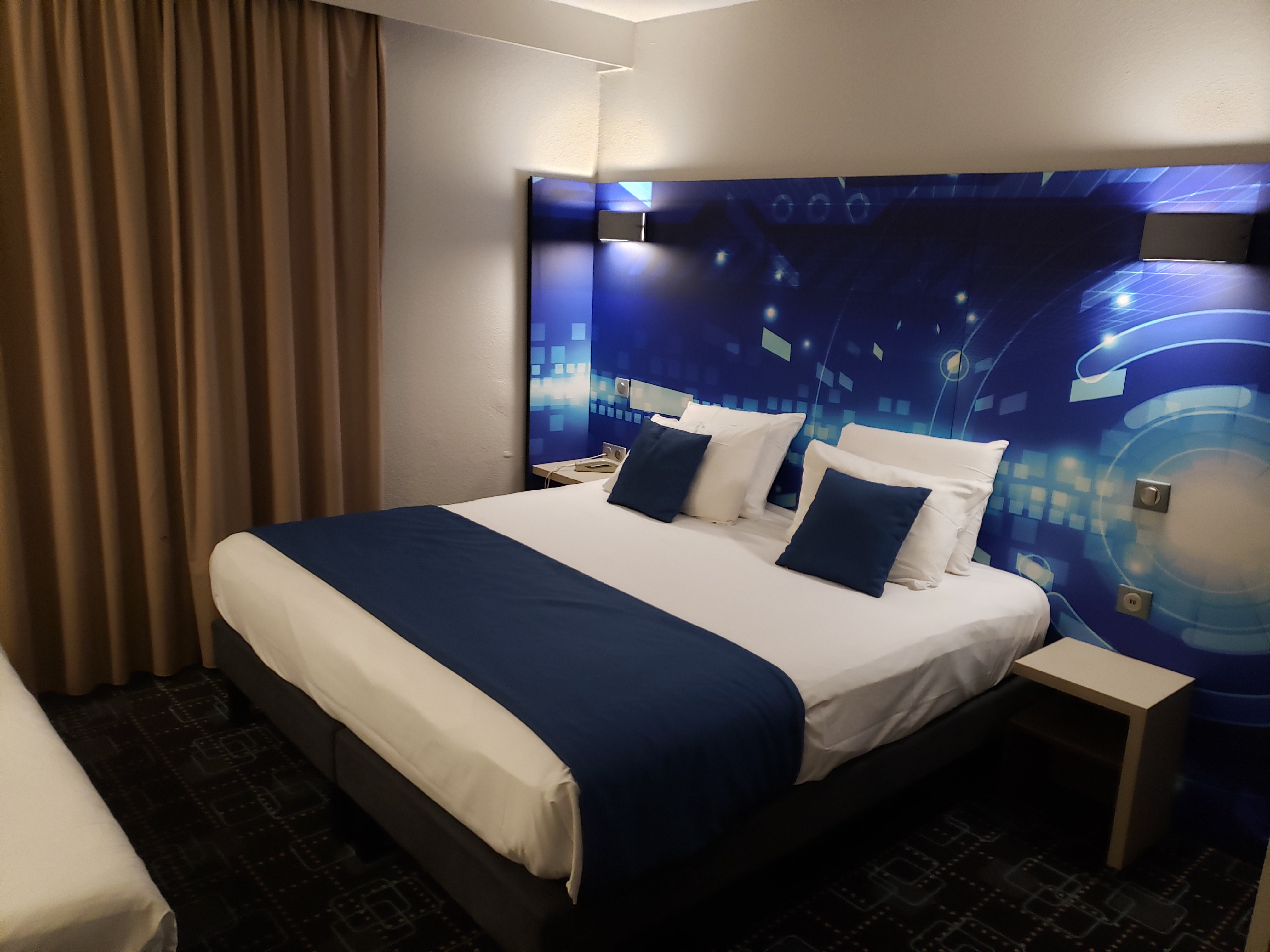Très bon hôtel à proximité du Futuroscope ! 10 min à pieds de l'entrée du parc. Parking à disposition. Le personnel est super accueillant, souriant et aimable. La chambre était spacieuse alors qu'on a pris une des moins chères. Le seul petit bémol une mauvaise odeur au niveau de la douche, petit soucis de canalisation dans la salle de bain. Mais avec la porte fermée aucune odeur dans la chambre. Le lit super confortable on aurait bien fait la grasse matinée si Lorant Deutsche, Thomas Pesquet ou Arthur ne nous attendaient pas... Bon et réveillés par les cris d'enfants mais ça c'est inévitable avec le parc et l'hôtel ni peut rien (on était au RDC pas loin de la salle de déjeuné donc...) Le petit déjeuné est diversifié et bon, un peu d'attente pour entrer dans la salle donc ne pas choisir le créneau de 9h pour être dans le parc à 10h ça ne passe pas ! Je recommande cet hôtel pour un séjour au Futuroscope !