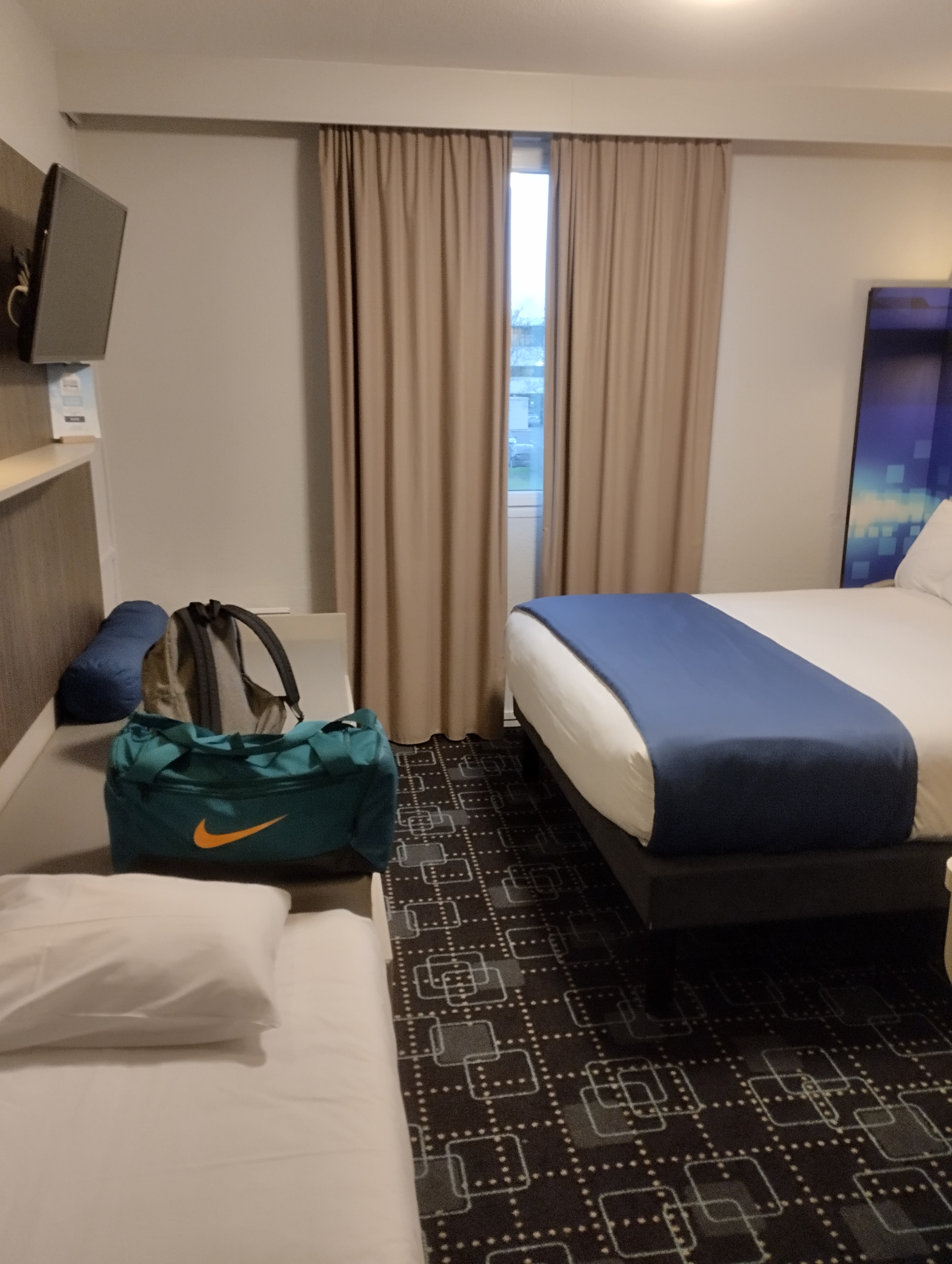 A proximité de l’autoroute, donc ça peut être pratique mais la nuit vous l’entendez bien… extérieur éclairé comme un stade de foot pour une partie nocturne, éclairage que de maigres rideaux n’arrivent pas à occulter. Déco vieillotte, moquette qui doit dater de la construction de l’hôtel dont on se dit qu’elle recèle des millions d’acariens, télé d’époque, et enfin le lit dont on ne sait s’il va vous envoyer à droite ou à gauche. A éviter si possible.