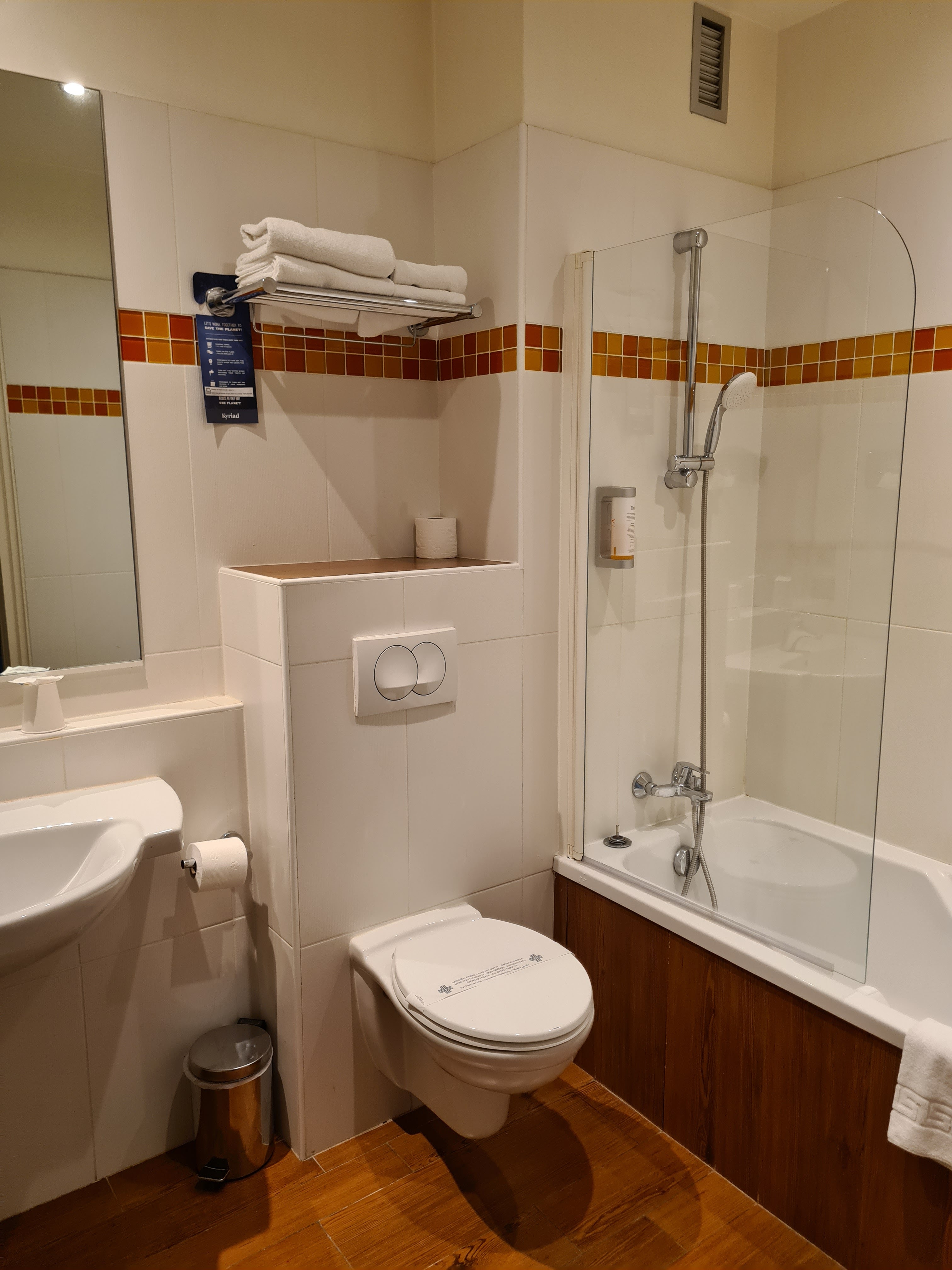 Accueil sympathique et agréable. Chambre aéré et propre. Par contre pour une chambre a plus de 100 euros la nuit il est presque inadmissible qu'il n'y ait aucun gel douche ni dentifrices!!!!! Heureusement que la supérette a côté est ouvert très tard. C'est juste incompréhensible!!!!!!! La personne de l'accueil nous a quand-même dépanné avec des sachet de savon. Merci à lui. A reflechir s'il y aura une prochaine fois... dommage