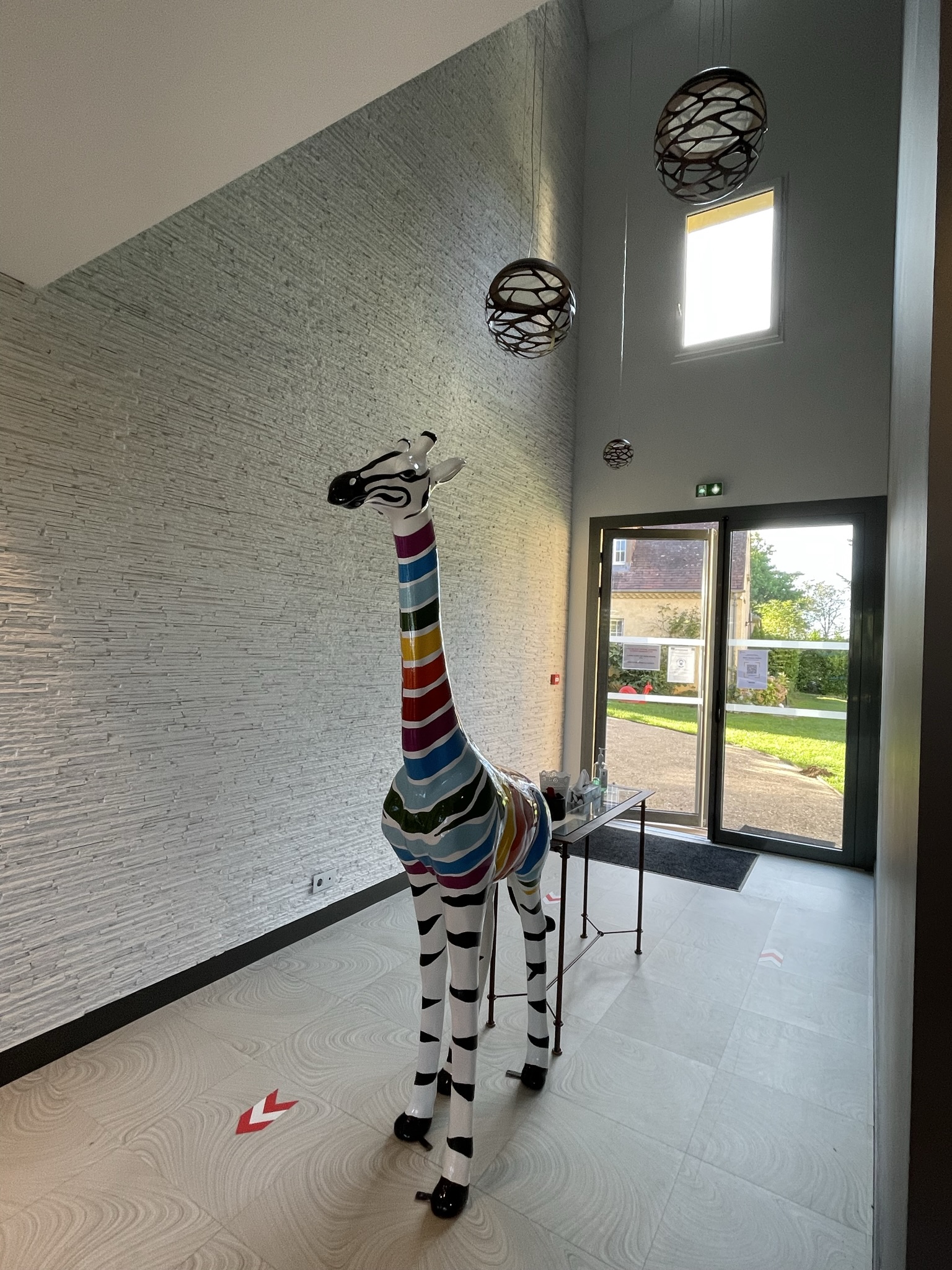 De beaux bâtiments anciens avec des chambres spacieuses et une salle à manger raffinée pour le petit-déjeuner et le dîner. Le personnel était merveilleux. L'hôtel est un peu loin de la ville, mais l'emplacement est paisible et il y a un grand parking sur place. La nourriture était excellente et les seuls points que je soustrairais seraient l'horrible café du matin. Sinon, nous avons beaucoup apprécié notre séjour. Et qui ne pourrait pas aimer une girafe aux rayures arc-en-ciel dans le hall et un hippopotame couvert de rouge à lèvres dans le petit jardin.