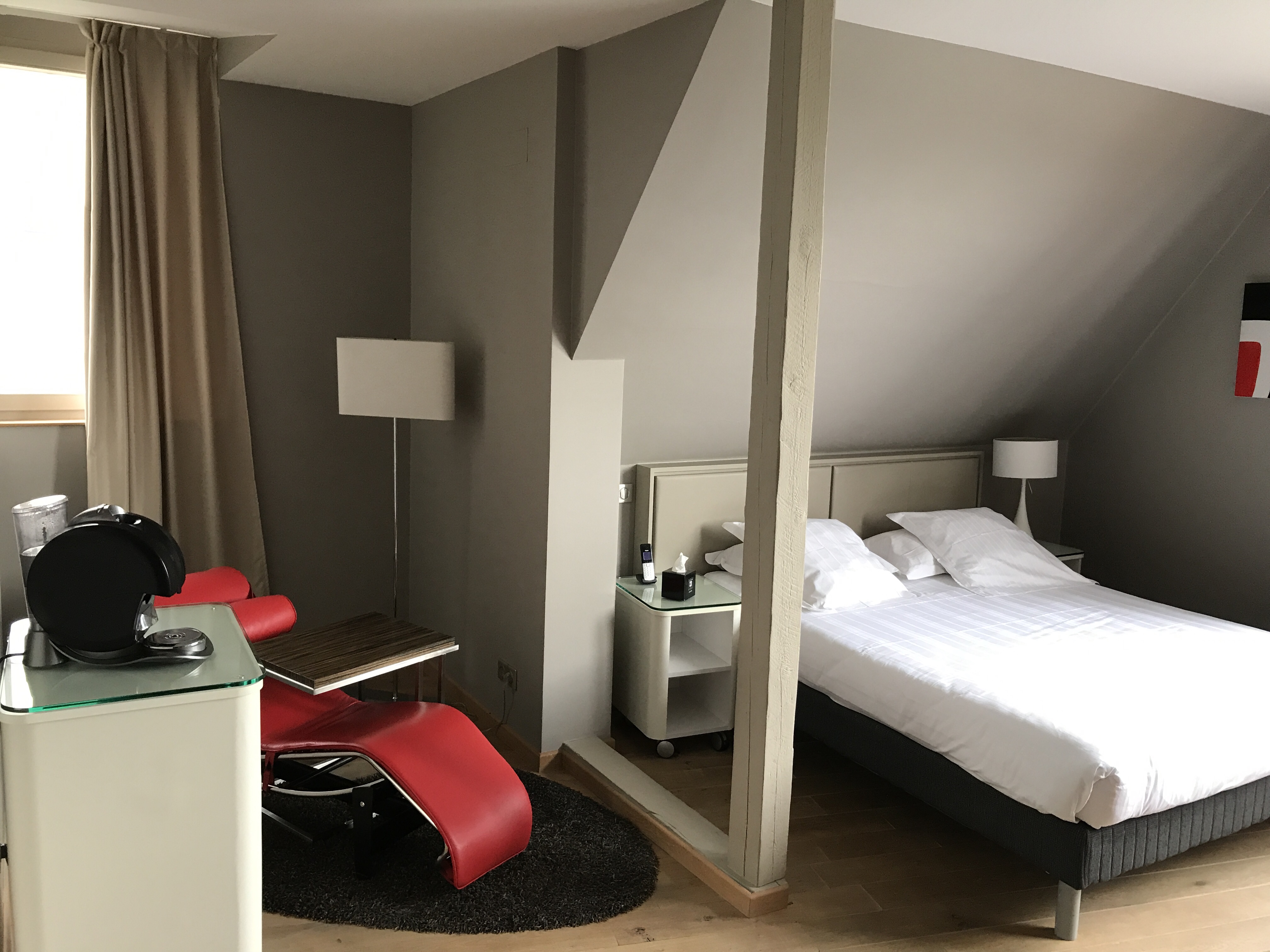 Nous sommes venus passer une nuit dans la suite, la 212. La décoration de la chambre est magnifique, moderne et chaleureuse. Propreté inégalable. On a des petits échantillons de shampoing, des peignoirs, une machine a café, de la place pour ranger nos affaires... De plus, la chambre est dotée d'une douche hammam, d'une baignoire balnéo, d'un grand lit, de 2 écrans plats... Bref le grand luxe. Le repas était délicieux (le chef nous avait fait une version végétarienne du menu, super sympa !) et le petit déj un délice. Pour finir, le personnel est d'une gentillesse, d'une politesse... tellement agréable ! je recommande et je reviendrai :)