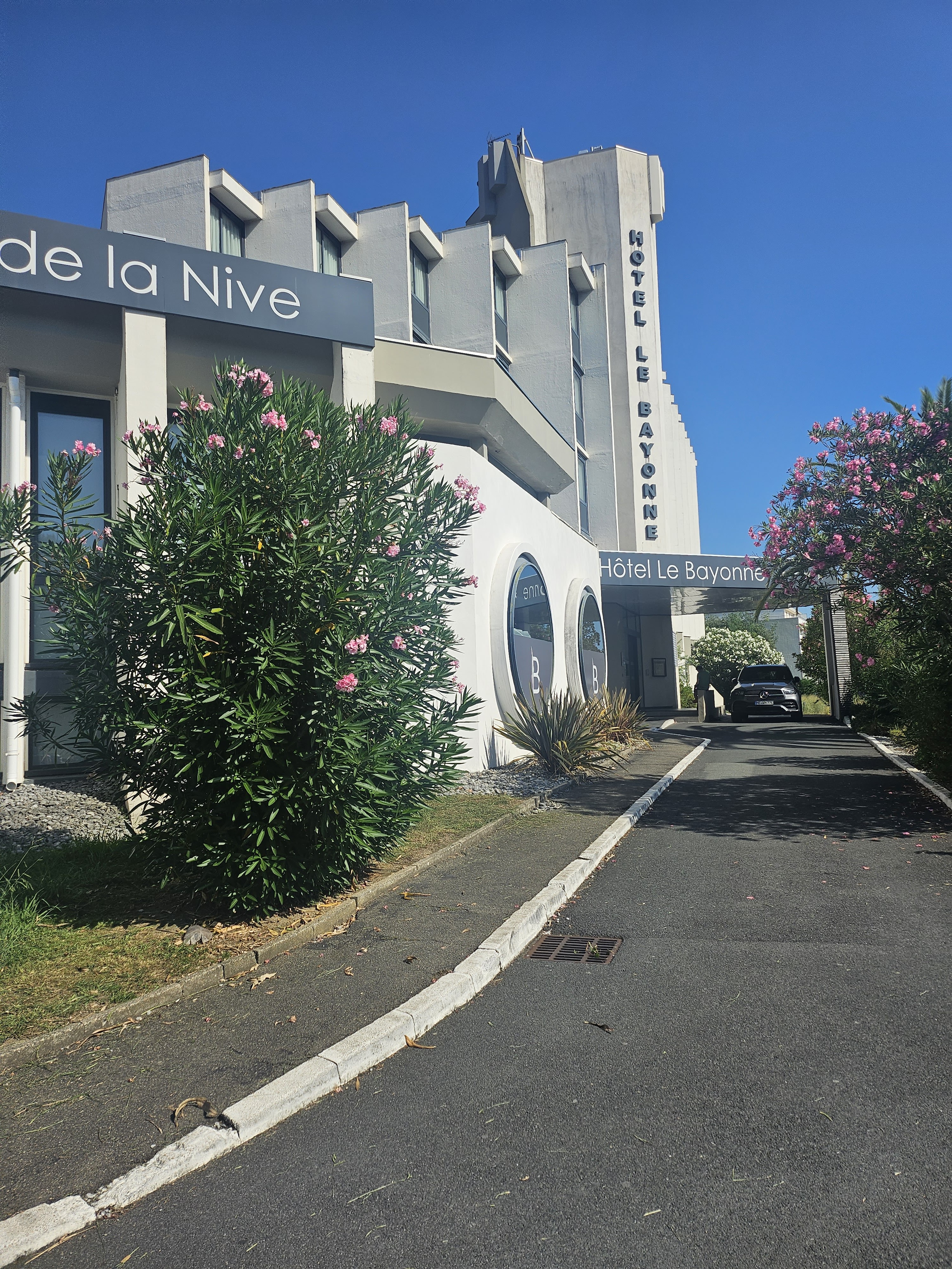 Hotel très bien placé, calme et facilement accessible à pied du centre de Bayonne (10 minutes), propre dans l'ensemble. Ceci étant les services et le niveau des chambres sont limite du 4 étoiles.... aucune déco, pour les chambres on est plus sur du style formule 1 ou ibis, pas de mini bar.... quand il fait chaud c'est sympa de mettre les boissons au frais... a l'arrivée aucune info données sur les sites touristiques, il est possible de louer des vélos électriques dommage que personnes ne nous en ai parlé à notre arrivée... petit dejeuner où il manque toujours quelque chose (soit du pain, soit des couverts, soit des oeufs...) et les produits sont très clairement industriels. Bref... hôtel propre et proche du centre ville mais c'est tout.