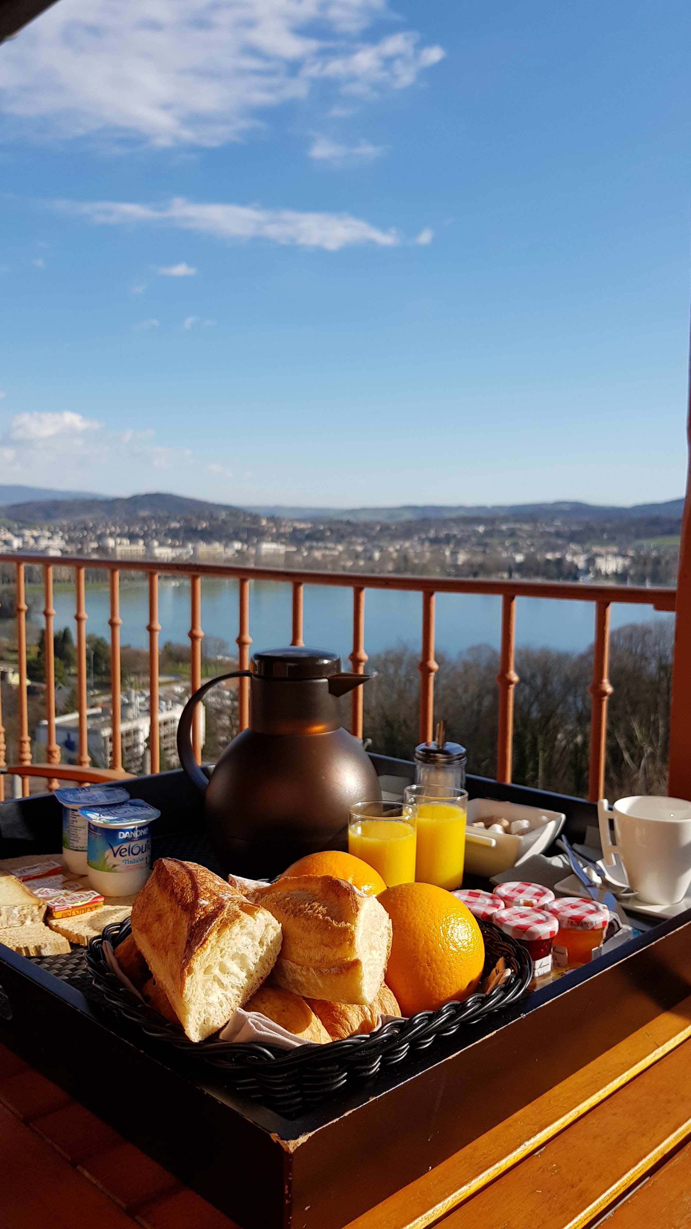 Hôtel très bien situé à 15 minutes à pied de la vieille ville, disposant d'un parking. L'emplacement de l’hôtel permet d'aller visiter la ville à pied ou de partir en balade visiter les alentours en voiture Ça grimpe un peu si vous rentrez à pied de la ville sur les derniers 500m mais la pente n'est pas trop forte. J'avais pris une chambre+ balcon avec vue lac et montagne La vue est splendide. La chambre est grande et bien équipée. J'ai pas entendu les voisins, l'endroit est très calme. L’accueil très bien, le petit déjeuner au petit soin avec possibilité de se faire servir dans la chambre sur le balcon avec vue lac. On a déjeuner dans la zone prévue du restaurant, on a aussi la vue lac et c'est très agréable aussi. L'horaire du petit déjeuner à partir de 8h30 (sinon supplément) peut accommoder des personnes devant partir plus tôt. J'ai pas testé le restaurant gastronomique. On a apprécié le séjour dans cet établissement