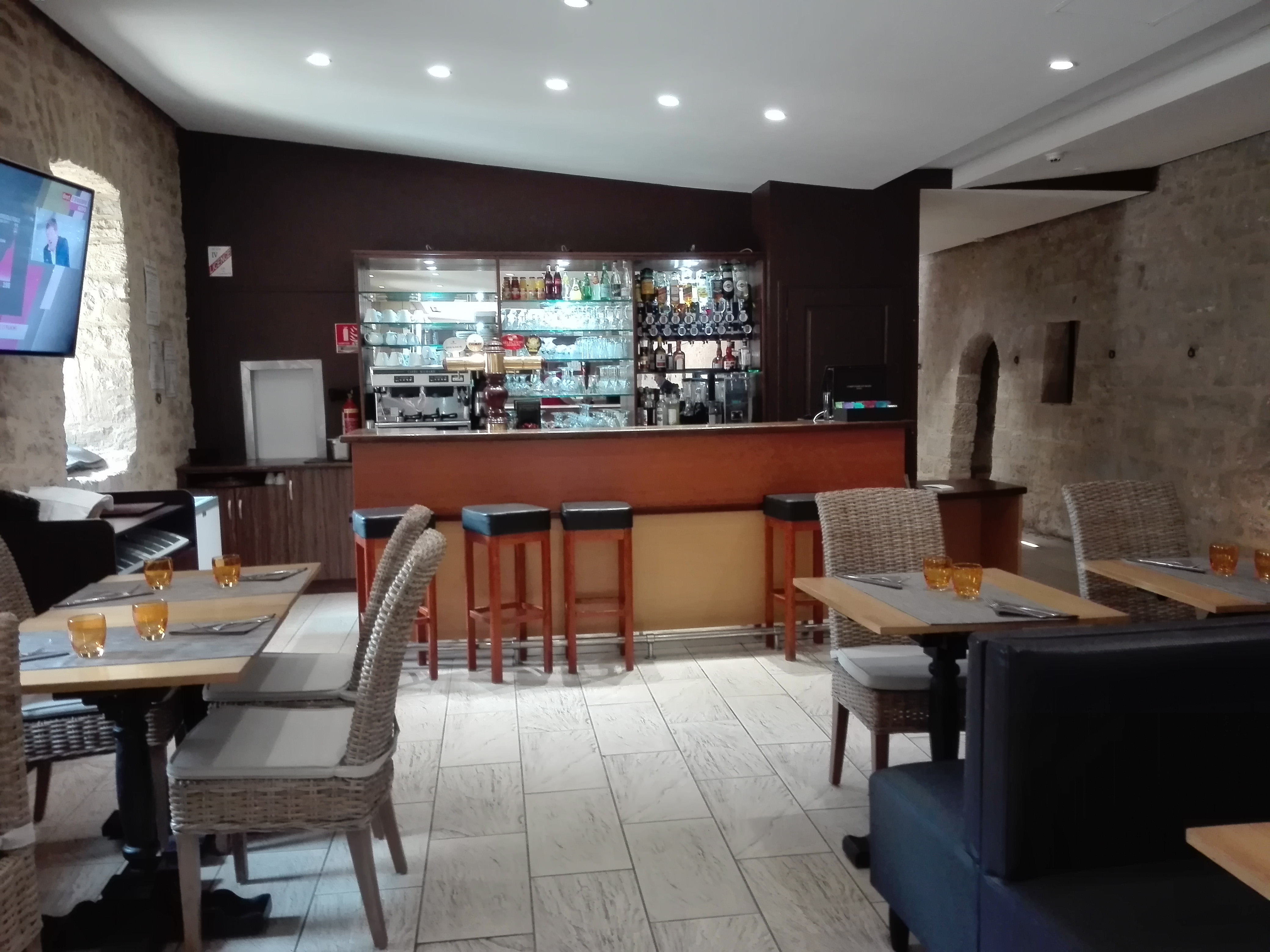 Je suis venue pendant le festival médiéval. La terrasse et le bar étaient soi-disant réservés aux clients de l'hôtel, mais jamais de place, toutes prises par des gens de l'extérieur. La dame du bar n'arrivait plus à suivre à les faire partir. Les chambres sont bien. J'ai apprécié les WC séparés de la SDB. Un gros bémol : pas de mini bar, pour des raisons d'écologie. Enfin, sauf dans les suites, l'écologie ne va pas jusqu'à là. Quant au petit déjeuner... Fort peu de choix, charcuteries et fromages industriels, fruits pas mûrs... Ne mérite pas les 4 étoiles.