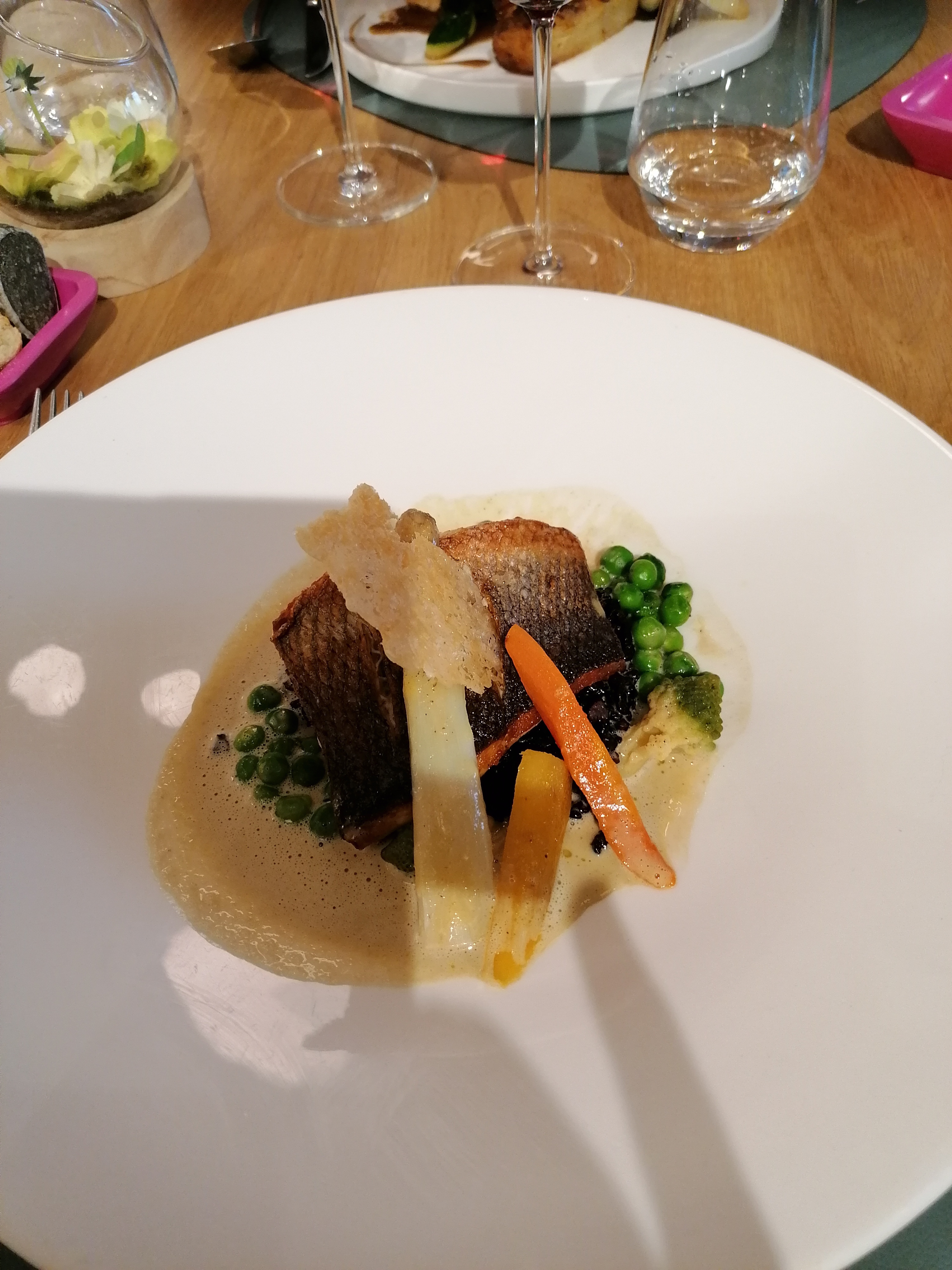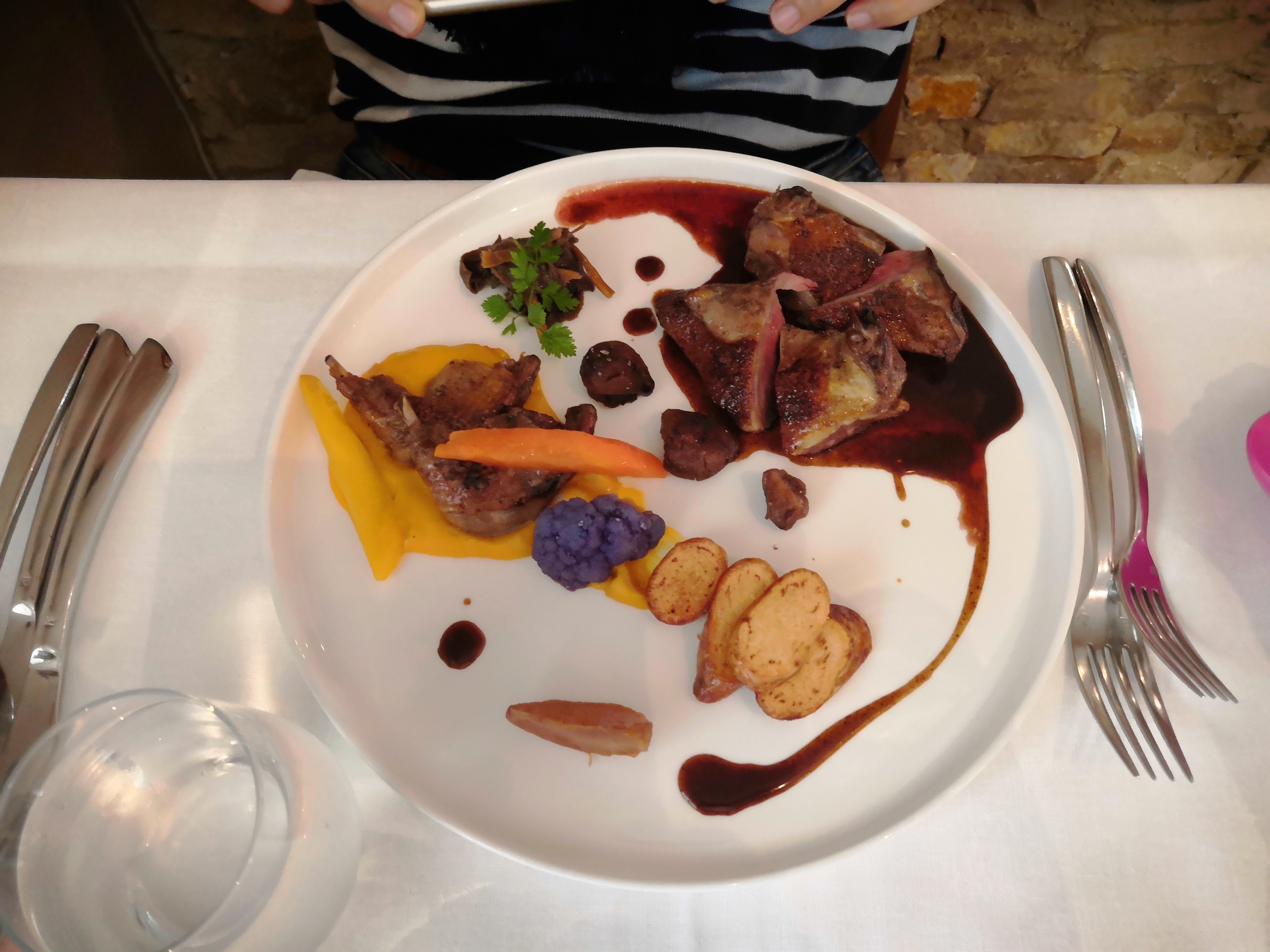 Hôtel charmant, chambre spacieuse et rénové, propre. Cuisine recherchée, excellente. J ai pris du bar en croûte et mon compagnon du veau. C était délicieux et rapport qualité prix bon . Par contre , les vins sont très chers alors qu on est dans la région.