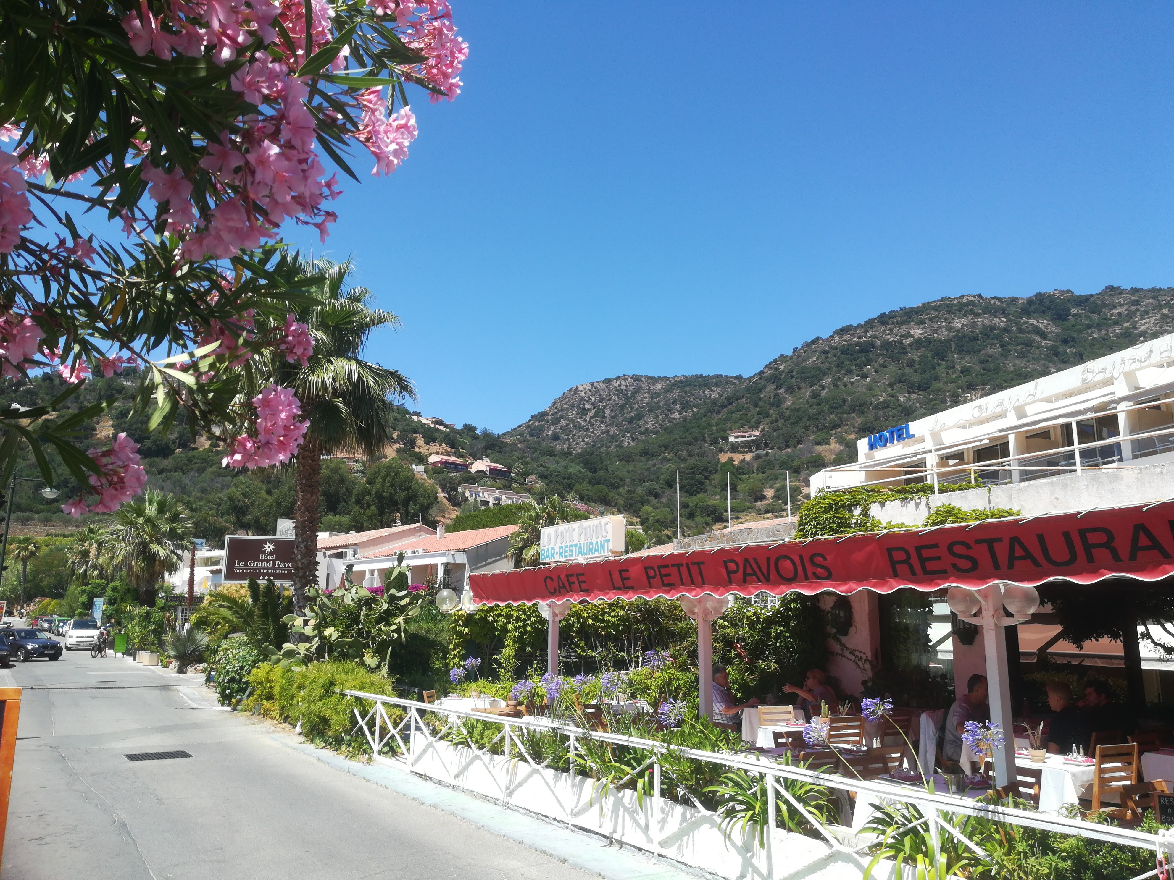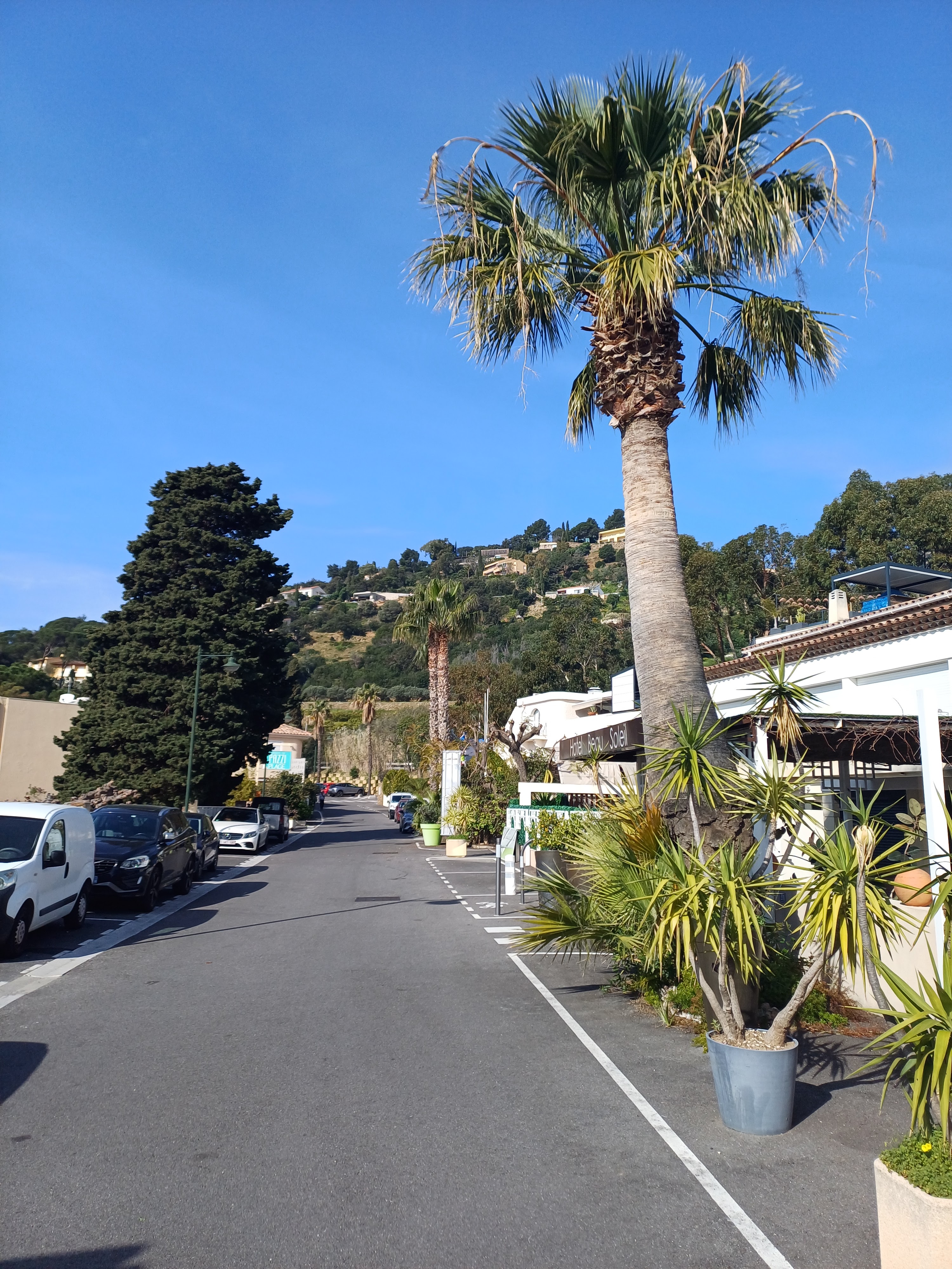 Hôtel entre la route et Presque face à la mer même si vous ne la voyez pas. A 10 minutes du levandou. Dans une zone de maisons d'été et d'hôtels. Chambre très agréable avec une petite terrasse qui nous a permis de profiter de la pluie.