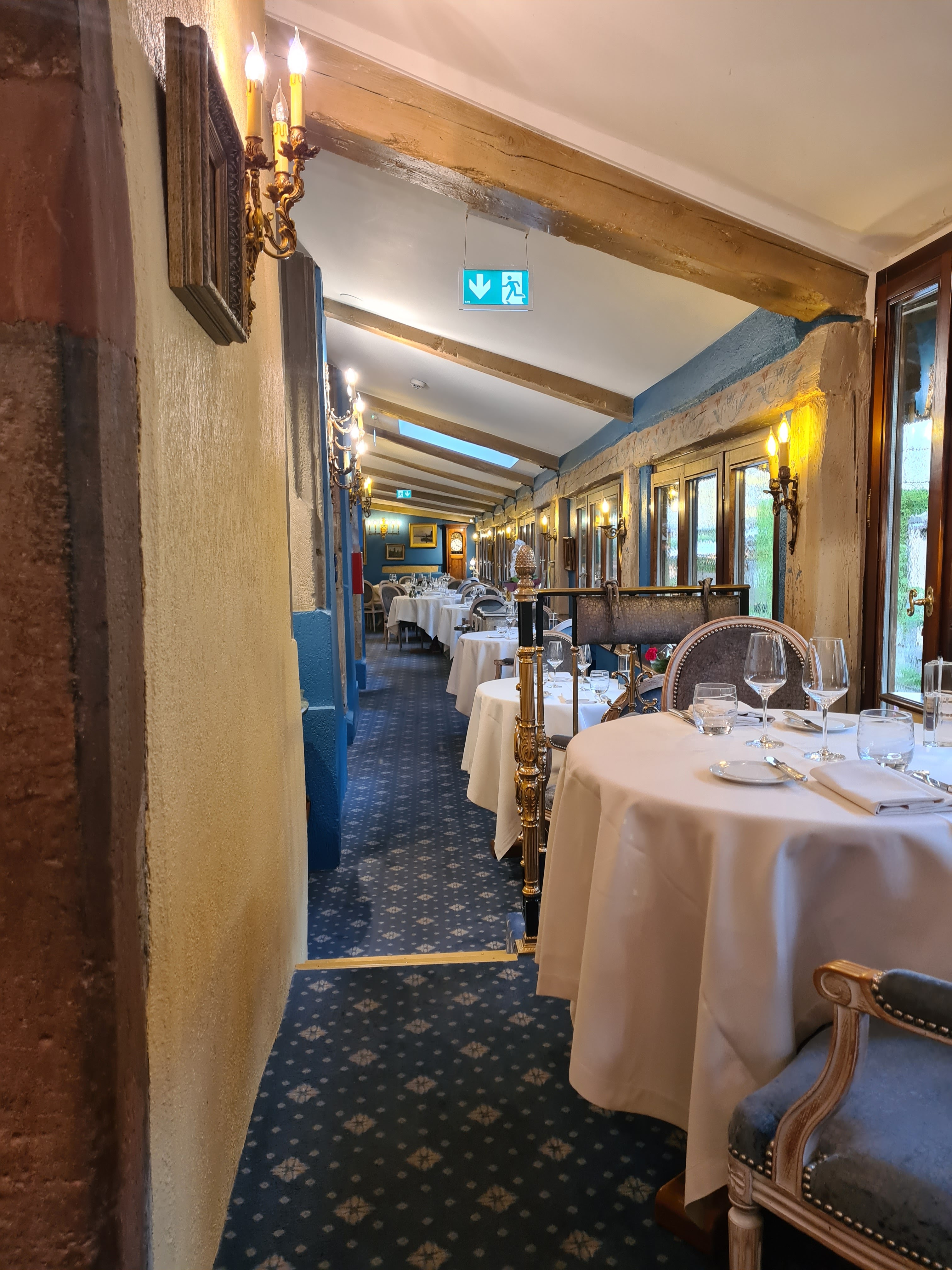 Très bel endroit, très bien situé avec beaucoup de charme. Très propre et le service est aimable. Dommage que la chambre 35 à 235€ la nuit est un peu trop petite et sans aucune vue. Il faut monter sur une chaise pour apercevoir de cette chambre sous les toits la rivière en contrebas. En revanche je note la belle qualité de la literie et les équipements à disposition : Bouilloire, thé, café et bouteille d'eau. Salle de bains refaite avec balnéothérapie. Un regret, baignoire très haute et très glissante non adaptée à une personne âgée. Il faudrait prévoir un petit tapis antidérapant à disposition. Le restaurant est de qualité mais je m'attendais à mieux au vu des commentaires. Foie gras cuit avec des épices. Goût trop prononcé pour moi pour du foie gras. Se rapproche plus du goût et de ka texture d'un pâté de qualité que d'un bon foie gras mi cuit subtilement parfumé. Le filet de loup est servi avec une pointe de caviar si discrète dans l'assiette que cela ne satisfait que la vue. Ce filet de bar aurait gagné à être grillé sur la peau. Impression de cuisson vapeur. En revanche l'agneau était excellent tout comme le soufflé au chocolat. Le petit déjeuner est excellent, copieux et varié, et la vue du restaurant sur la rivière est très agréable. Cependant mauvaise surprise au moment de payer, on nous compte le petit déjeuner à 19€ au lieu de 15€ car nous avons indiqué la veille à notre arrivée et non au téléphone au moment de la réservation que nous le prenions. Non précisé au moment dea réservation. Au vu du prix de la chambre et du restaurant, j'ai trouvé cela inélégant pour ne pas dire mesquin. Petite pointe d'amertume au moment de partir. Dommage.
