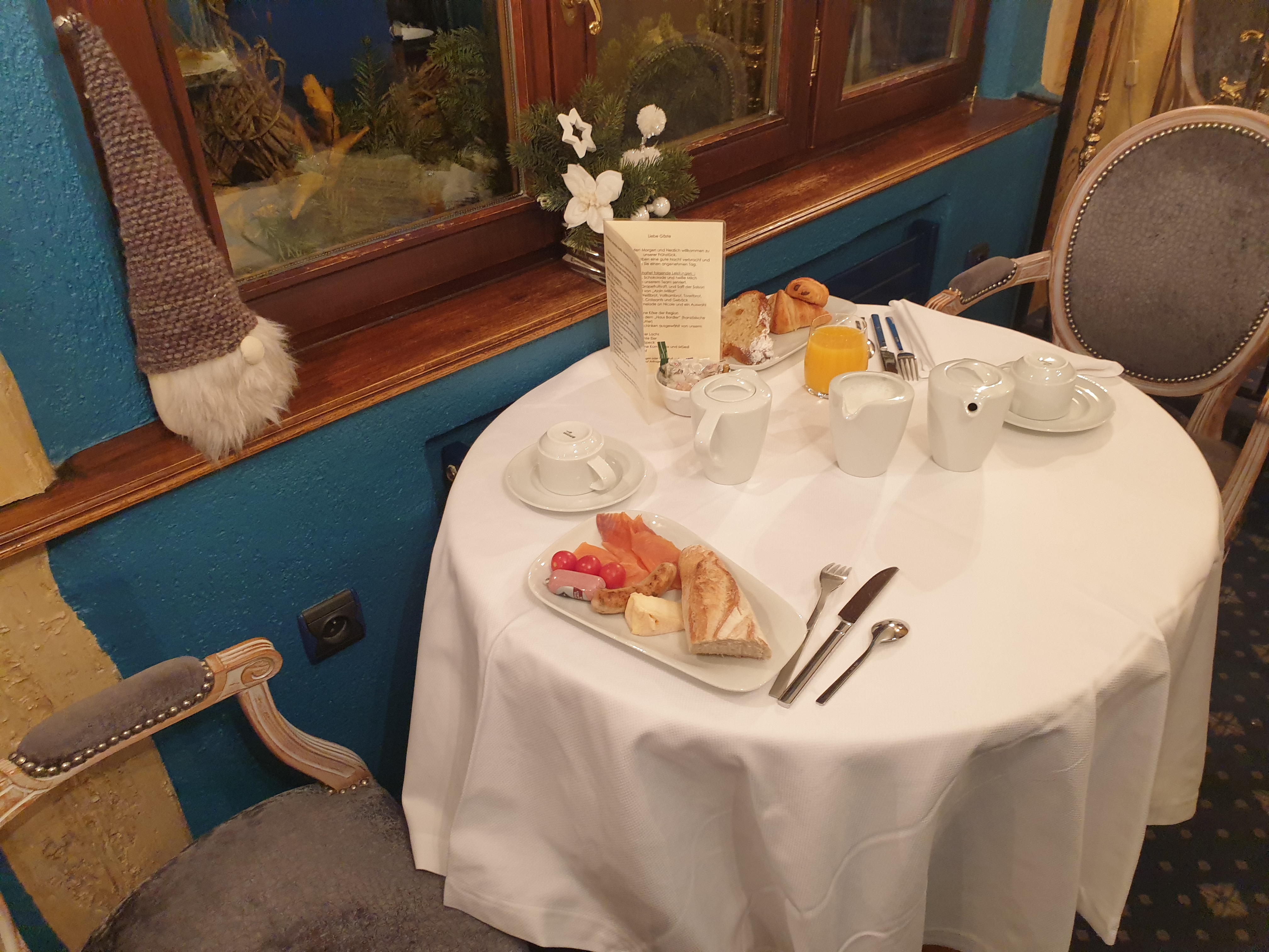 Un hotel qui rentre dans l'esprit des fetes de fin d'année, dès l'arrivée le decors vous transporte dans l'ambiance de Noel. Les chambres sont superbes, le cadre est relaxant. Le petit dejeuner est excellent, et le service est sans reproche, un accueil avec le sourire qui est agréable dès le matin, donc un grand merci à ces dames qui s'assurent que la journée commence bien.