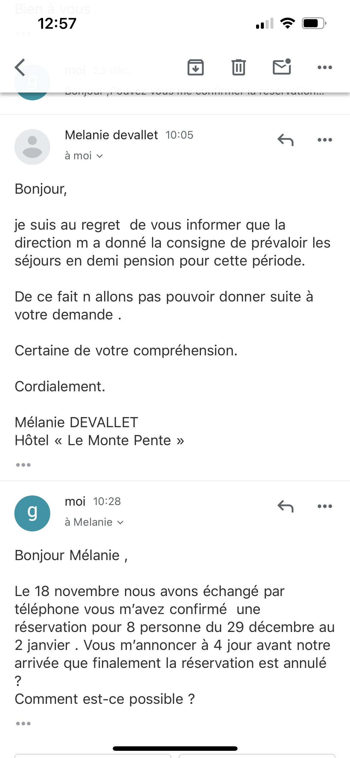 FAUX PLAN-MANQUE DE PROFESSIONNALISME Nous avons réservée le logement pour 7 personne du 29 décembre au 2 janvier , réservation confirmé le 18 novembre par Mélanie Devallet , le 24 décembre Mélanie nous a ANNULÉ la réservation à 4 jours de la date de notre arrivée. Malgré les PLUSIEURS RELANCES envoyée par mail depuis le 18 novembre ce que aujourd’hui que je reçois un retour un REFUS. Nous nous retrouverons sans logement pour fêter le nouvel an heureusement que l’agence FONCIA DE VARS nous a sauvé la mise . MANQUE DE PROFESSIONNALISME MANQUE DE RESPECT ENVERS LES CLIENTS.
