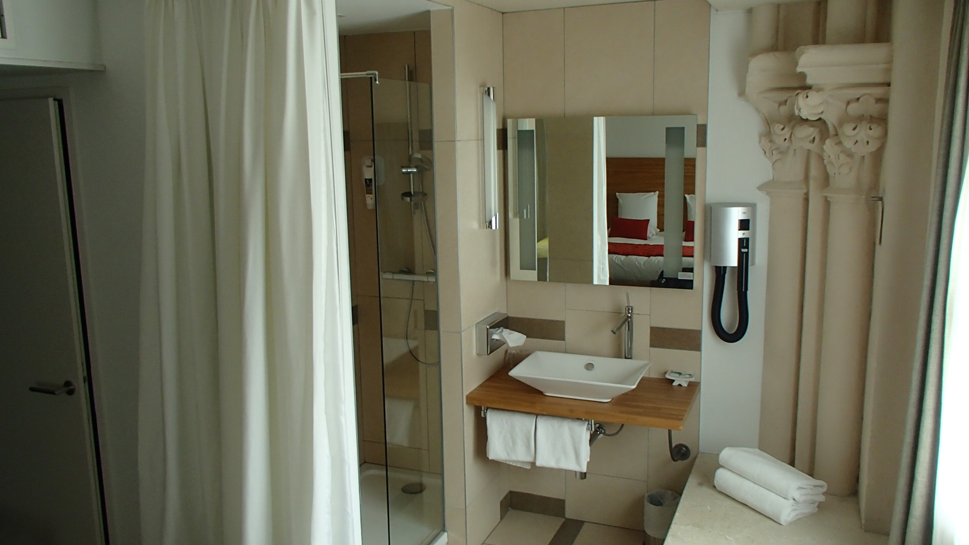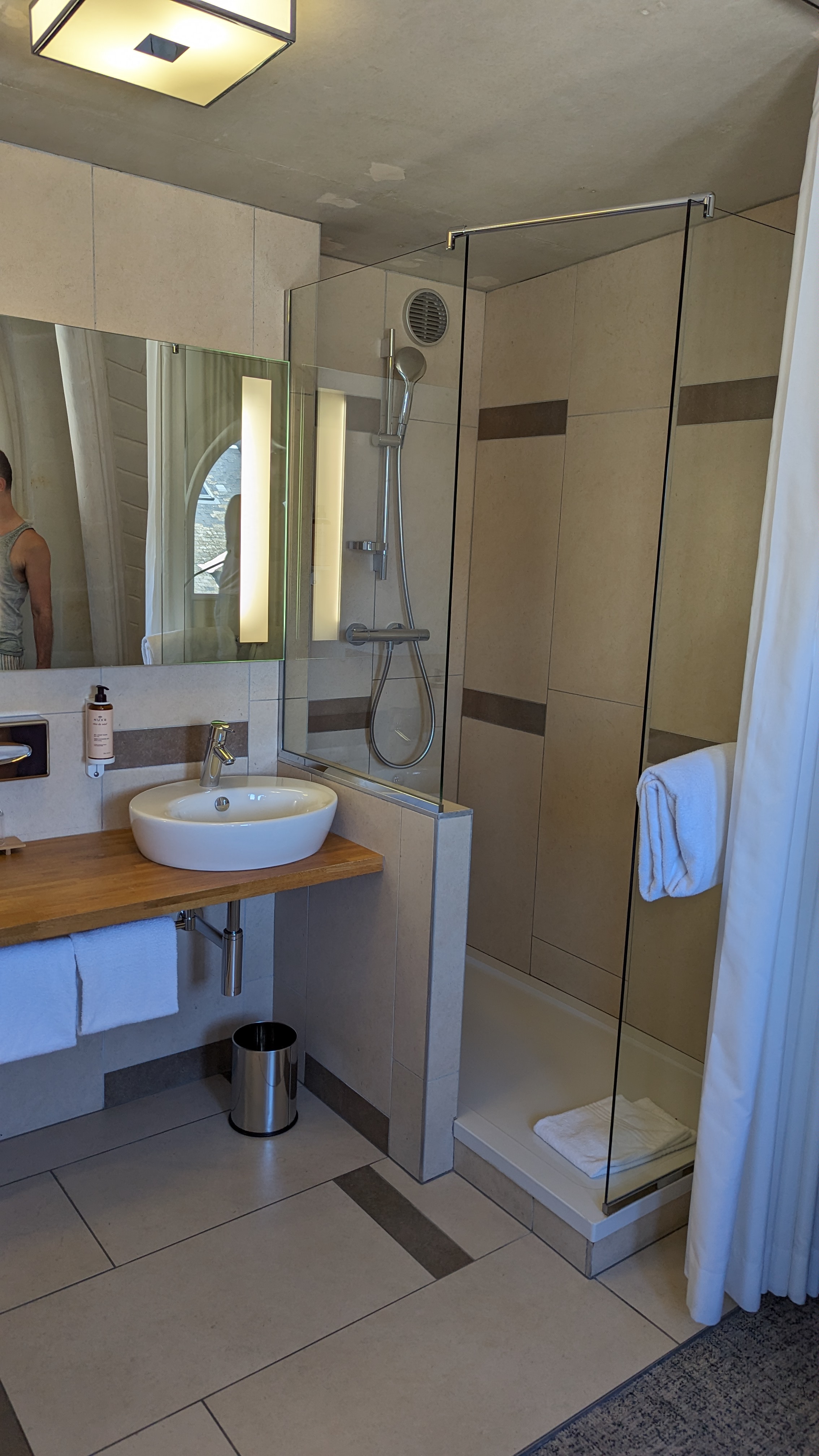 Malgré la gentillesse et le professionnalisme du service, expérience plutôt décevante : la chambre est en réalité très bas de plafond, beaucoup de contreplaqué (ou béton brut ?) et peu de vision du bâtiment lui-même… hormis la magnifique salle de restaurant…. Salle que nous n’avions pas testé, car le petit déjeuner est servi dans un coin de l’étage supérieur, de qualité plus « ibis » que mercure. Mon avis est peut-être subjectif pour cette nuit en pleine canicule, sans clim au niveau de la salle du petit déjeuner