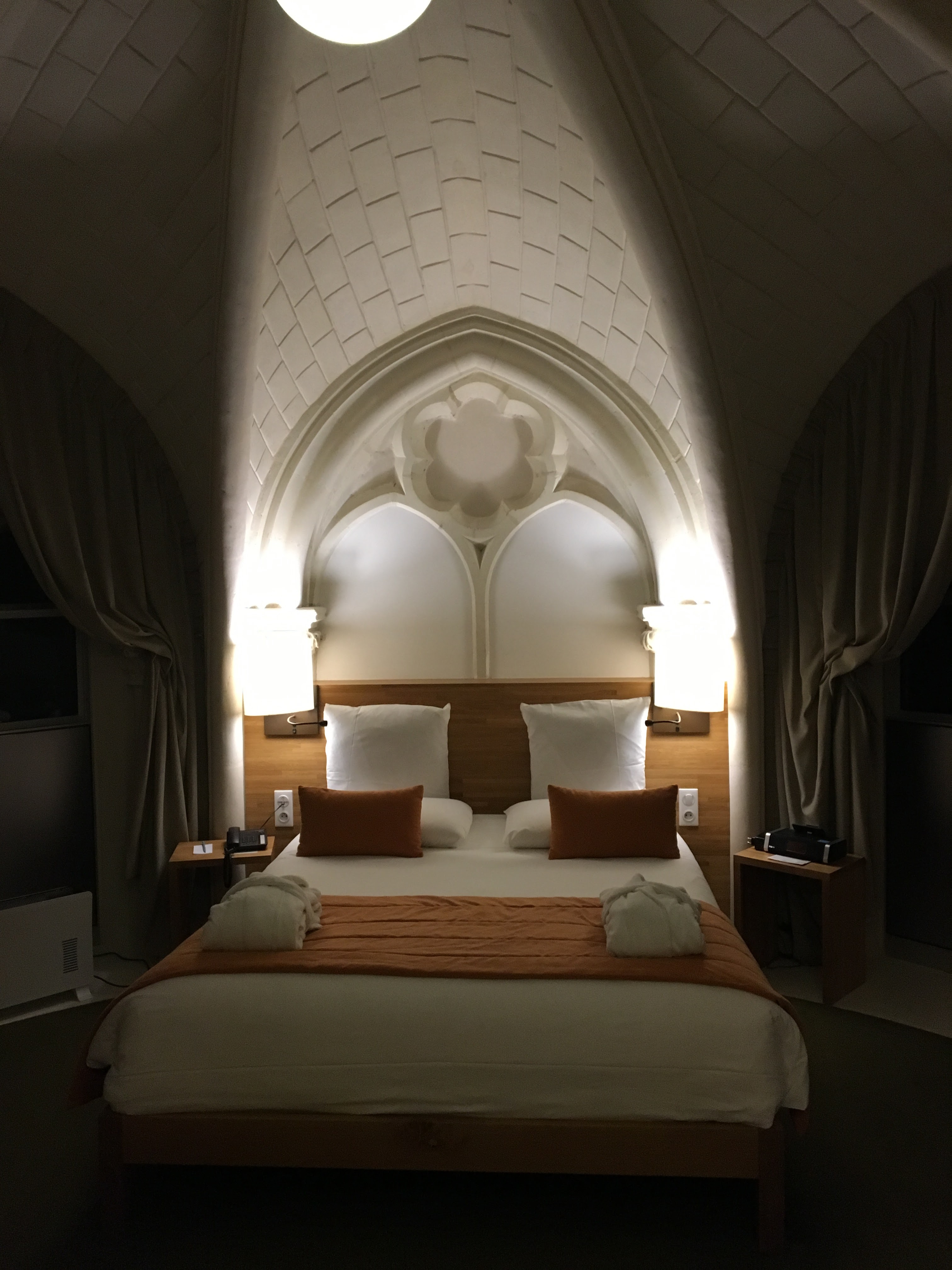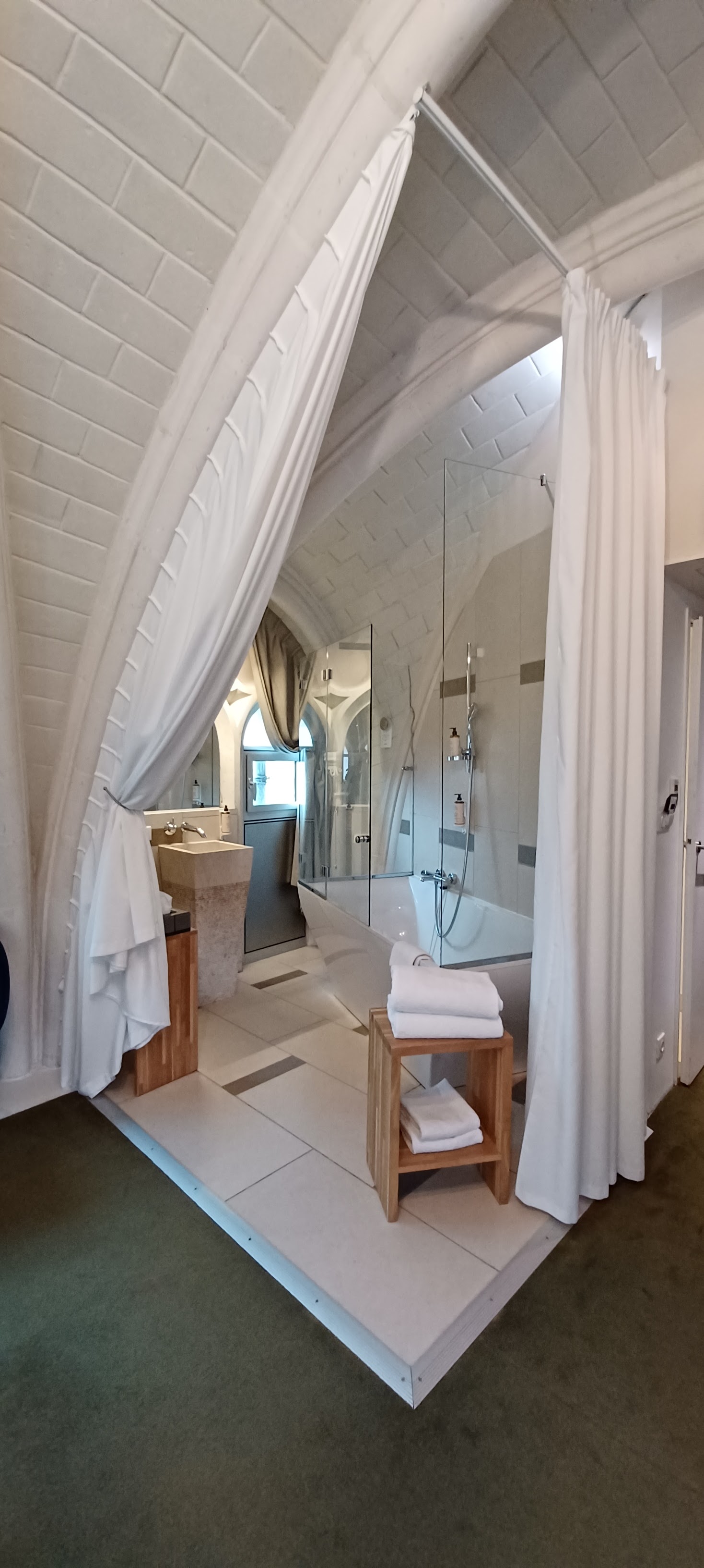 Magnifique reconversion d une ancienne chapelle en hôtel atypique . Superbe chambre spacieuse sous ogive,décorée avec goût. Dommage que l espace salle de bain ne soit séparé que par des rideaux. Service attentionné et professionnel tant à la réception qu au restaurant Les Archives.