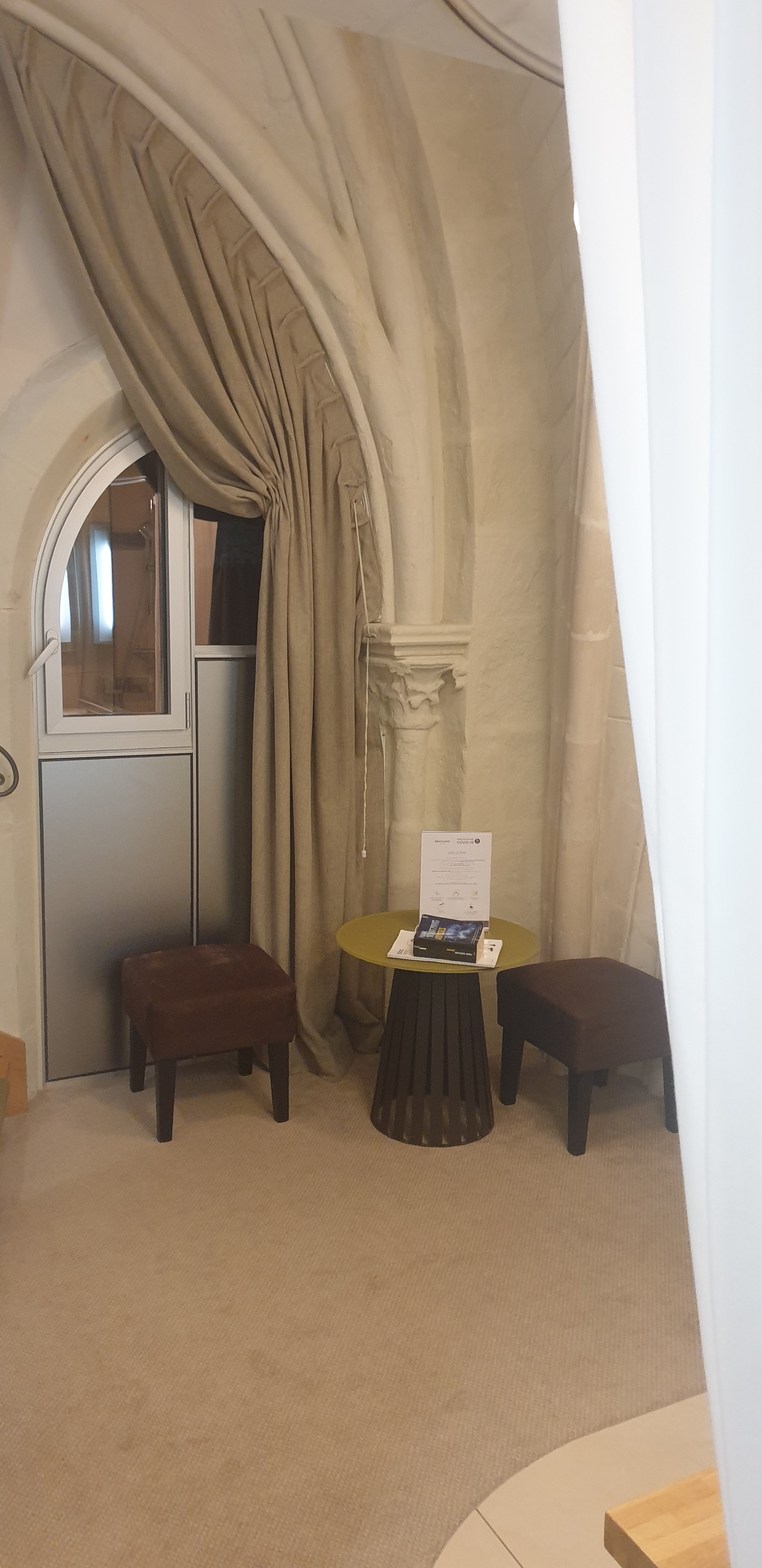 Pour y avoir été plusieurs fois, l'hôtel Mercure présente de belles suites avec le souci du détail dont le décor est plus que dépaysant. Les chambres sont également à la hauteur. Le room service est soigné et avec l'accès direct au restaurant sélect Les Archives vous n'avez pas à sortir à l'extérieur. L'habilitation dans cette ancienne abbaye est très réussie. Je vous recommande la belle suite avec les ogives qui est envoûtante mais j'aime aussi celle sous le clocher (ma photo). Un bémol sur les patères qui sont soit pas assez nombreuses soit mal placées et le parking payant.