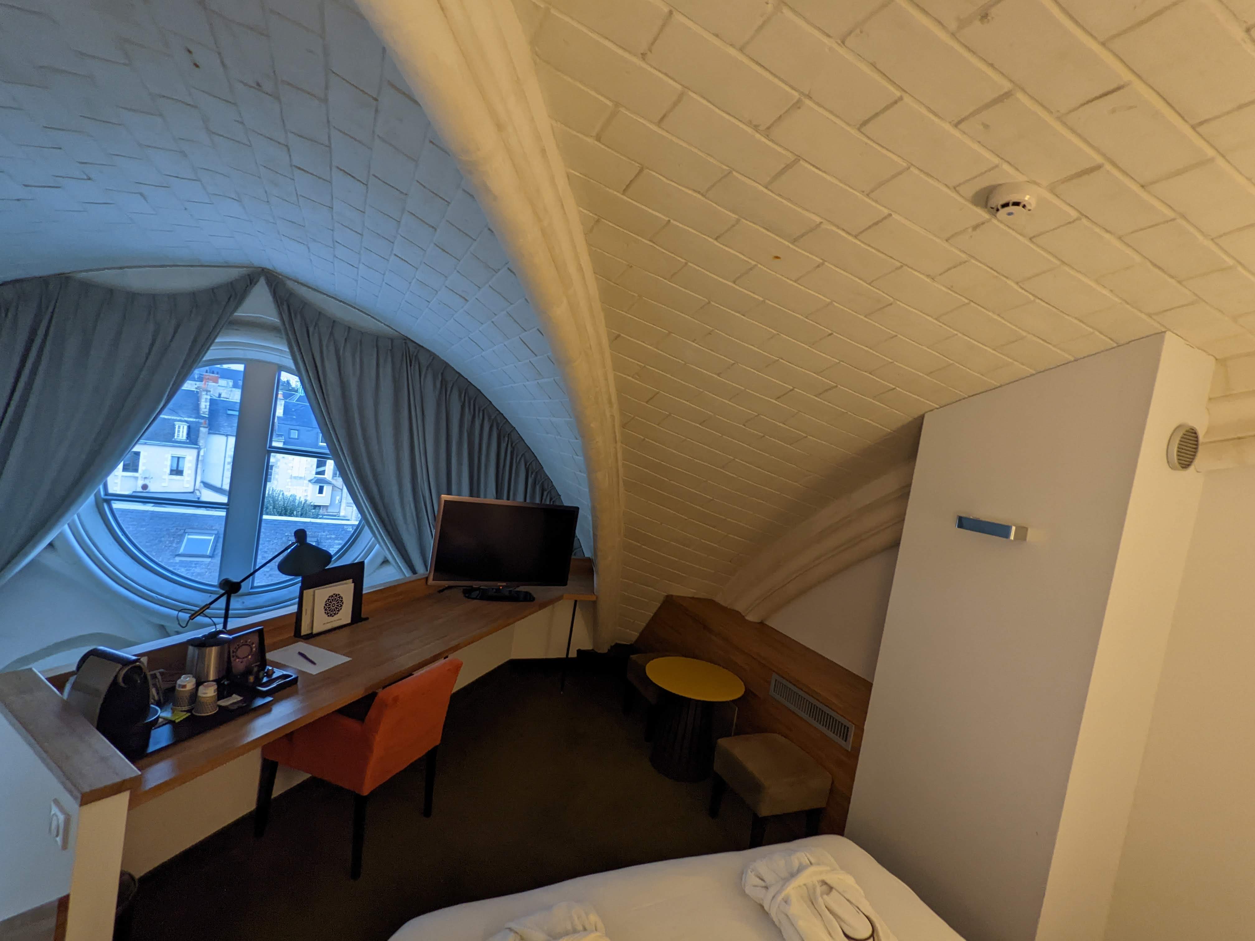 Excellente situation pour cet hôtel dans le centre de Poitiers. Coup de coeur évidemment pour l'originalité du décor. L'hôtel se trouve dans une ancienne chapelle. J'ai apprécié le sourire et le professionnalisme de l'accueil, l'excellent petit-déjeuner avec large choix et le calme dans les chambres.
