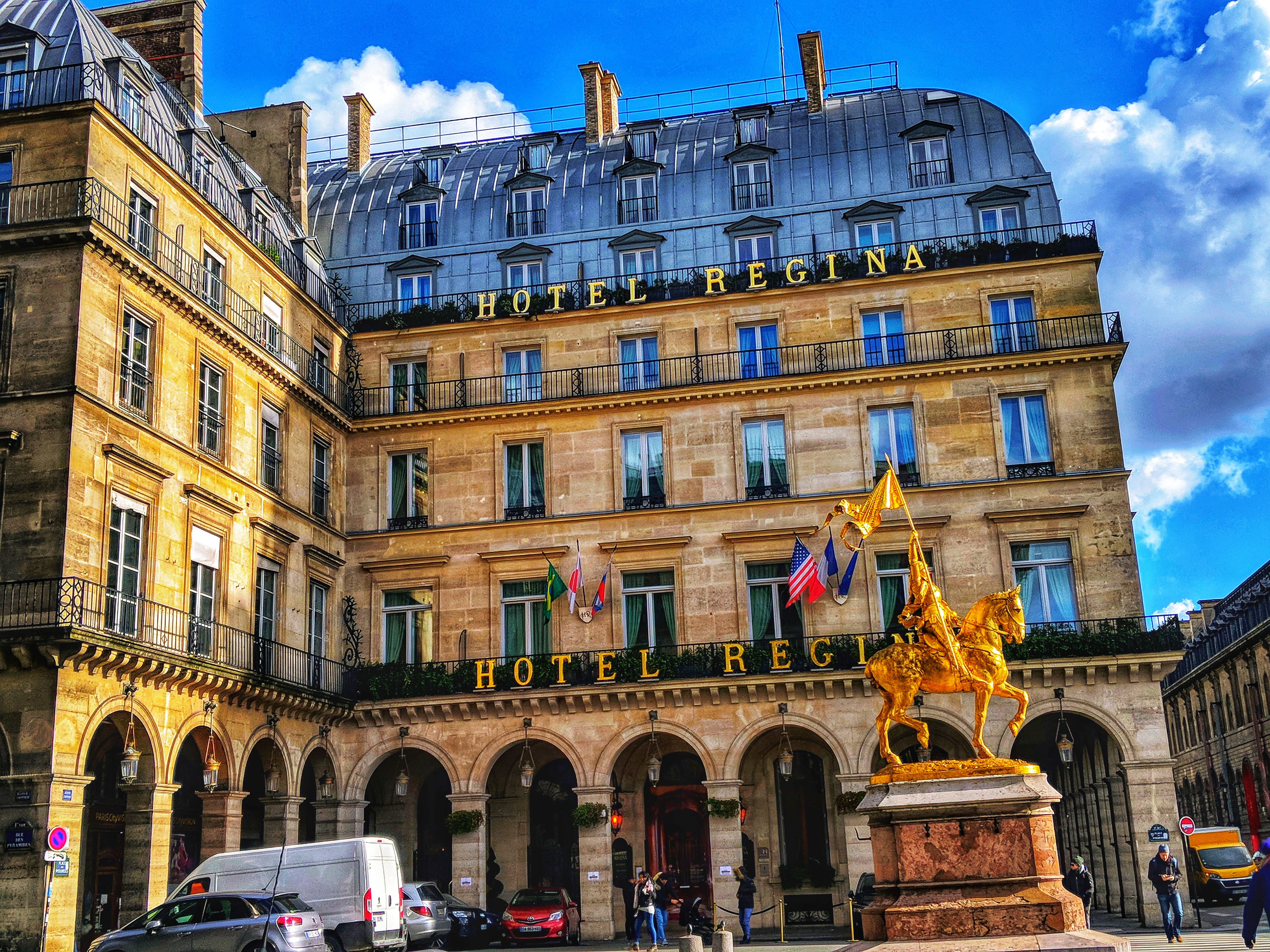 Le Regina, un des plus anciens hôtels de Paris. L'hôtel de tupe art nouveau a ouvert pour la première fois ses portes en 1900, plus précisément pour l'exposition universelle. Le lieu cependant existait déjà mais sous une autre forme puisqu'il s'agissait auparavant des écuries royales du Louvre. L'hôtel a su préserver son authenticité et l'intérieur est vraiment splendide. Il est dommage qu'il ne soit pas suffisamment mis en valeur depuis l'extérieur. Tout à l'intérieur respire une certaine sérénité. L'établissement a su maintenir un bel équilibre tout en préservant son image d'origine. D'ailleurs, plus d'une vingtaine de films ont été tournés en ce lieu (entre autres la mémoire dans la peau avec matt damon, ou bien red2 avec bruce willis...). L'autre magnifique avantage est l'emplacement de l'hôtel. À moins de 3 minutes à pied de, la place Vendôme, du jardin des tuileries, du musée du louvre. À quelques minutes à pied de la place de la concorde et de l'opéra Garnier, et j'en passe. Je vous recommande au coeur de l'hôtel Regina, le restaurant boudoir, un restaurant dans un jardin incroyablement calme et d'un silence absolu hormis le clapotis de la fontaine qui s'y trouve. Bref, un lieu hors du temps et chargé d'histoire.