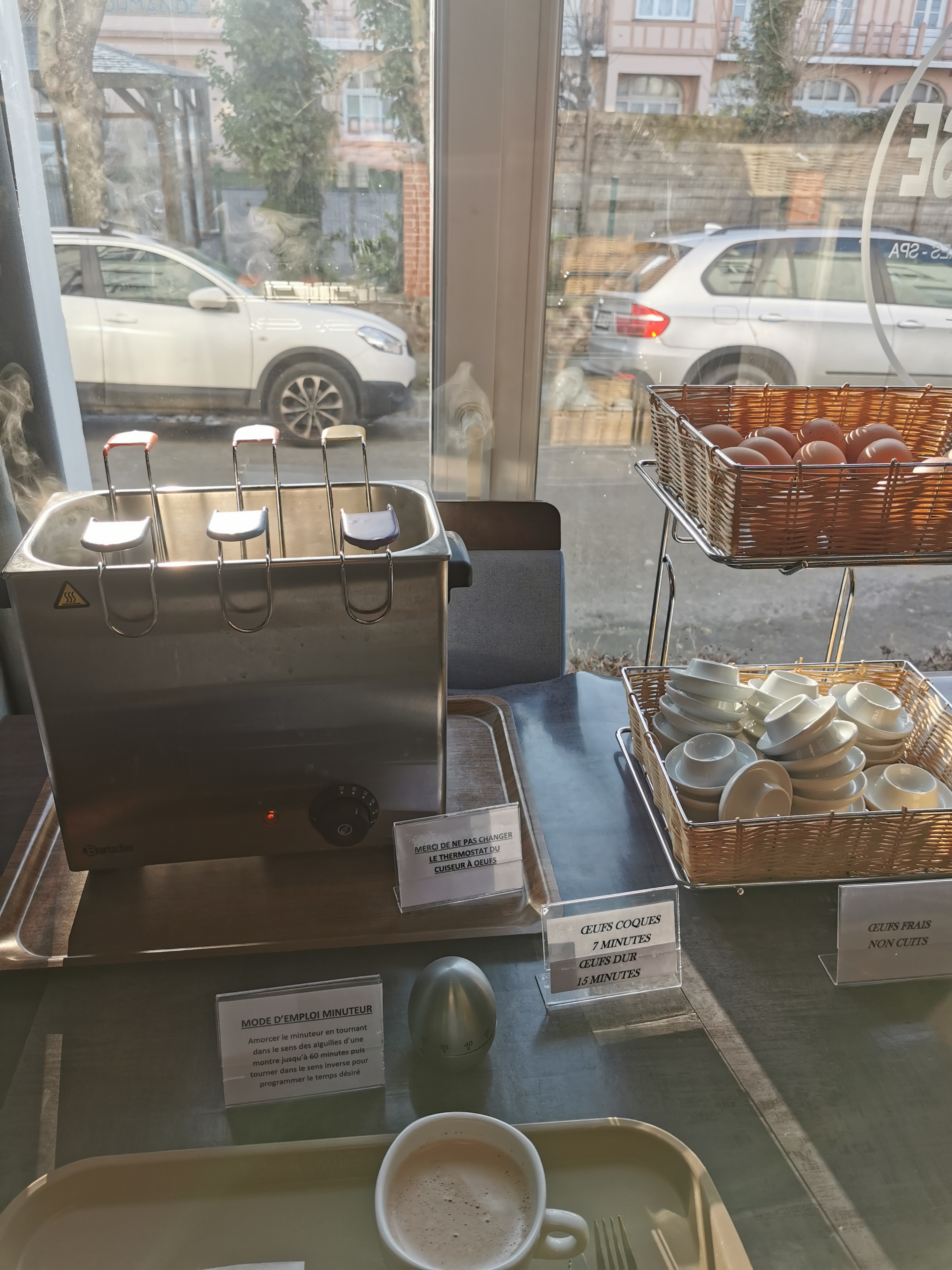 Accueil très froid du personnel au petit déjeuner à 9h55. Impossible de joindre la réception à 9h30 pour connaître les horaires et bien évidemment plus grand chose au buffet hormis café et mini pain au chocolat et plus d’appareil pour réchauffer les gaufres. DÉCEVANT