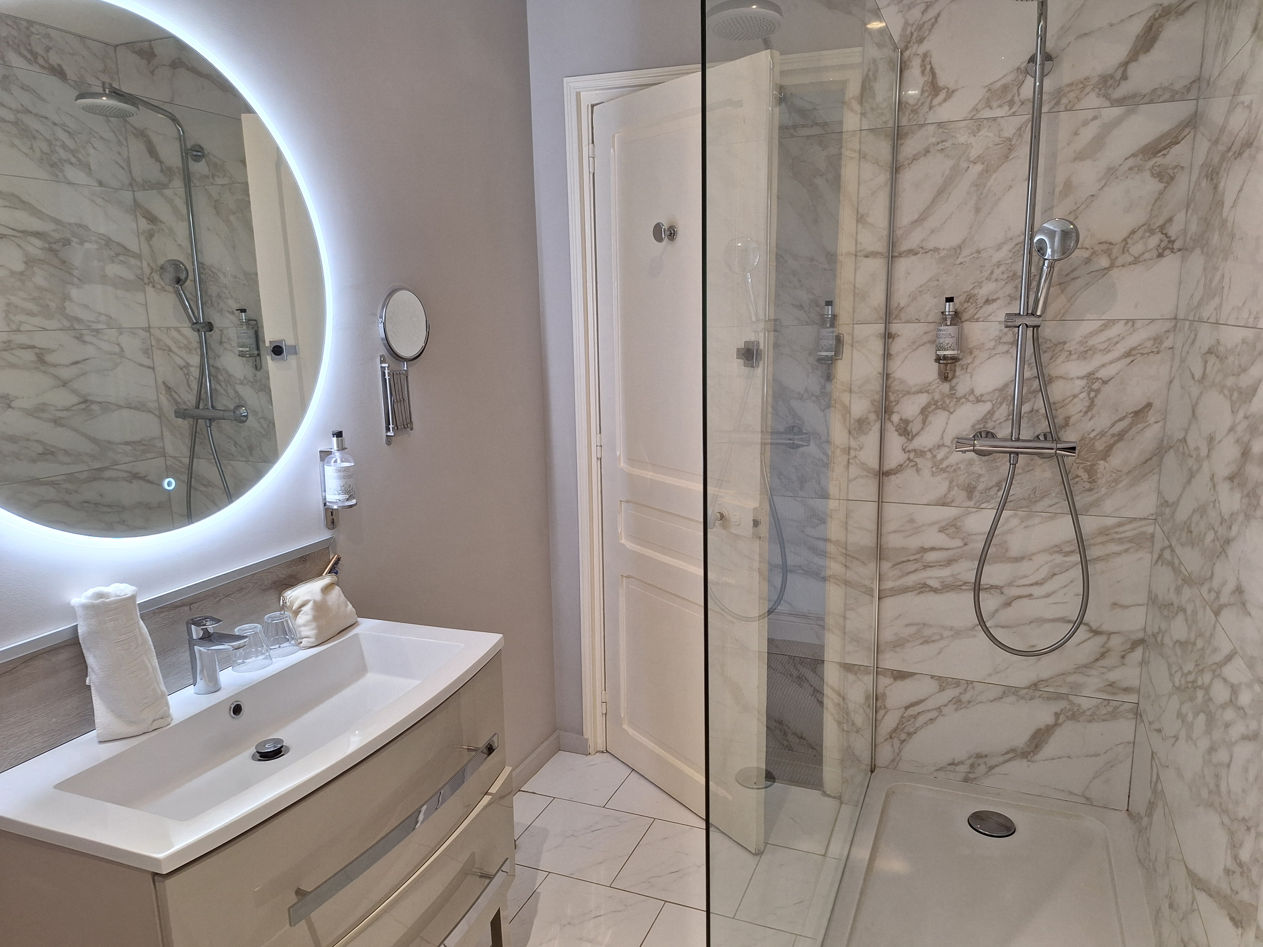 2 nuits parfaites au niveau literie. Personnel agréable et très bon petits déjeuner copieux. Insonorisation négative avec chambre du dessus quand il y a une personne dans la salle d'eau . Pour le prix imperfection. Plus de joints de carrelage à l'entrée salle de bain . Et joint moisi très noir au niveau ouverture cote porte intereure douche.. J'ai des photos comme preuve . Possibilités d'un geste commercial. !!