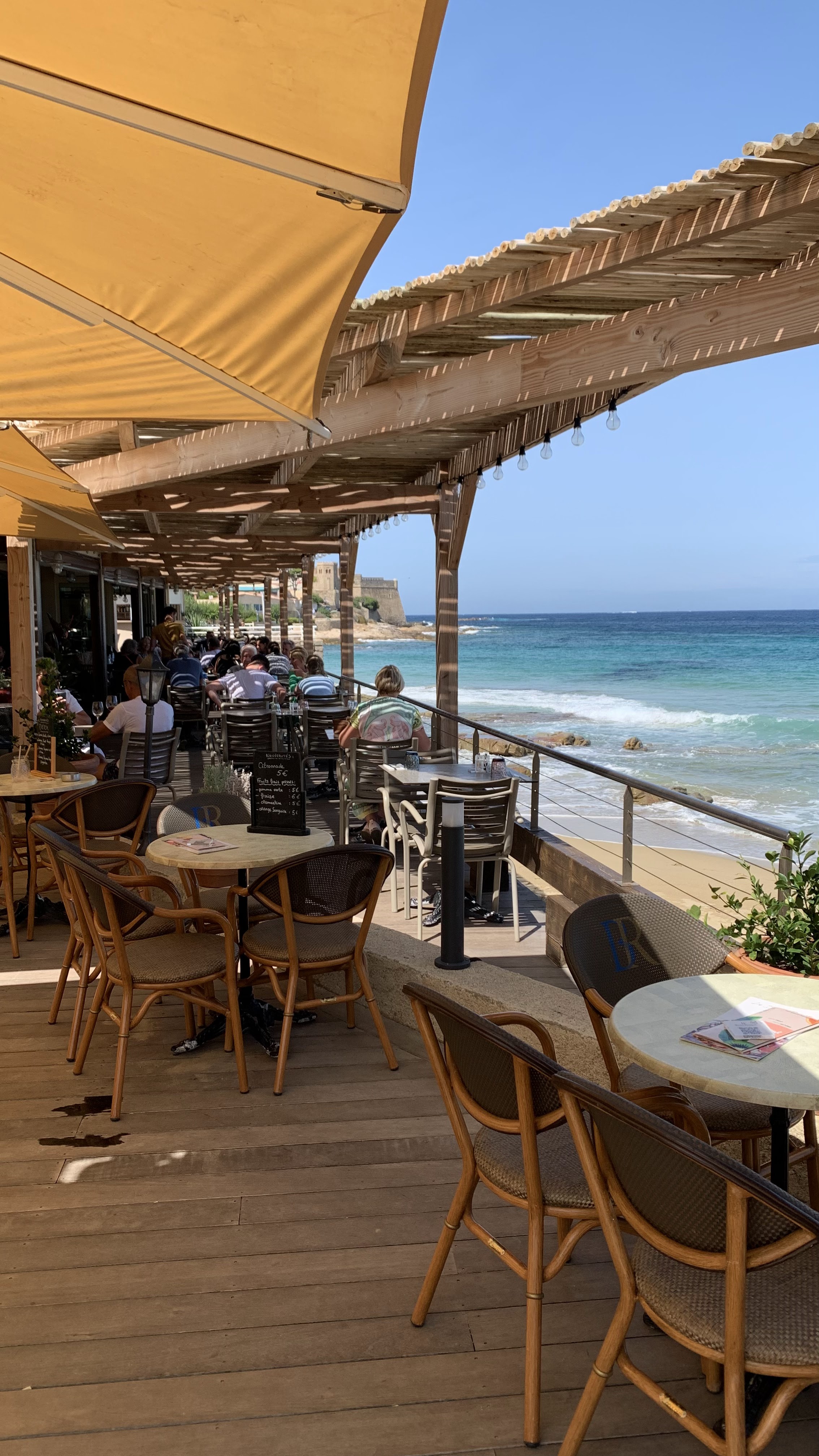 Une terrasse en bord de mer avec une vue magnifique, rien que pour ça il faut s’arrêter, mais également pour y manger. Nous avons passé un très bon moment, des serveuses souriantes, agréables et de bons conseils. Pas trop d’attente (nous sommes venu en semaine à midi pétante, pensez à réserver, les tables se sont vite remplies). Les prix sont corrects et nous avons eu de belles assiettes, je conseille la salade algajolaise pour varier les plaisirs. Une belle carte de coupe glacée que nous n’avons pas testé (ce sera l’occasion de s’arrêter un après midi!) Un arrêt (boisson, repas ou glace) à ne pas manquer dans ce joli village!