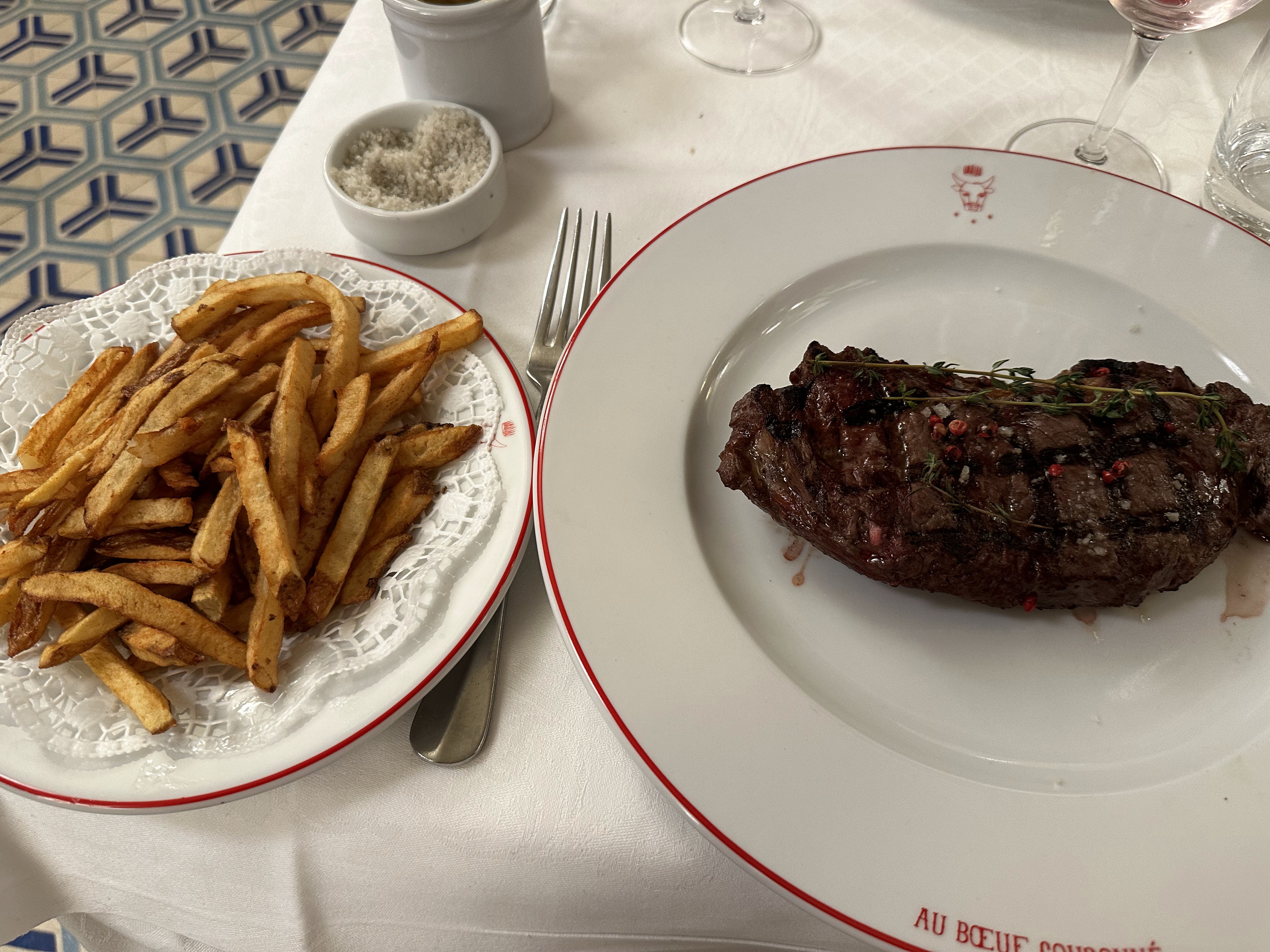 Onglet servi à point pour une commande saignante, frites sans grand intérêt. Pour le Bœuf couronné, ce serait pourtant ce qu’on attend : une viande parfaite et des frites un ton au-dessus de la moyenne