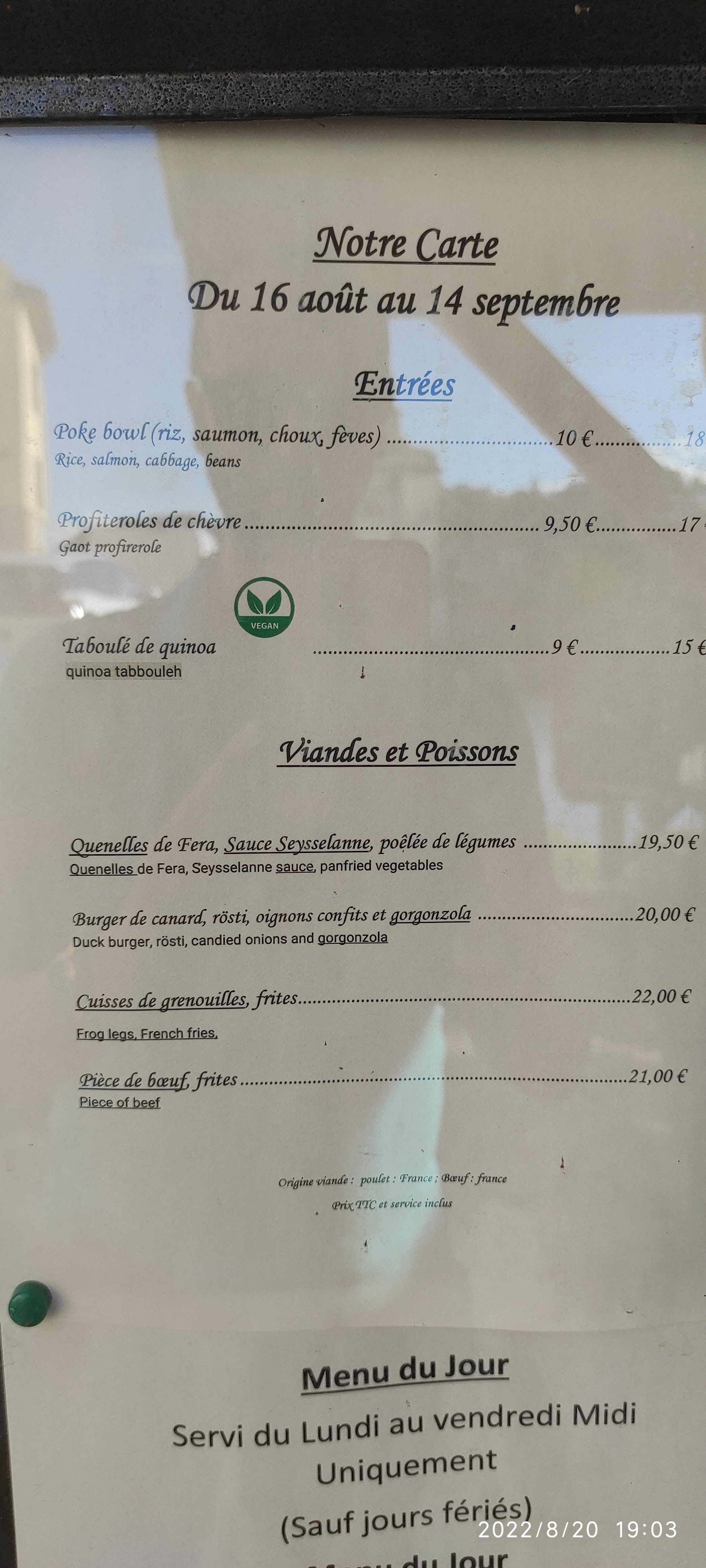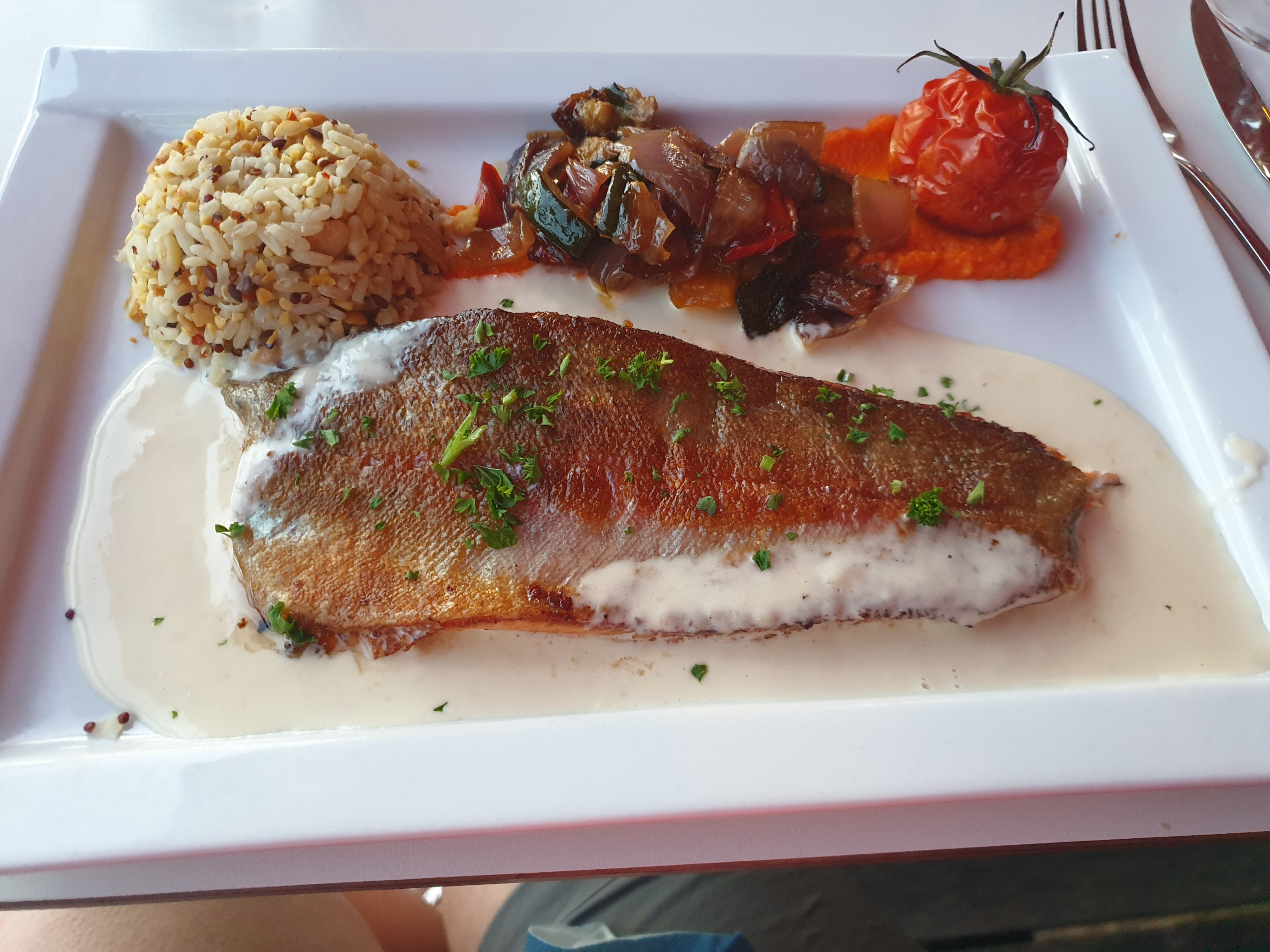 J ai mangé cabillaud avec une sauce aïoli qui était froide avec des légumes mi cuits un œuf et des crevettes qui n avaient rien à faire dans l assiette. Le tout laisse a désirer nous n y retournerons pas