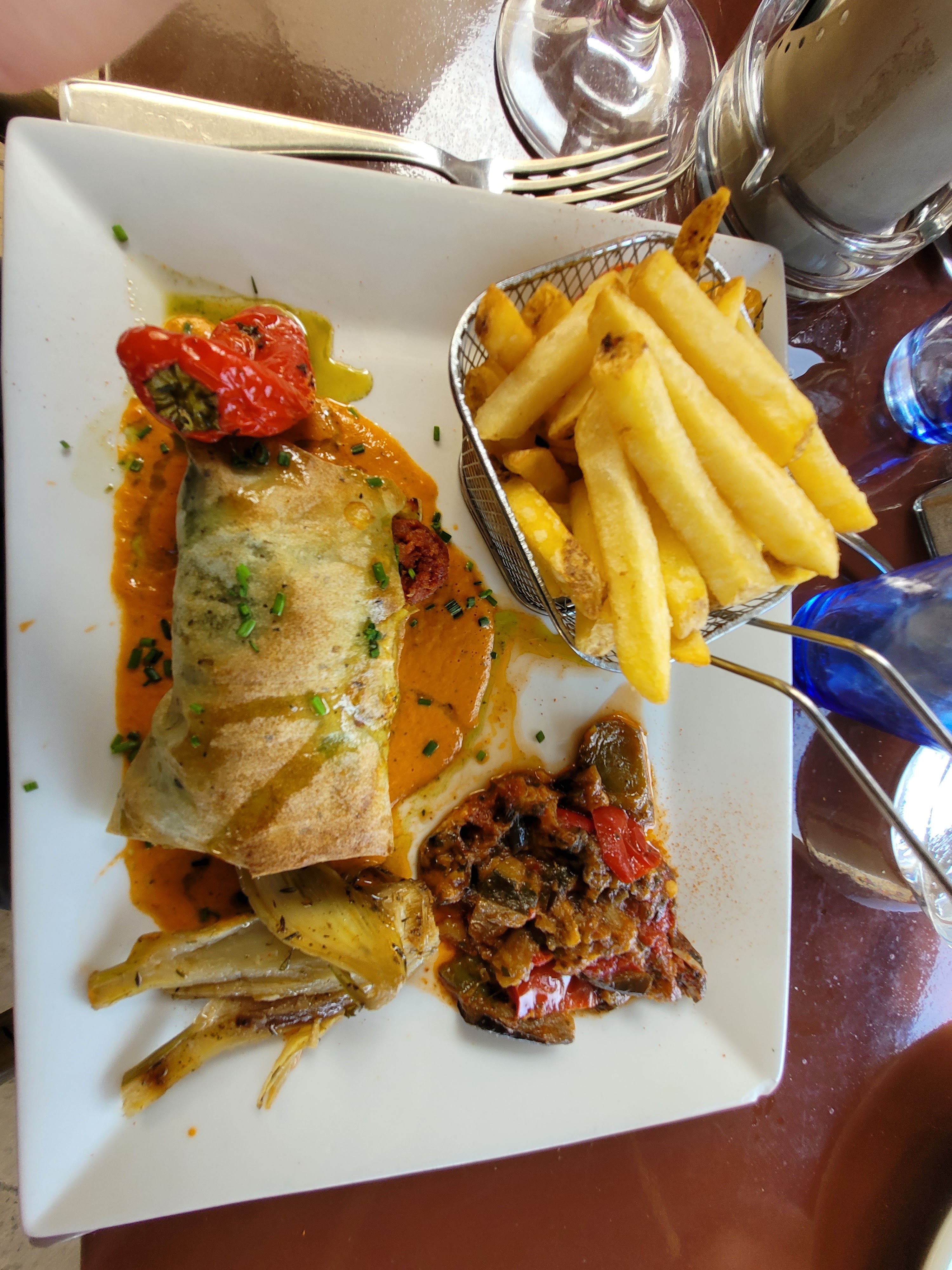 En terrasse aujourd’hui, très bon gardian de taureau, très beau cadre sur la terrasse ensoleillée , petit bémol pour le dessert coupe mont-blanc (marron chocolats )avec coulis de fraises… a la place de la crème de marron… pas compris