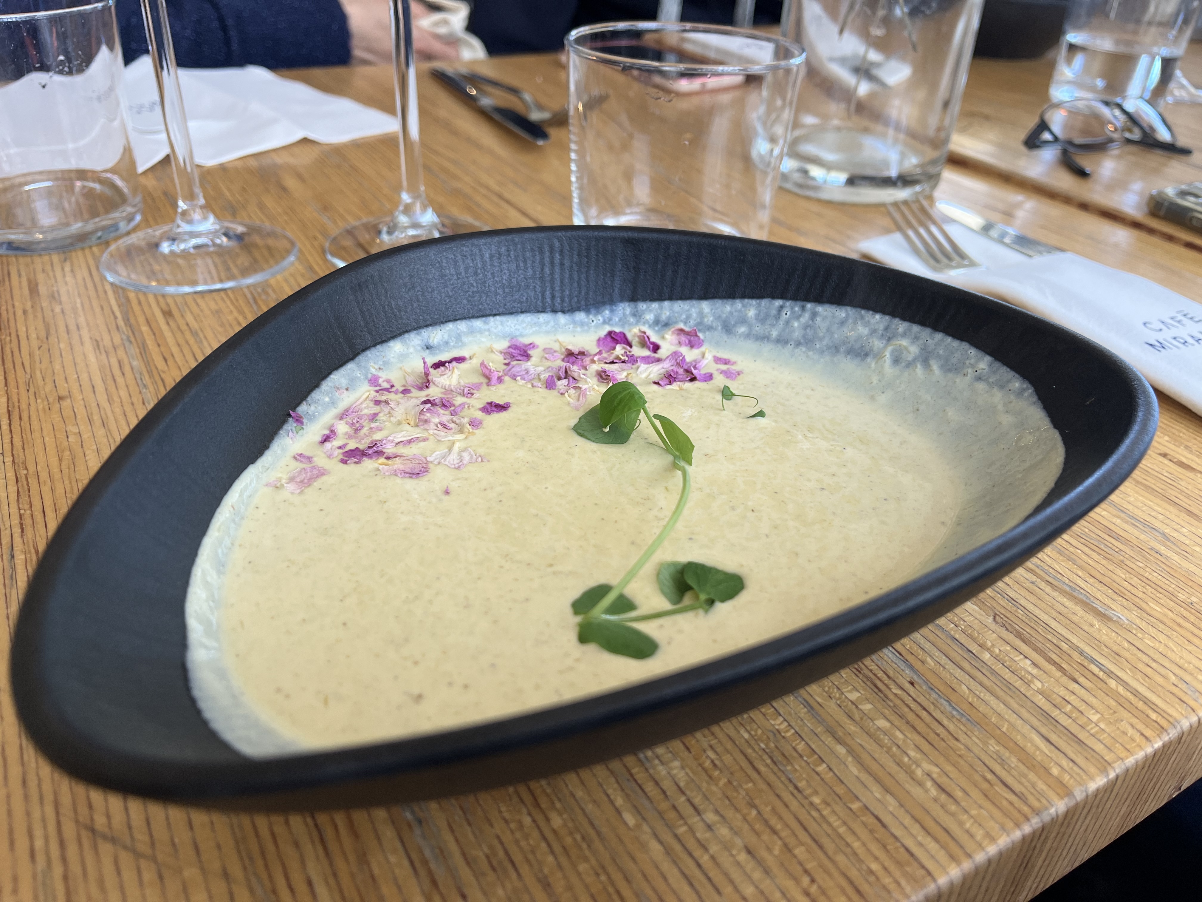 Une terrasse magnifique, quoiqu'un peu frisquette, mais la super idée 💡 de fournir des plaids, c'est super sympa... Une cuisine très bonne et hors du commun, comme le velouté de patates douces au curry et une tapenade de figues .... c'est la bonne découvert de la soirée... ne pas s'y arrêter et s'y asseoir serait une belle erreur... à refaire!!!!