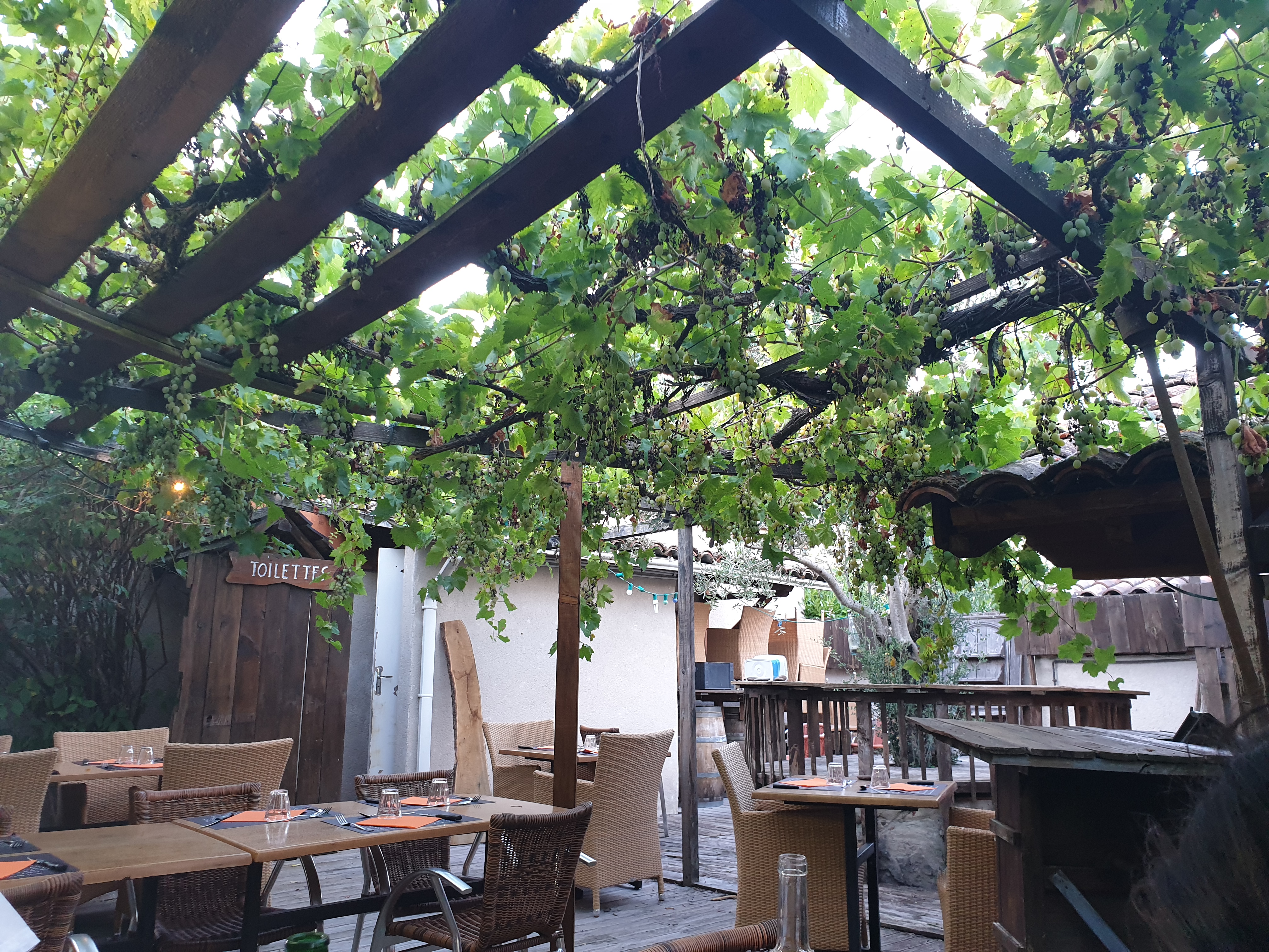 Restaurant très atypique j'ai adoré surtout la terrasse vous avez des petits coins sur des tonneaux sur une charrette ombragé j'ai passé un moment très agréable la cuisine est excellente un tarif abordable je recommande vivement dans un petit village il faut connaître pour y aller