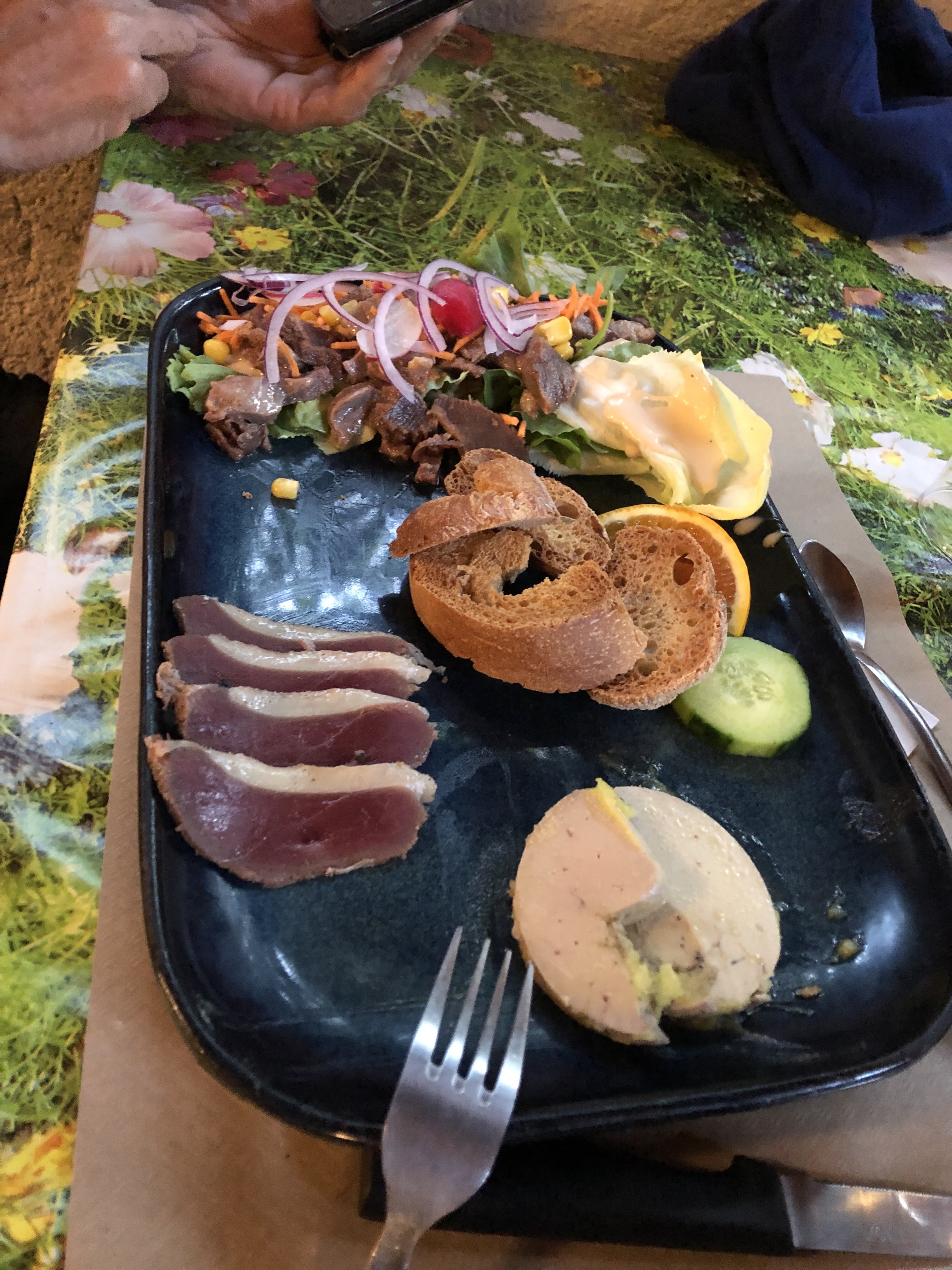 On a fait le resto en amoureux en terrasse en pleine découverte du lieu ! L ambiance est sympathique! J'avais peur au début qu'on soit attaqué par des moustiques mais non au final . Les plats sont copieux ( mais trop ... ) ils ont un vin blanc moelleux voisin au resto à ce que j'ai compris , il est juste delicieux , proche d'un coteau du Layon ! Le seul reproche que je peux leur faire c'est au niveah présentation des plats ... ma salade était juste bordélique. Première fois que je vois du gésiers couper en mille morceaux. Je vous recommande !!