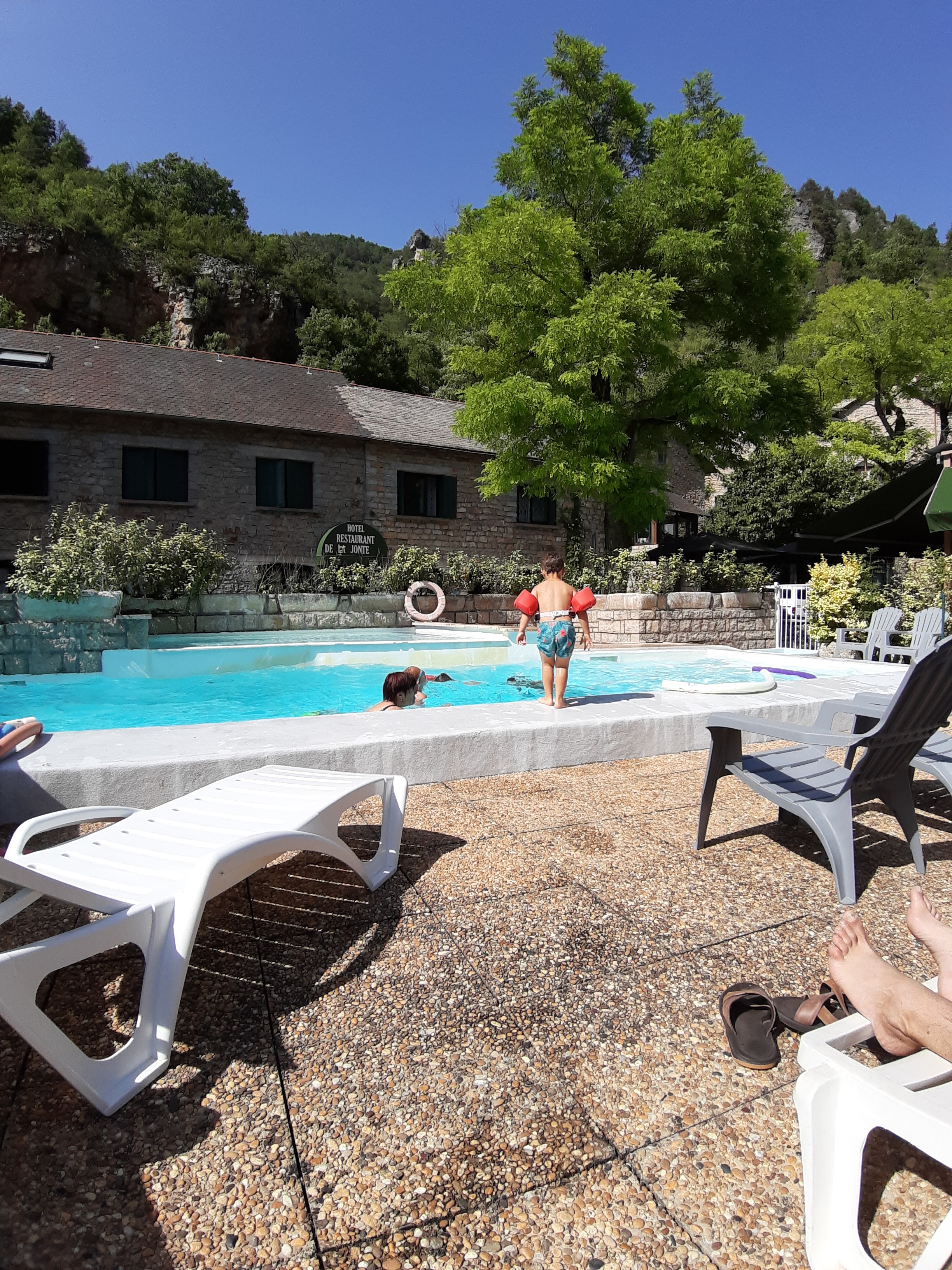 Whaou!!!! Hôtel simple et confortable ET avec piscine. Que dire du cadre... fantastique ! Dans les gorges de la Jonte, un petit hameau superbe. Le restaurant propose un menu spécial si vous séjournez dans l hôtel. Pratiquement que des produits locaux, des plats végétariens. Au menu 2 entrées, plat, dessert, café, vin. On revient le plus rapidement possible !