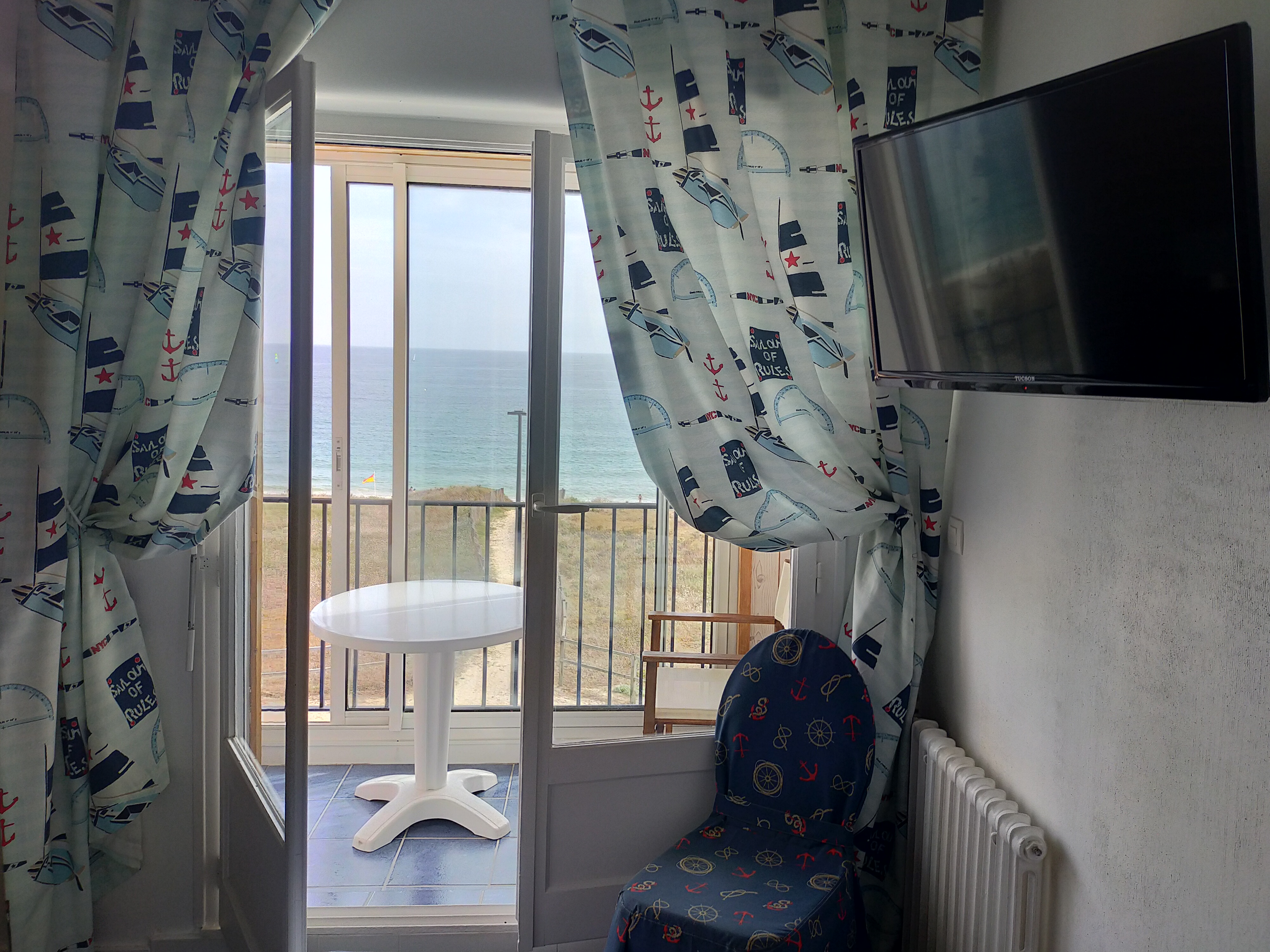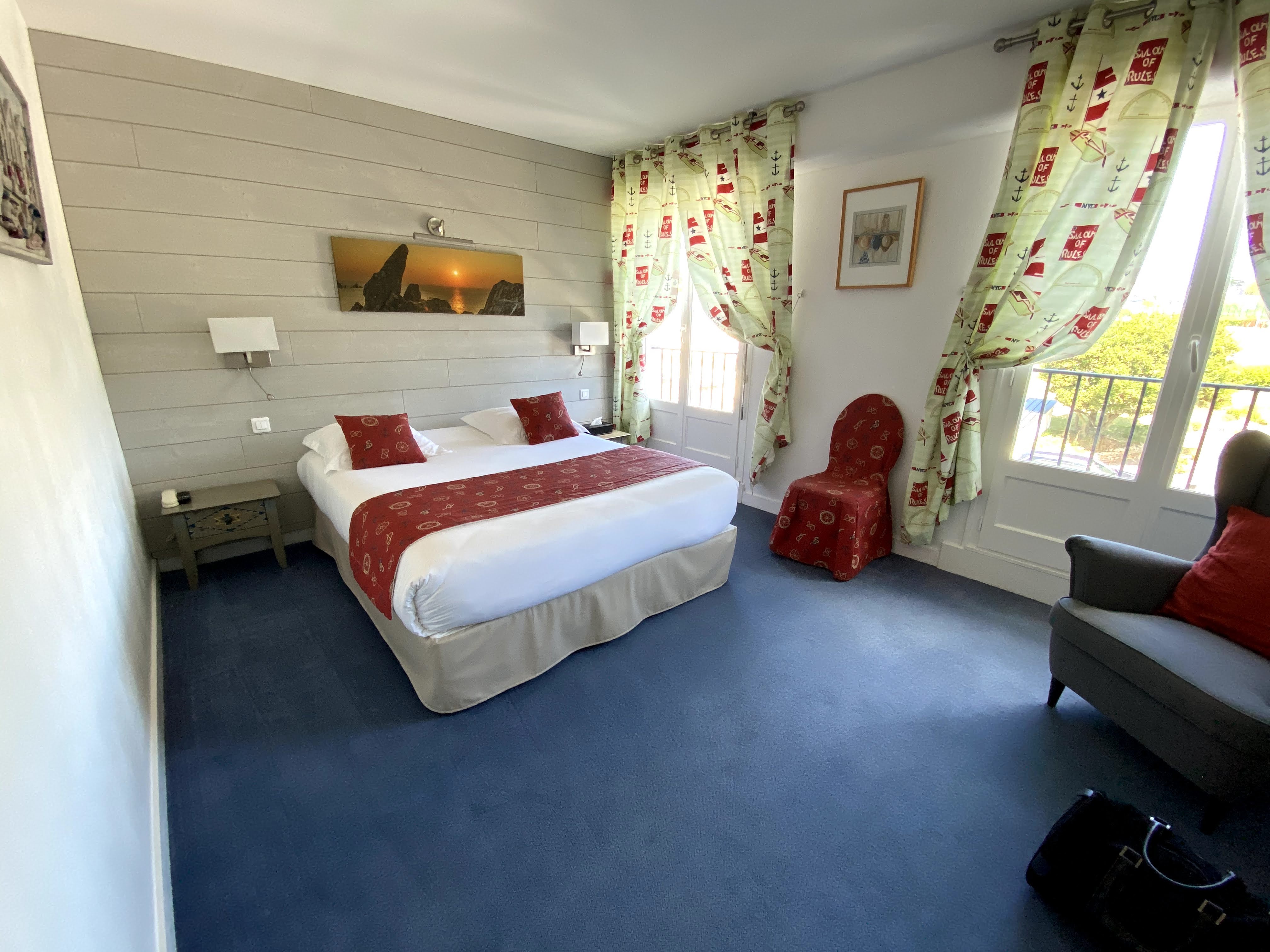 Nous avons réservé une chambre triple. Celle-ci était spacieuse, confortable et d'une propreté exemplaire. Bravo au personnel qui s'occupe de l'entretien. Tout l'hôtel est d'ailleurs extrêmement propre, c'est assez rare pour insister sur ce point. Le lit de 180x200 très confortable et le lit d'appoint(90) l'était également. Grande salle de bain. Hôtel très calme. 2 fenêtres dans la chambre avec vue sur l'océan, que du bonheur ! L'environnement est exceptionnel, je suis tombée amoureuse d'Audierne et des alentours(la pointe du raz, la baie des trépassés, c'est incroyable et de toute beauté). Je recommande cet hôtel +++