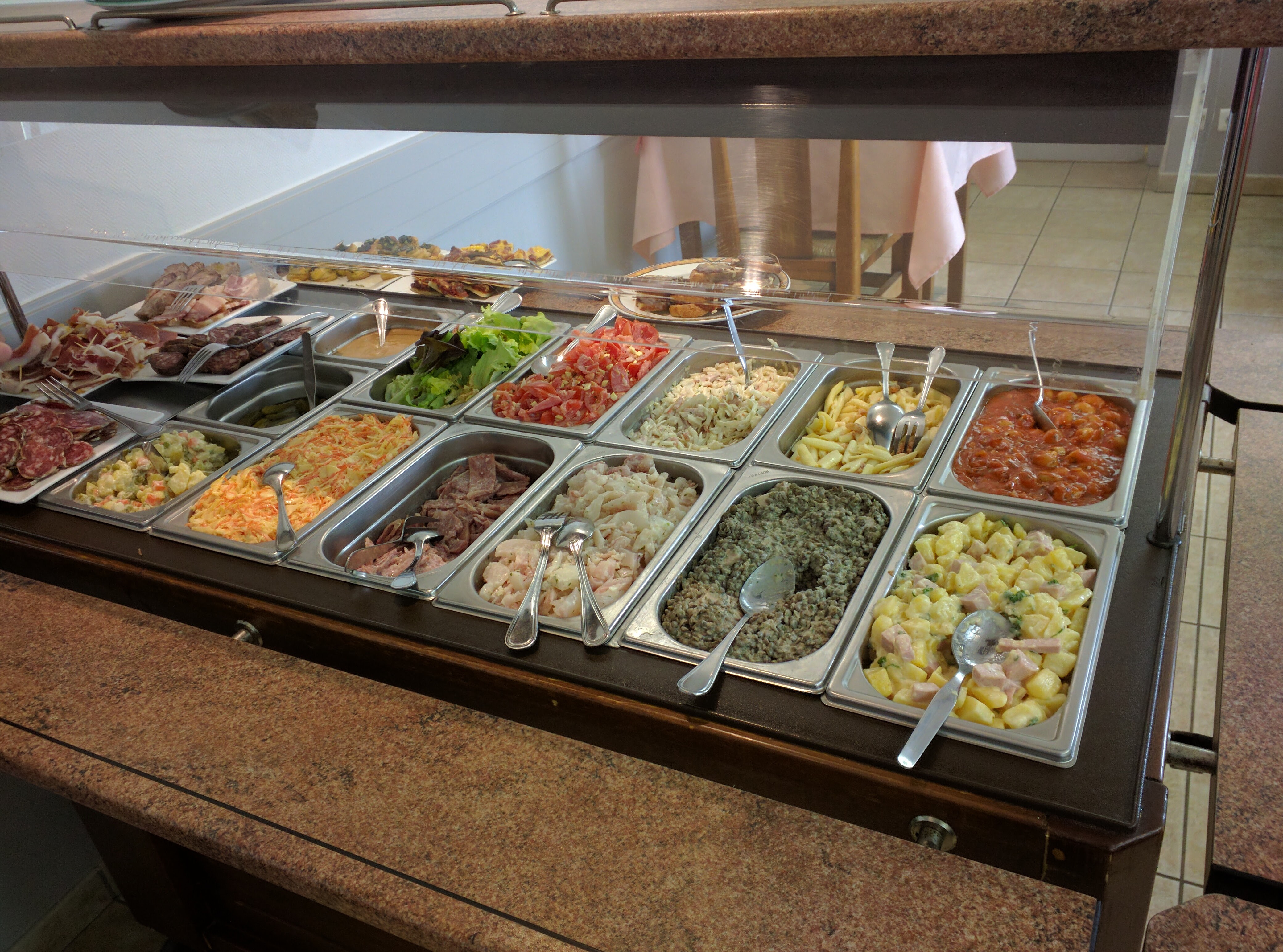 Bon accueil, buffet froid complet, très bien et pour 14 euros avec vin et café..bien quoi..
